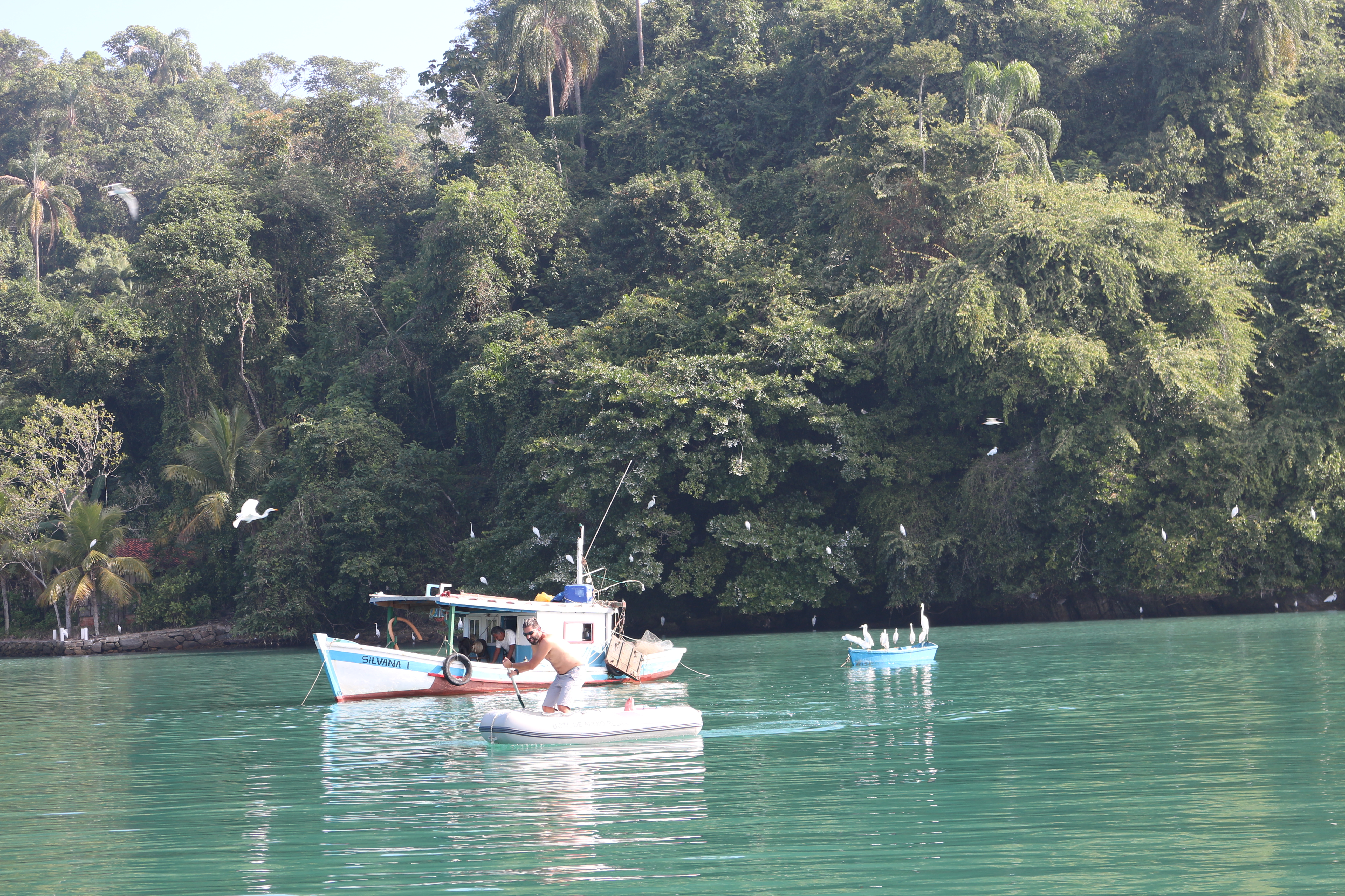 IMG_4198 IMG_4196ChIMG_4267egamos e aqui tem dois pontos para jogar ferro, ficamos na ancoragem de nordeste, uma prainha linda e onde ainda não havia outros barcos. O Renato mergulhou para supervisionar o casco e depois nos preparamos para um churras de entrecôte maturado que infelizmente ao abrirmos o vácuo já estava passada… A churrasqueira pronta, carvão queimando e então substituímos o churras por camarão fresquinho, comprado no barco do pescador e fizemos grelhado! Nada mal, descobrimos mais um jeito de comer camarão, já que adoramos.  Saímos com o bote para ver os lugarzinhos lindos e com muitos pássaros.