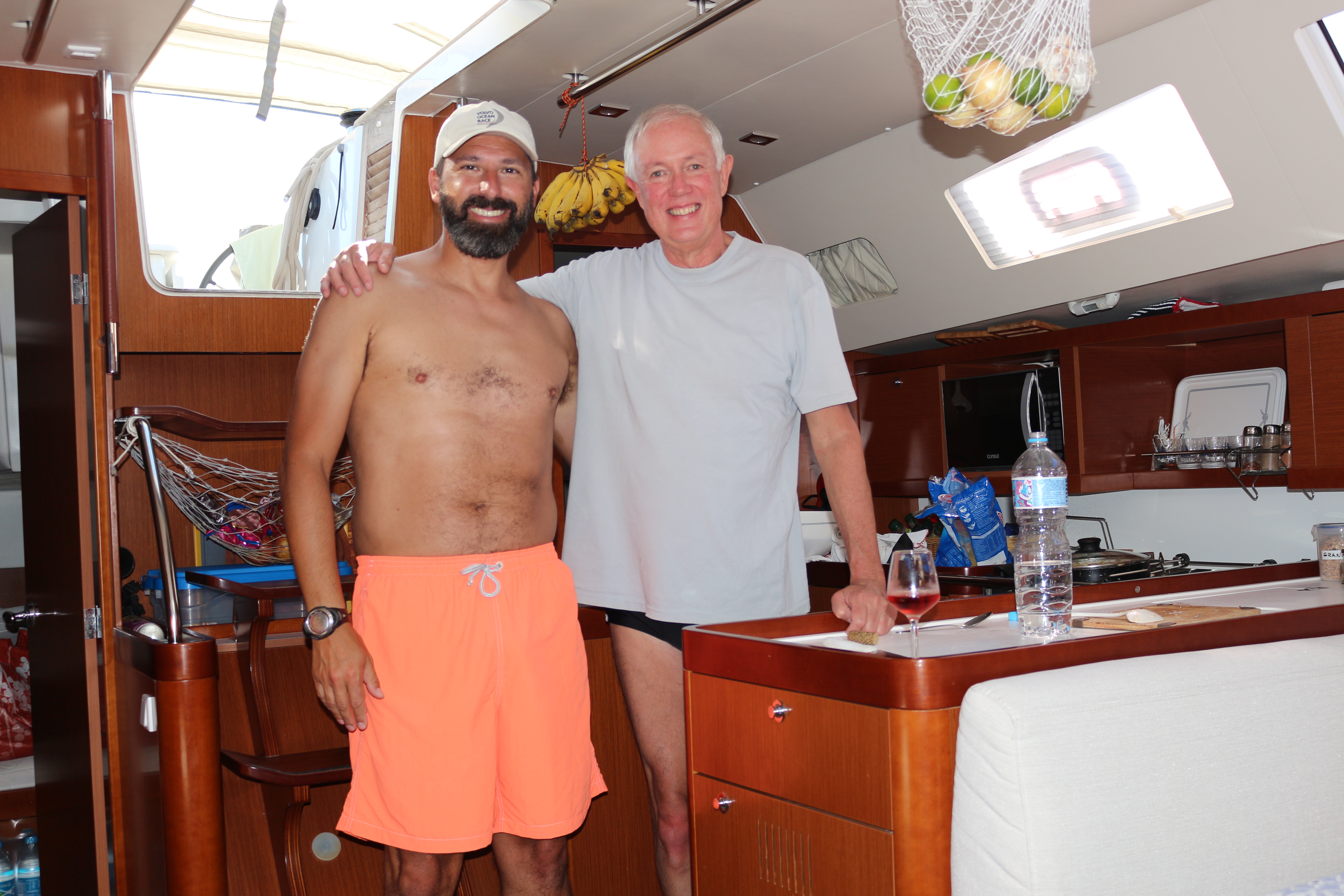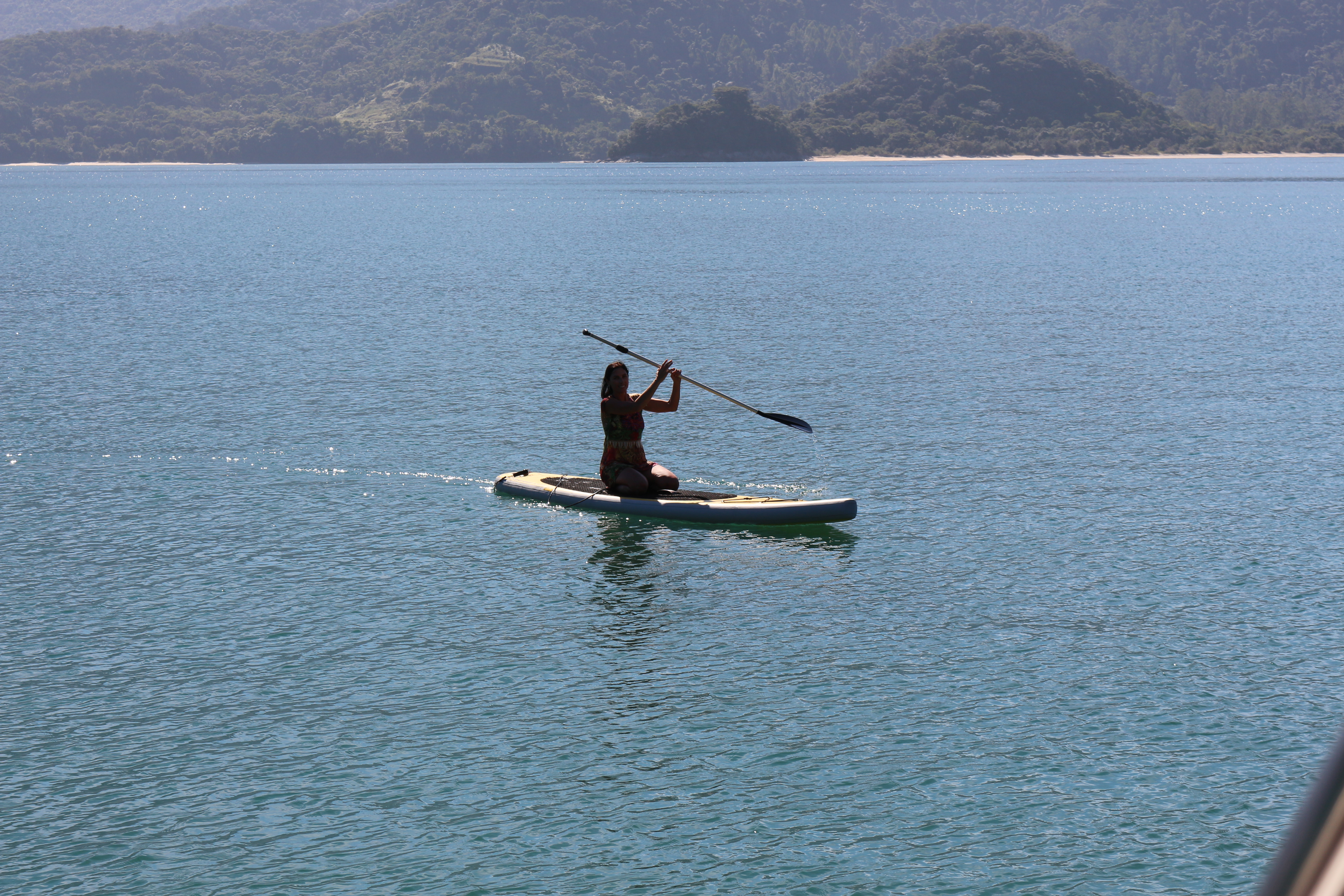 IMG_4210 IMG_4205 Na manhã seguinte descemos na praia e a Bella adorou, correu muito, brincou com as ondinhas e até correu atrás de uns abutres que estavam num dos cantos da praia. Aqui conhecemos o Herman, do veleiro Oceanware, um 50 pés, casco azul, muito bonito. Ele chegou de stand up e logo fizemos amizade. Nos ensinou a pegar vôngoles na praia, mas tentamos e não haviam muitos para três refeiçoes. Assim,aceitamos a sugestão dele de fazer um camarão, prá lá de especial, comprado do pescador na hora, e que ele preparou de forma fantástica e serviu com um vinho rose, muito saboroso! Após o almoço, gentilmente nos ofereceu seu stand up para brincarmos e assim passamos horas maravilhosas em sua companhia! Na manhã seguinte, terça, saímos rumo à marina, com sol forte e novamente apreciando as paisagens do percurso. Desde que chegamos aqui não choveu e tem dado muito sol, tudo de bom!