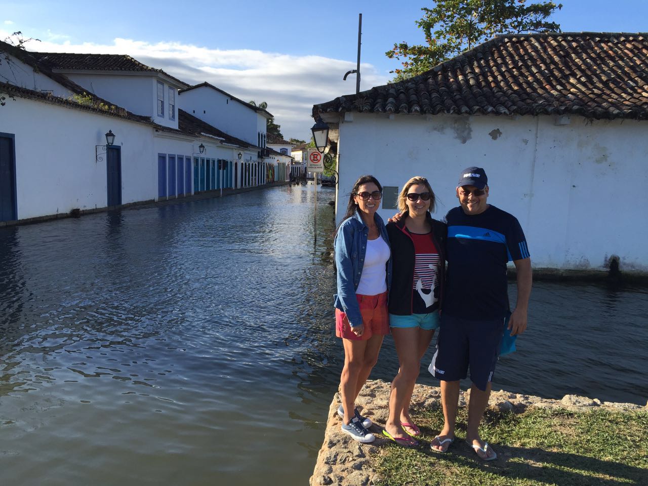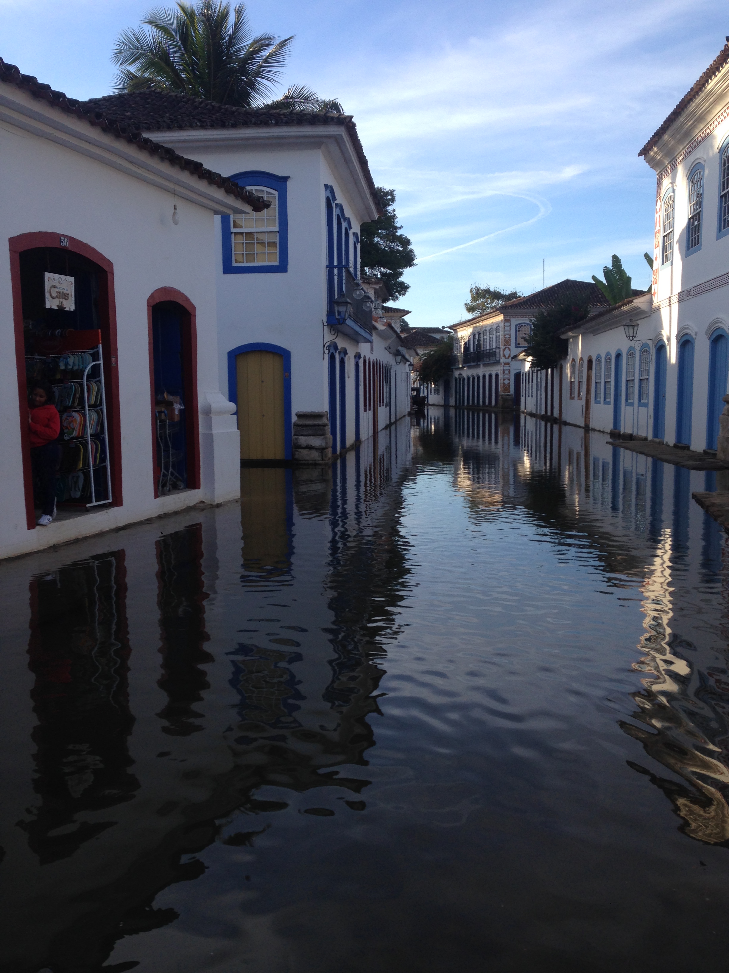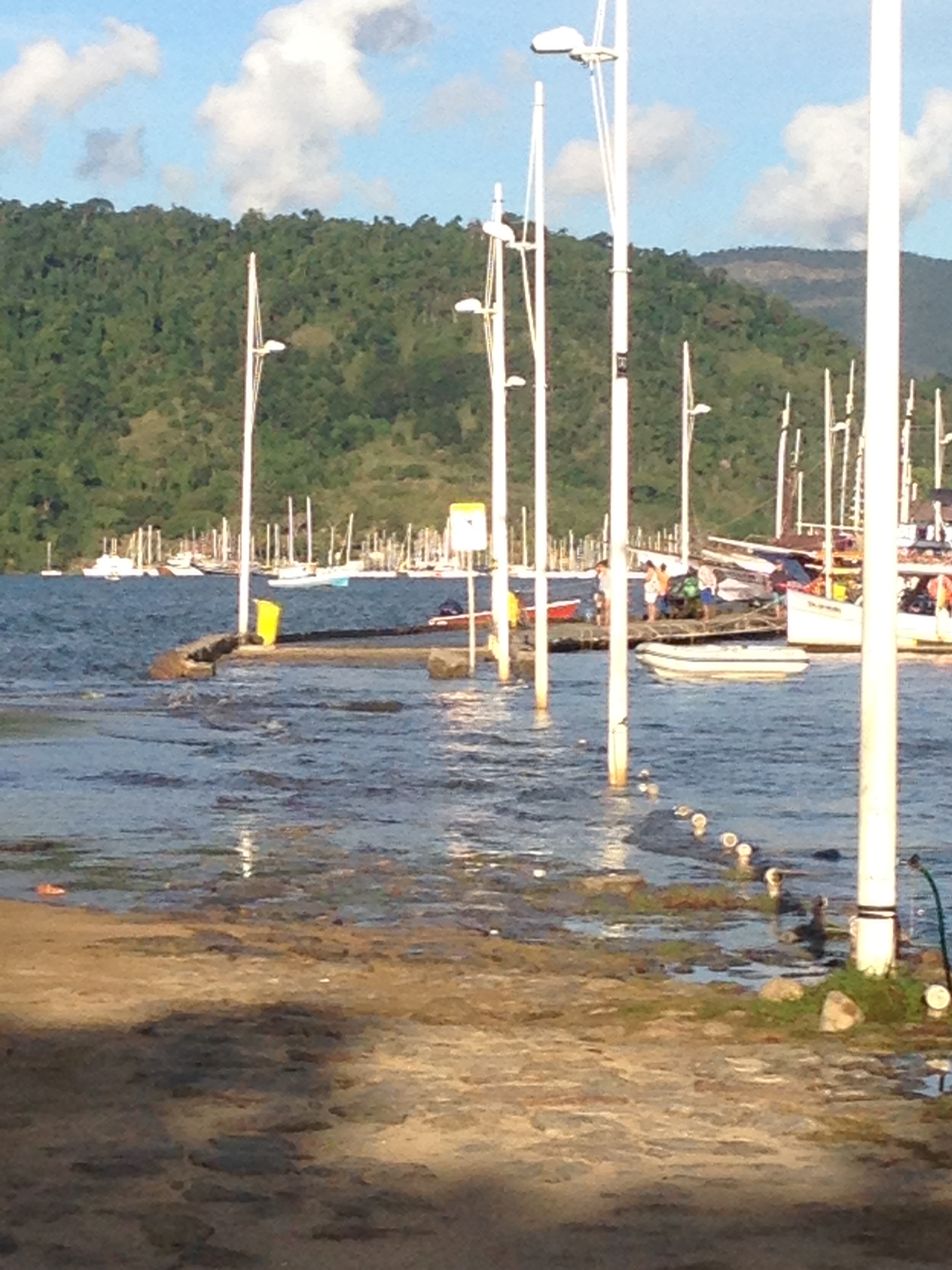 Sexta seria um dia tranquilo, teríamos somente que abastecer e instalar o amperímetro… Porém a faina comecou cedo… Lá penas 9h o Renato abriu os paióis, pois escutou a bomba trabalhando a noite e eles eatavam com água doce… Começou uma busca pelo possível vazamento. Esvaziamos os armários por onde passa a água doce, secamos tudo e nada. Chamamos o Andre, do Zefiro, para ver se o vazamento era na ducha do convés, pois ele consegue “se infiltrar” em lugares com pouco espaço. Também não detectou vazamento… Poderia ser água acumulada no contra-casco em função da lavagem do barco?! O Renato percebeu uma fissura num dos tanques de água e foi comprar massa epóxi subaquática que se aplica sem precisar esvaziar o tanque e esperou para ver se realmente era esta a causa… Eu fui pra cidade, onde peguei maré alta e só consegui ir ao centro tirando o tênis, por mais de uma vez… Em compensação o visual de lá fica super lindo quando a maré sobe!