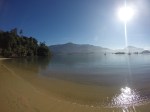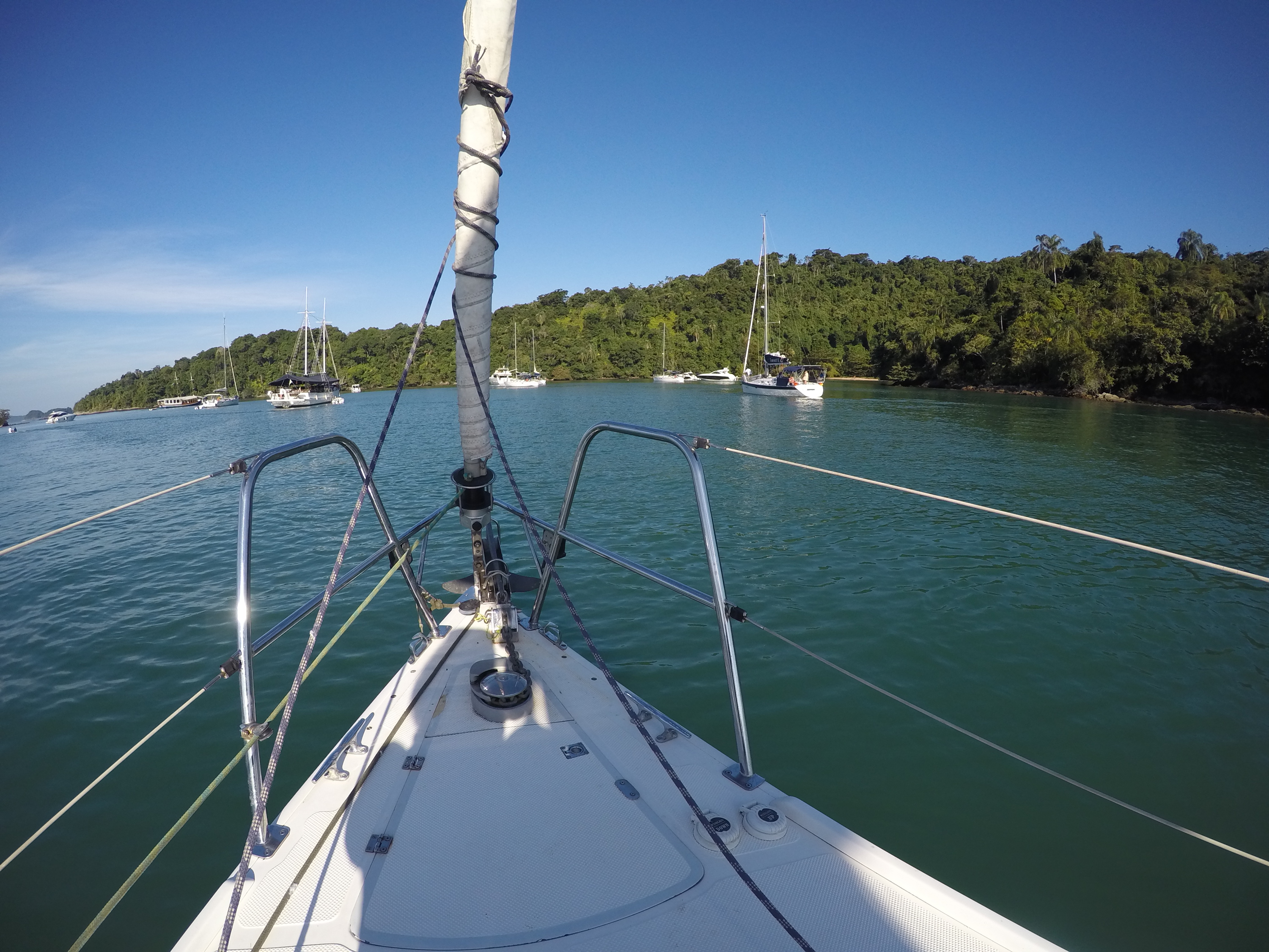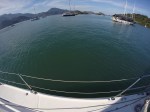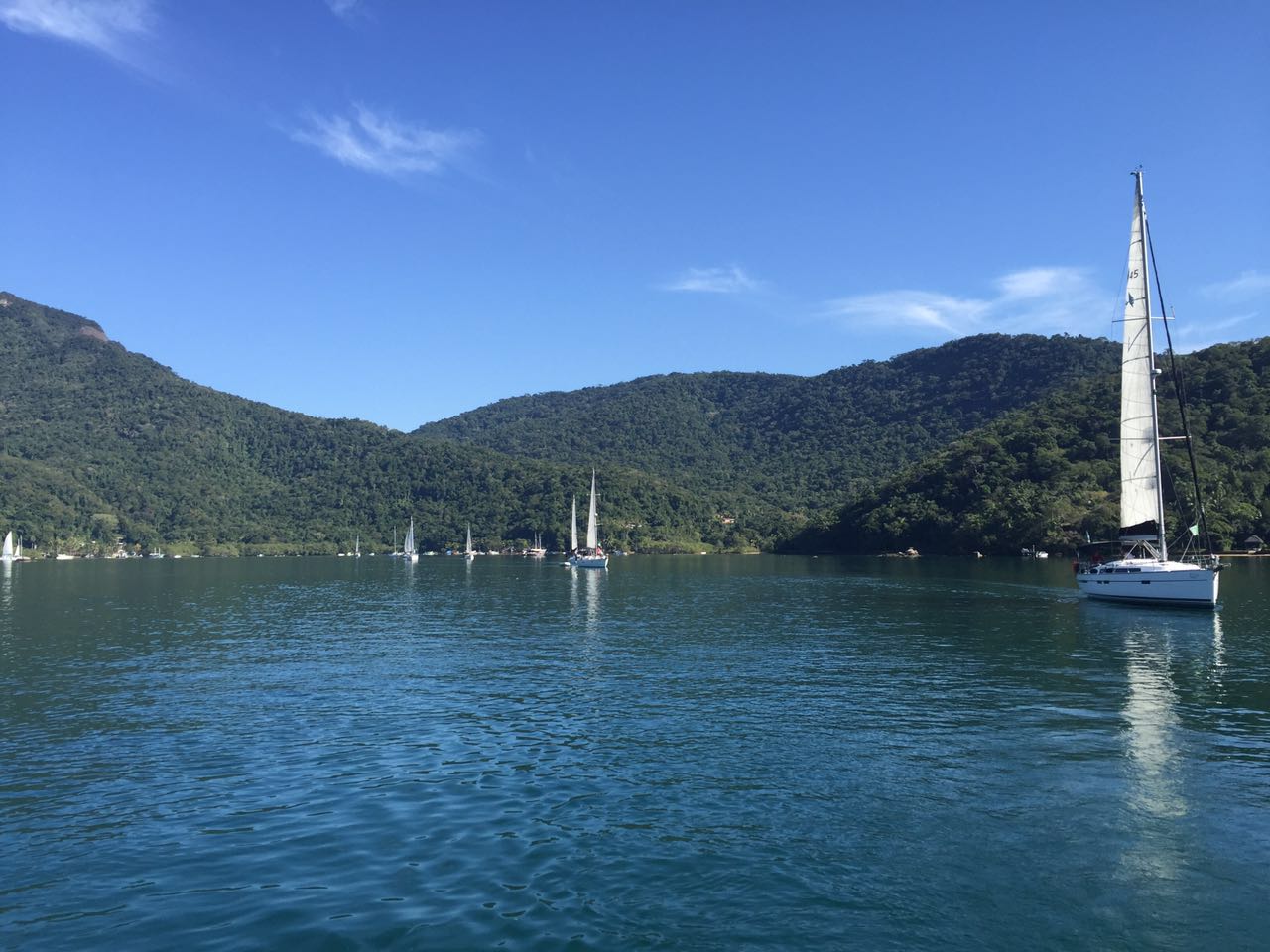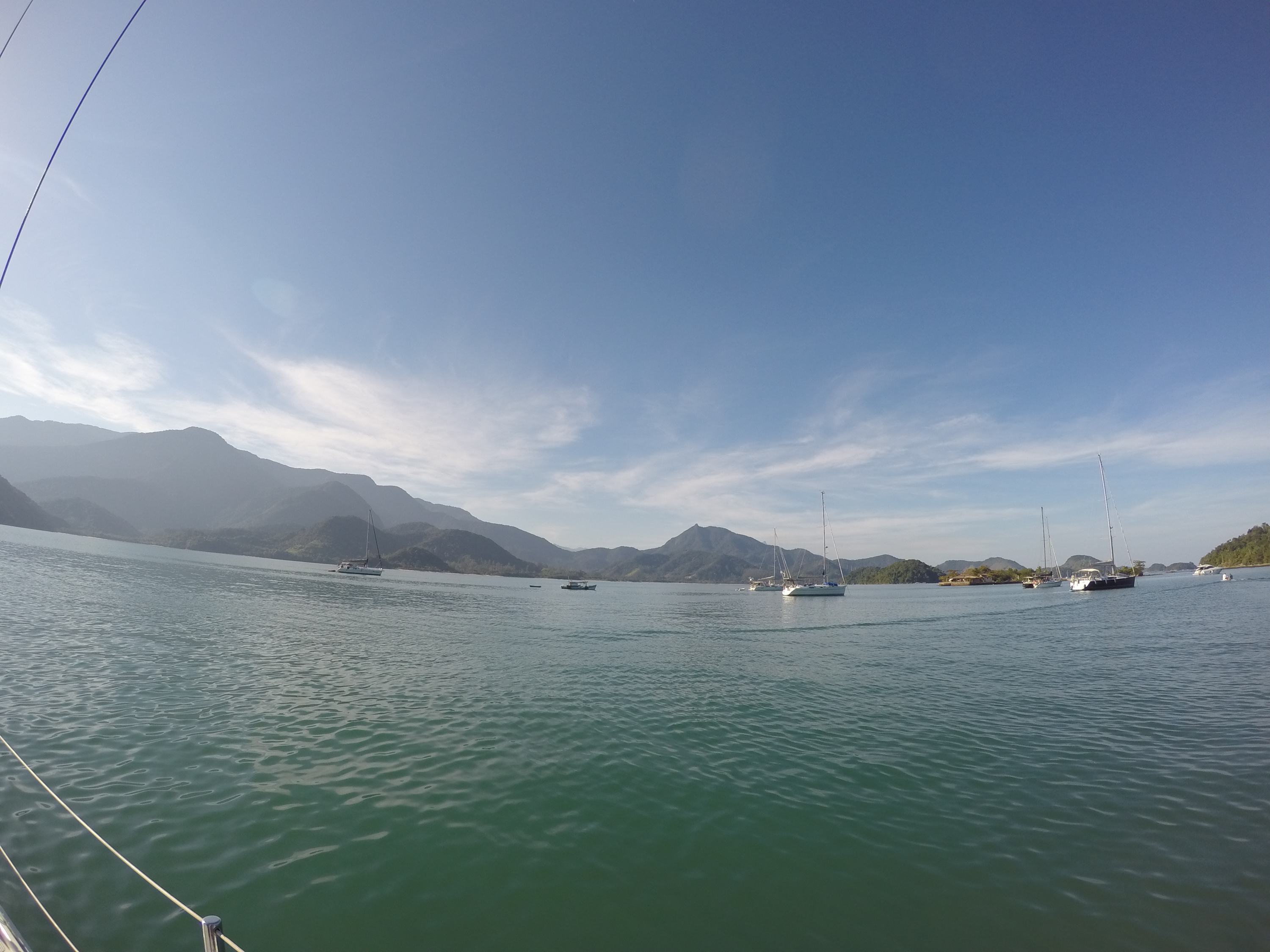 Domingo saímos rumo ao Saco do Céu, que o Pádua e a Lili já tinham nos falado da beleza e do céu refletido na água calma à noite. Lugar muito abrigado e com linda vegetação. Desde que chegamos há 20 dias, ainda não choveu e os dias tem sido muito ensolarados. Ao chegarmos no Saco do Céu o Renato ouviu o Roberto do Velela dizer: a água tá uma delícia… me disse: vou cair na água! só que a água estava muito gelada e acabaram por subir rapidamente a bordo, o Henrique e a Natascha, do Velela, para um esquenta com um gole da boa Cataia. Chamamos o Grão para almoçarmos juntos e a noite desembarcamos no Restaurante Coqueiro para a Reunião dos Comandantes, para um briefing da escala, detalhes, meteorologia, comunicação, etc. Também foi feita a entrega do kit do Cruzeiro Costa Verde (bolsa, boné, crachá e toalha) e conhecemos a Miriam e o Weber, do veleiro Caiuã – há 18 anos vivendo a bordo na costa brasileira e o Fernando e a Miriam, do veleiro Fé, que também moram a bordo. O Wiliam trouxe o vinho e confraternizamos também com a Natasha, o Henrique e o Roberto do Velela. Dia perfeito!