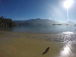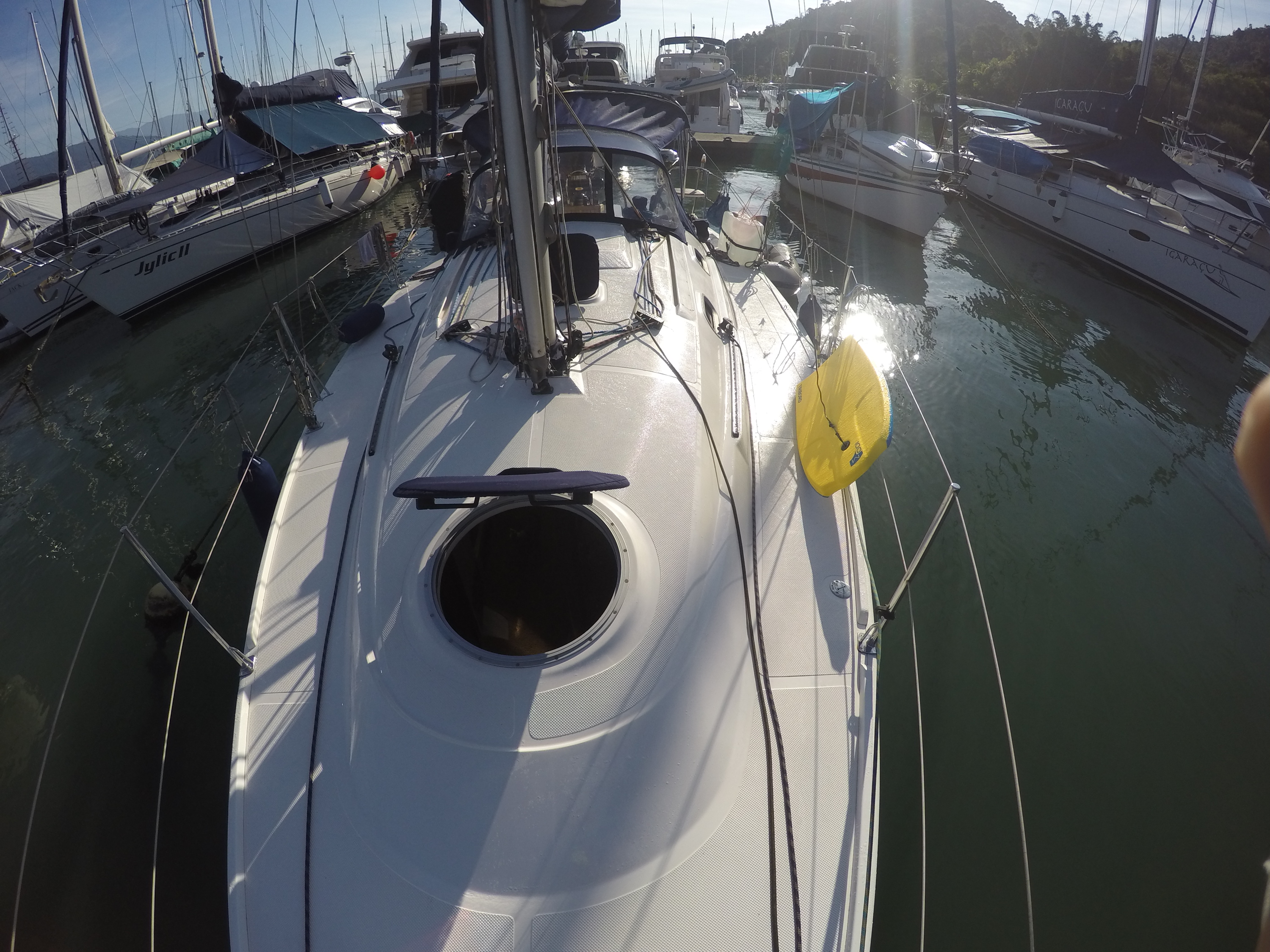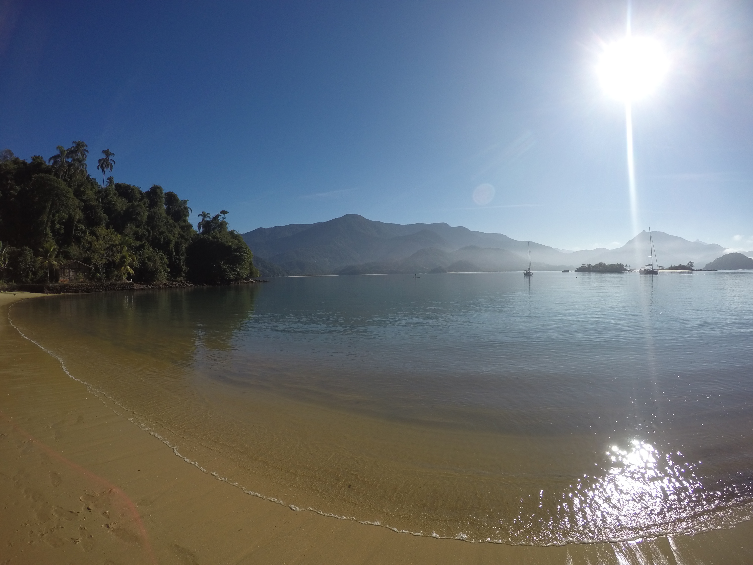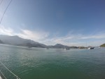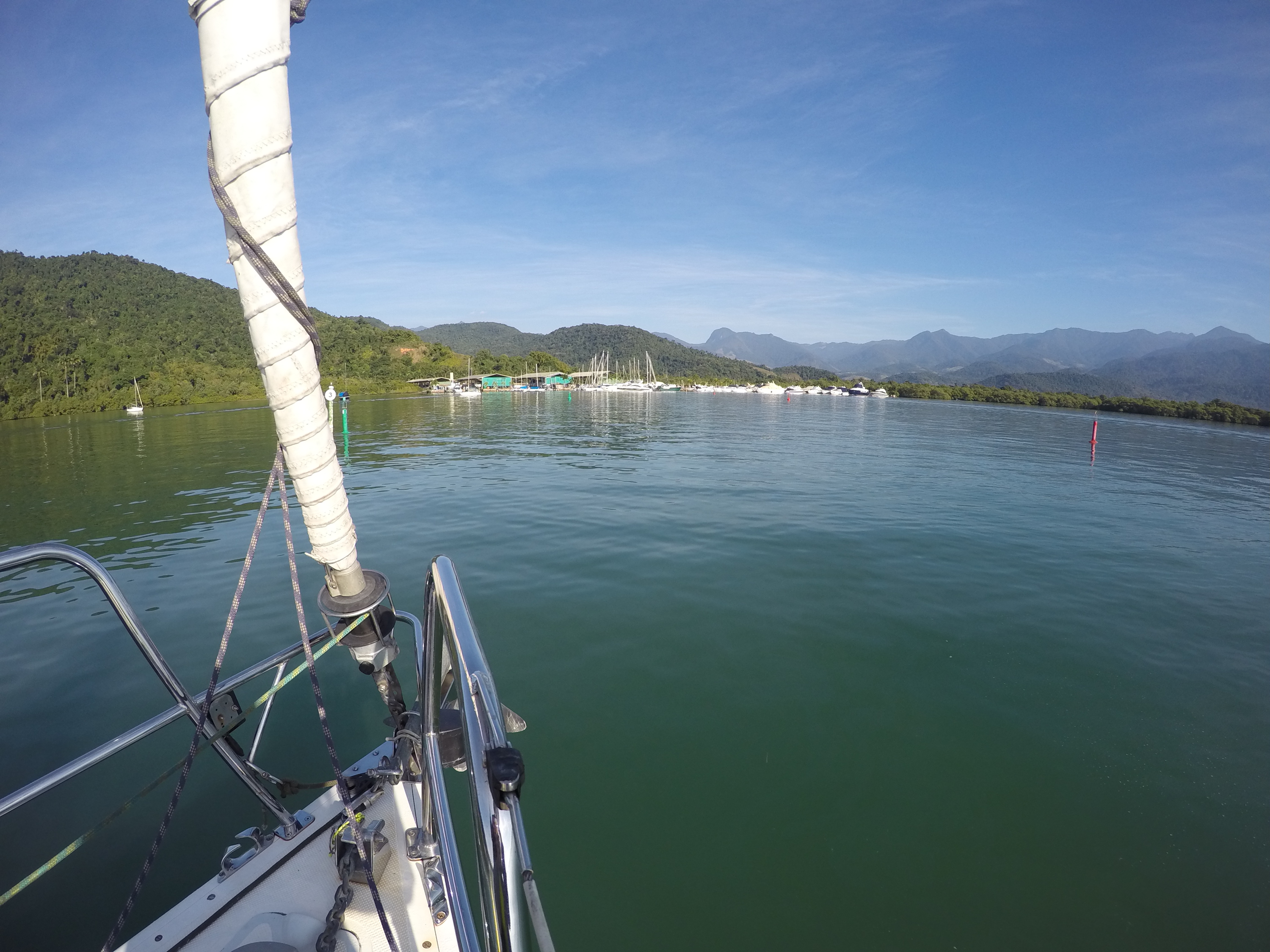 Domingo saímos rumo ao Saco do Céu, que o Pádua e a Lili já tinham nos falado da beleza e do céu refletido na água calma à noite. Lugar muito abrigado e com linda vegetação. Desde que chegamos há 20 dias, ainda não choveu e os dias tem sido muito ensolarados. Ao chegarmos no Saco do Céu o Renato ouviu o Roberto do Velela dizer: a água tá uma delícia… me disse: vou cair na água! só que a água estava muito gelada e acabaram por subir rapidamente a bordo, o Henrique e a Natascha, do Velela, para um esquenta com um gole da boa Cataia. Chamamos o Grão para almoçarmos juntos e a noite desembarcamos no Restaurante Coqueiro para a Reunião dos Comandantes, para um briefing da escala, detalhes, meteorologia, comunicação, etc. Também foi feita a entrega do kit do Cruzeiro Costa Verde (bolsa, boné, crachá e toalha) e conhecemos a Miriam e o Weber, do veleiro Caiuã – há 18 anos vivendo a bordo na costa brasileira e o Fernando e a Miriam, do veleiro Fé, que também moram a bordo. O Wiliam trouxe o vinho e confraternizamos também com a Natasha, o Henrique e o Roberto do Velela. Dia perfeito!
