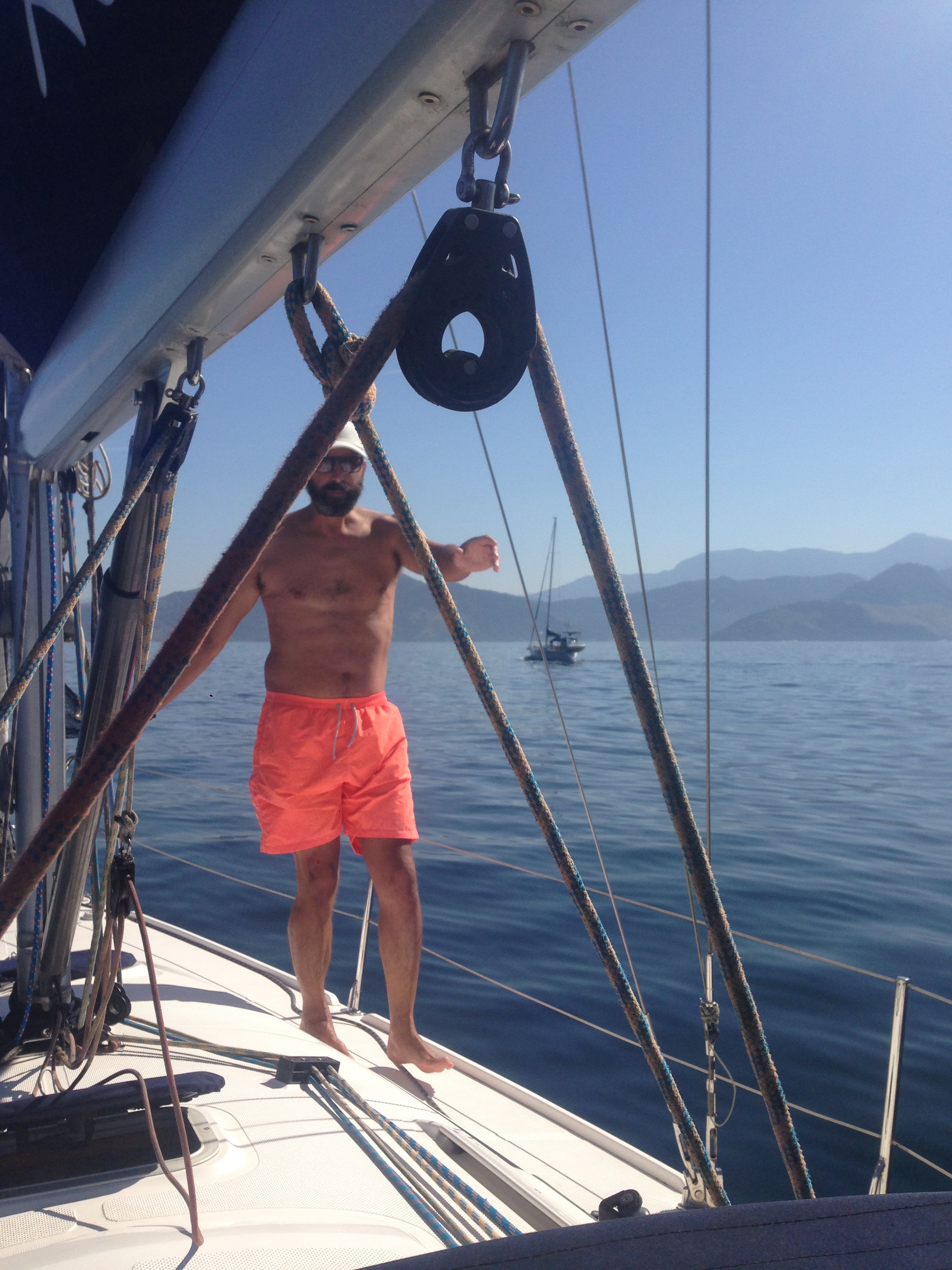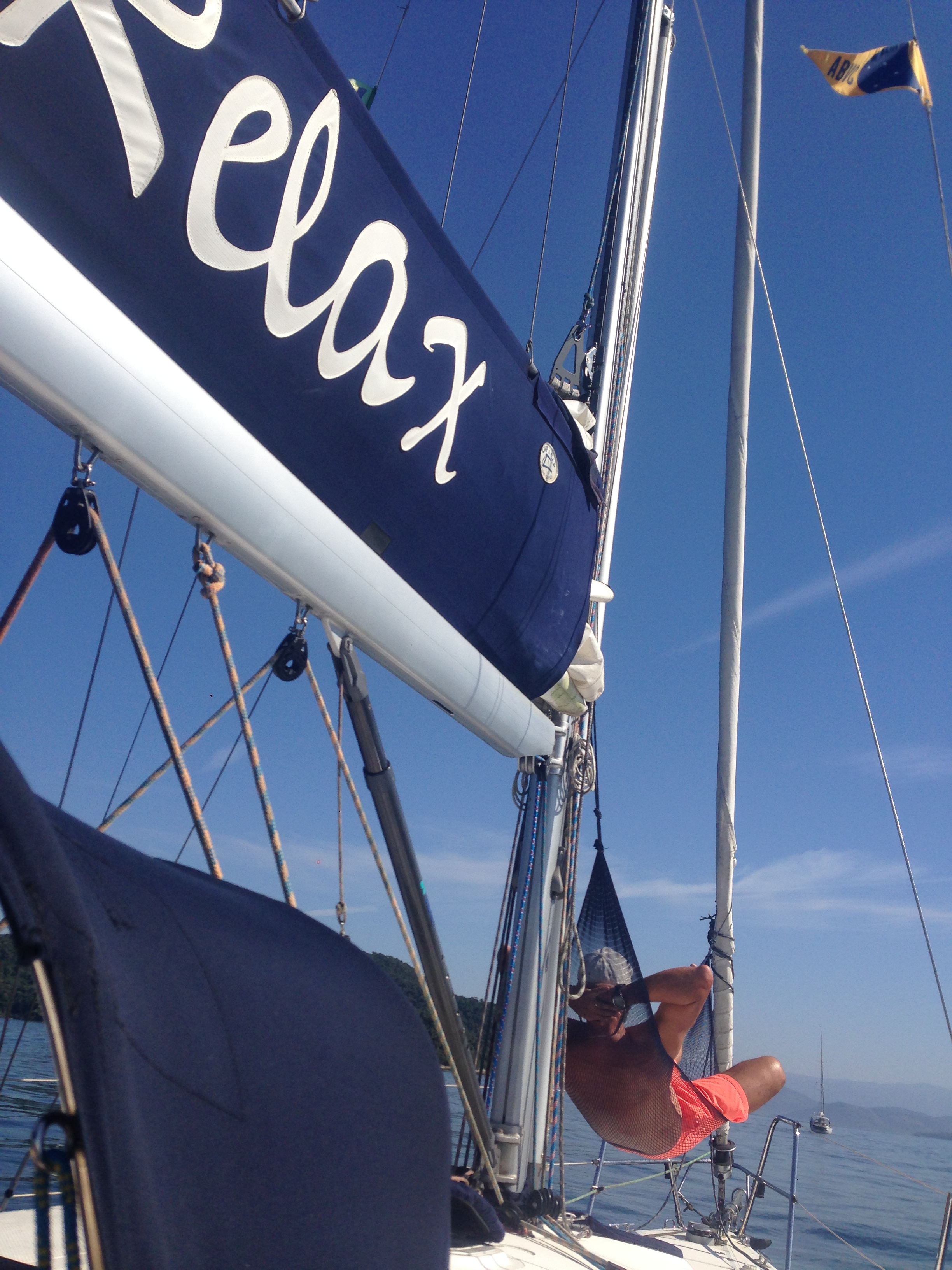 Sábado pela manhã o vento entrou e tudo começou a voar… já perdi um top que estava penduradinho no guarda-mancebo… neste ponto alguns veleiros já se despediram e rumaram para Angra, Paraty, etc. O percurso do Abraão ao Bracuhy, último trecho do Cruzeiro, foi com vento de 18, 22 knots e com rajadas de 25… arrumei tudo no interior do barco para não deslocar os objetos, peguei a Bella e ficamos no cokpit com o Renato. Chegamos ao Bracuhy, o Renato já bateu uma água doce na parte externa do barco e eu preparei almoço para os convidados Miriam e Webber, do Acauã, afinal eles fizeram vários churrascos e outras gostosuras para a flotilha durante todo o percurso e assim queríamos retribuir um pouco à eles. A noite, todos se reuniram no Bowteco, da Marina Bracuhy e rolou uma noite árabe, com muita comida e diversão. O Eduardo, do Regwell, fez encerramento e agradecimento a todos, em especial àqueles que auxiliaram na organização e nas tarefas do Cruzeiro.