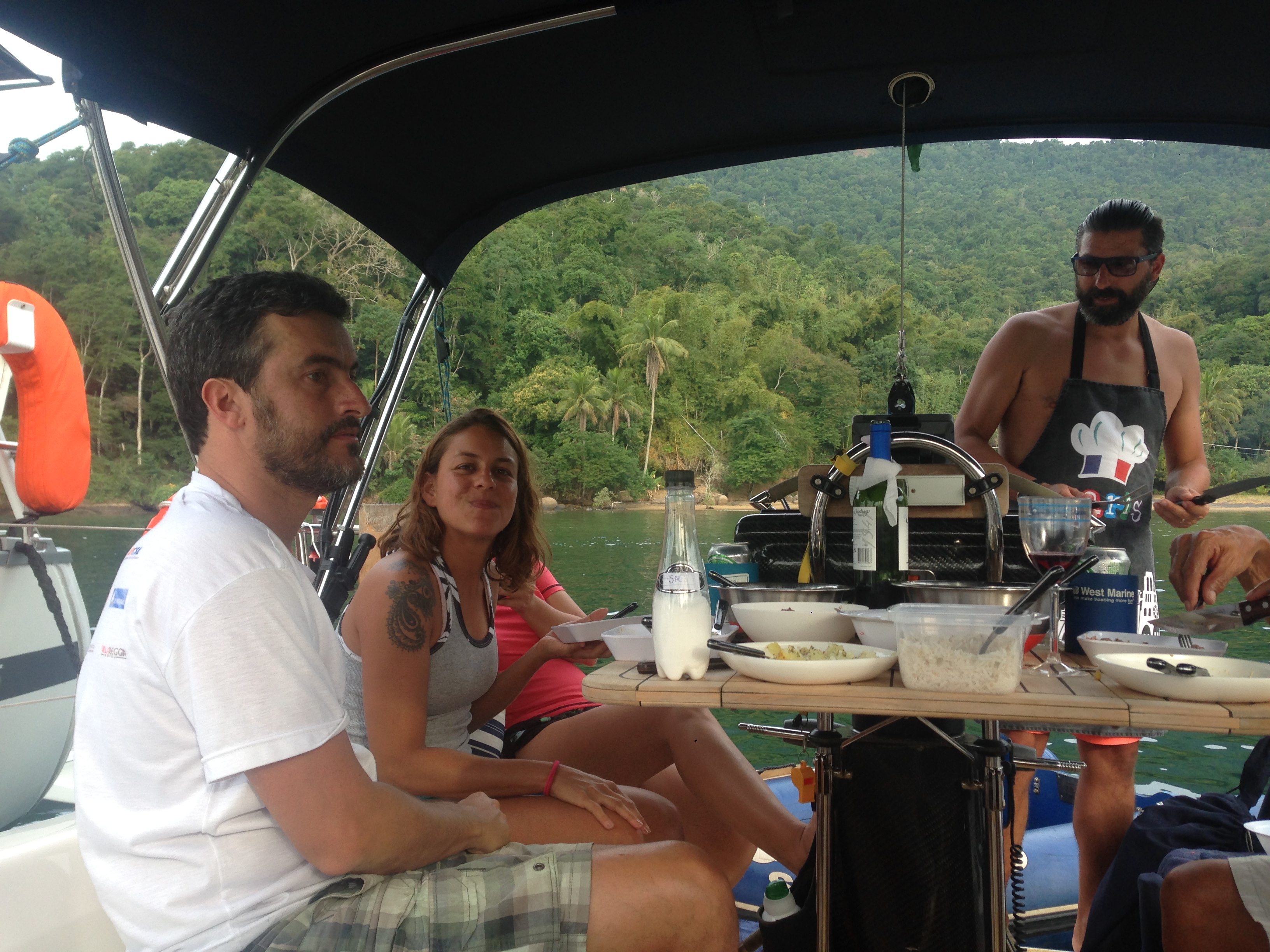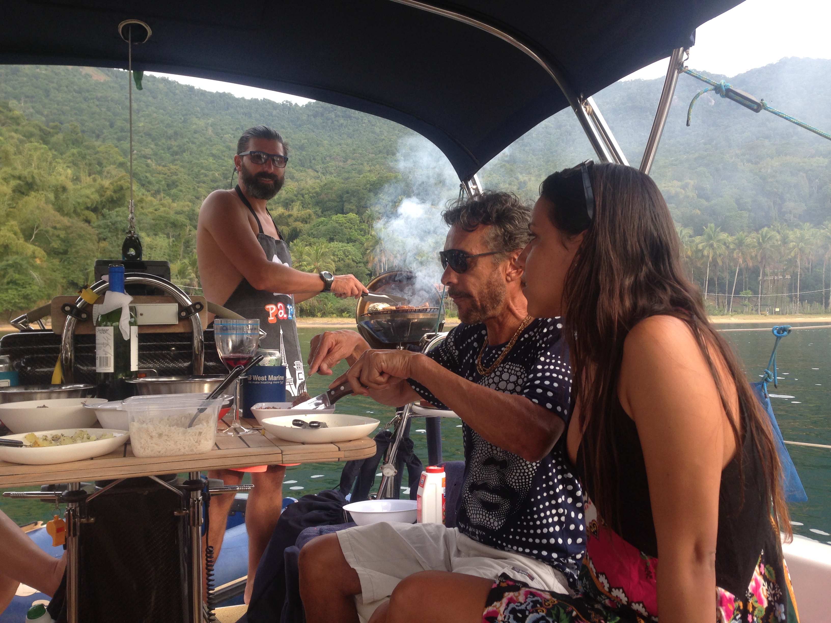 Chegamos na praia da Tapera, jogamos âncora com 9 metros de profundidade e 30 de corrente, pulamos na água de snorkel, eu para curtir o mergulho e o Renato para passar a espátula no casco e logo subimos para ancorar novamente, pois a correnteza estava deslocando muito o barco em direção à praia. Fizemos um churrasco no barco e convidamos o pessoal dos veleiros Fé, Grão e Lua Viva. O Renato a caráter, com seu avental, nos serviu e tivemos um ótimo almoço. Final do dia fomos para a praia, pois tinha mais churrasco com a Miriam e o Webber,do Acauã, assadores oficiais do Cruzeiro. Teve fogueira, violão e ficamos até tarde no bate-papo, muito bom! Retornamos ao barco e ancoramos mais próximo ao flutuante, como recomendou o Pádua e dormimos bem.