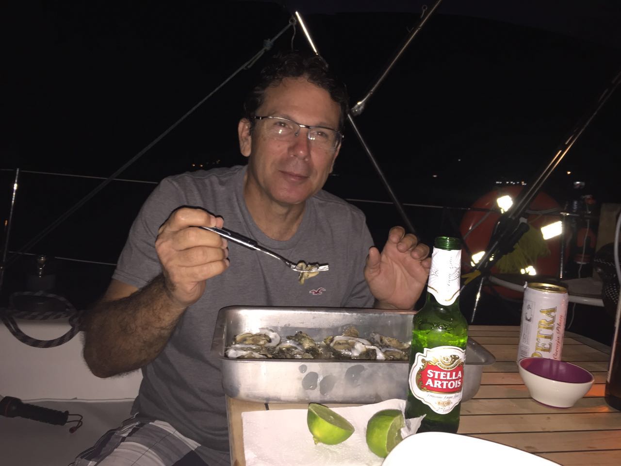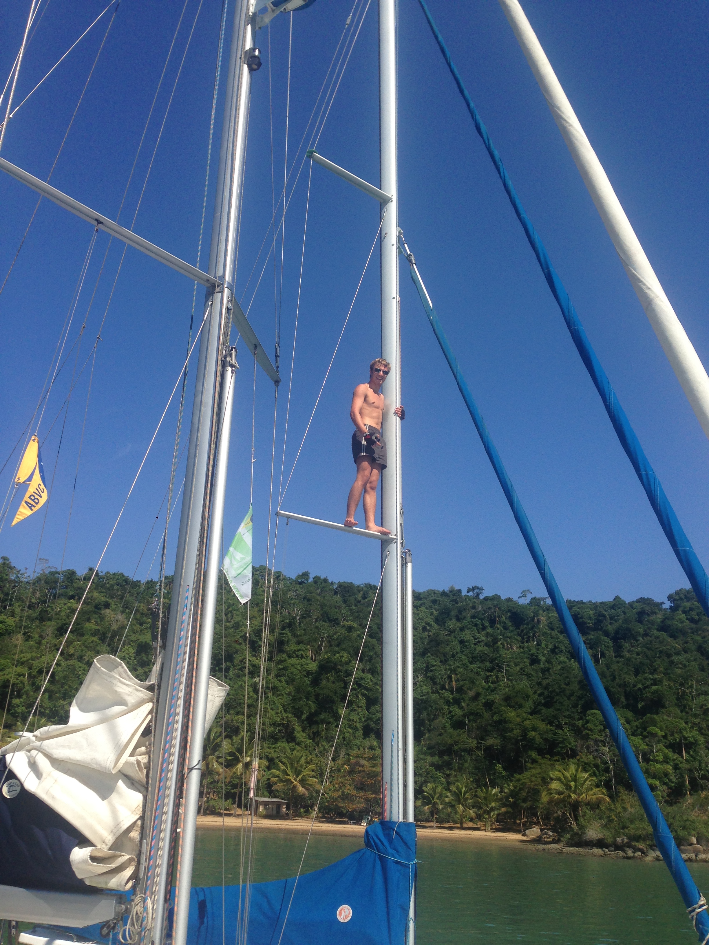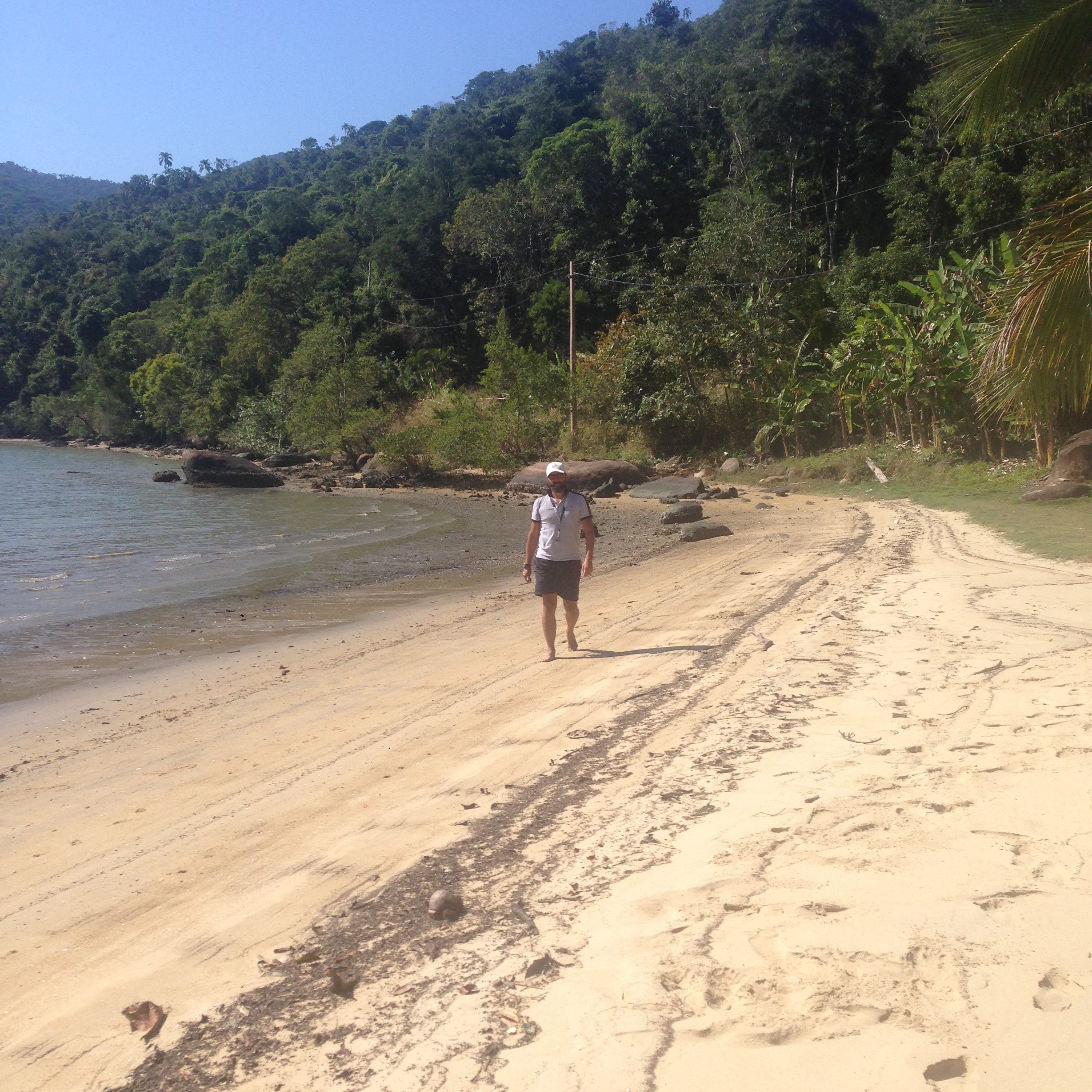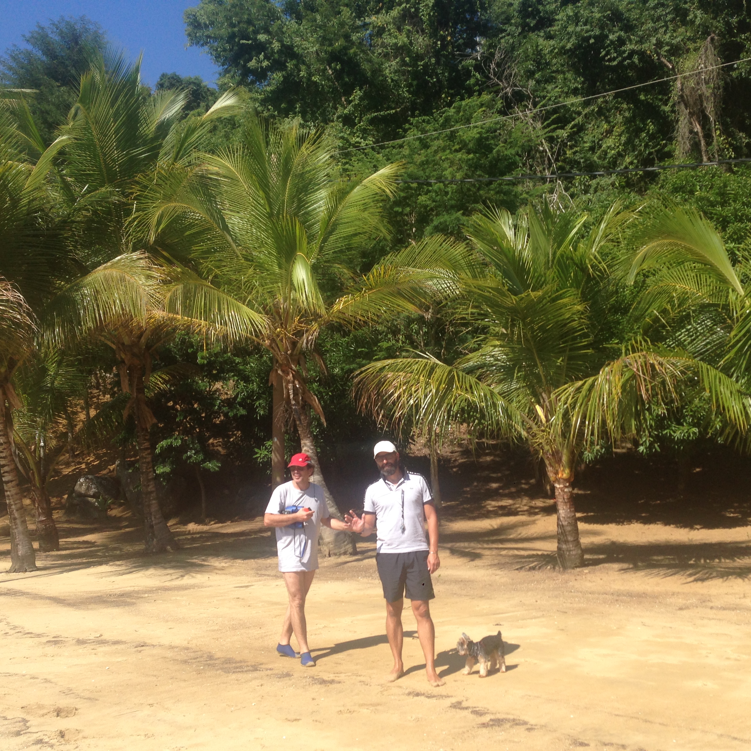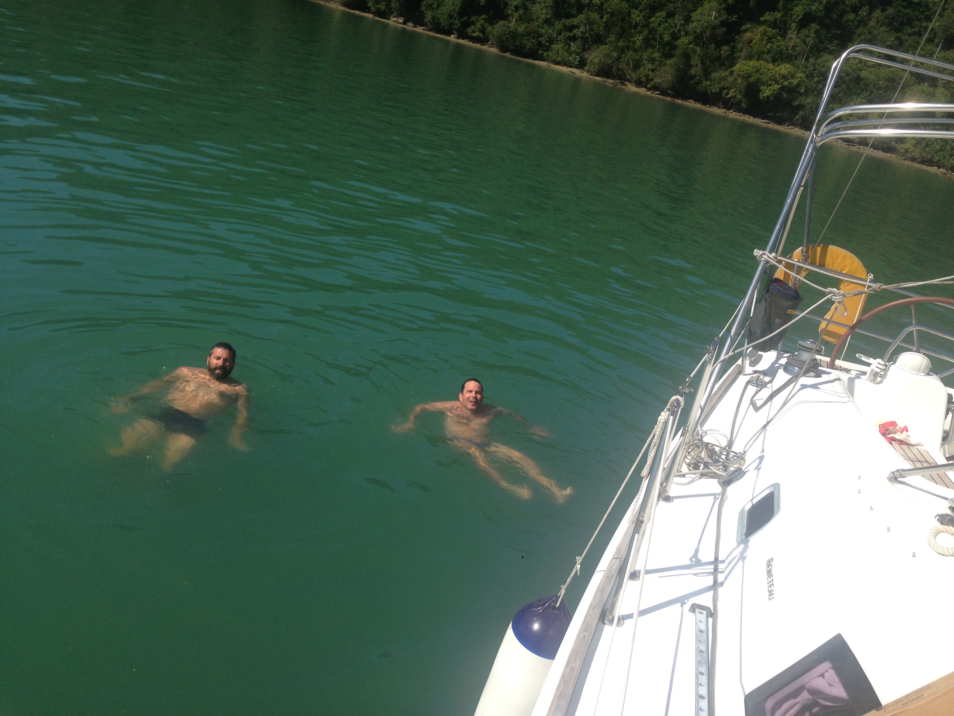 Chegou o Domingo (24) e saímos rumo ao Mamanguá, local bem conhecido e visitado. Ancoramos e em seguida descemos de bote para visitar uma cachoeira, não sabíamos ao certo onde era, mas pedindo informação (depois de descer em um local com fundo de lodo kkk), vimos que teríamos que ir na maré cheia para ter acesso, assim, deixamos para outra oportunidade. Retornamos e descemos na praia. Quase todas as prainhas tem placa de sinalização de propriedade particular, porém sabemos que o acesso é livre à praia, que sendo território marítimo, pertence à União. Andamos bastante e corremos com a Bella. Eu apanhei 2 cocos que haviam caído e o Renato não gostou nadinha de levá-los pro barco kkk. Fizemos um churrasco no almoço com a companhia do Flávio, do Gott e do André. Apareceu um pescador oferecendo frutos do mar e encomendamos ostras e peixe. Ele trouxe ostras e camarão bem fresquinho. O Zéfiro se despediu e nós fomos logo depois para pernoitar na prainha do Bom Jardim. Local com infraestrutura que tem um heliponto. Mar e noite tranquilos. O Fávio degustou as ostras e eu fiz um receita de Camarão ao ninho, que aprendi com o Herman, veleiro Oceanware. Creio que acertei a receita pois não sobrou nada kkk.