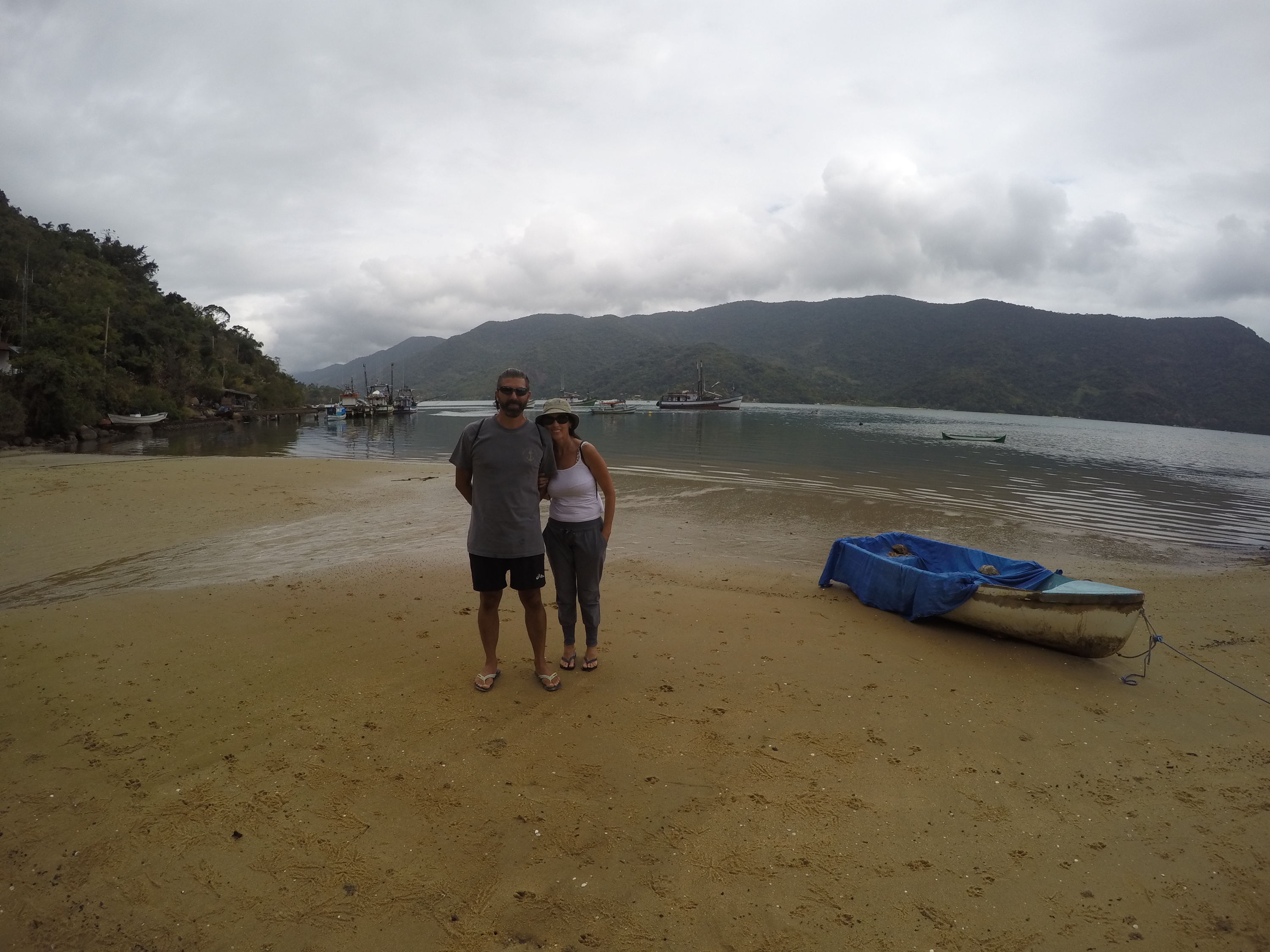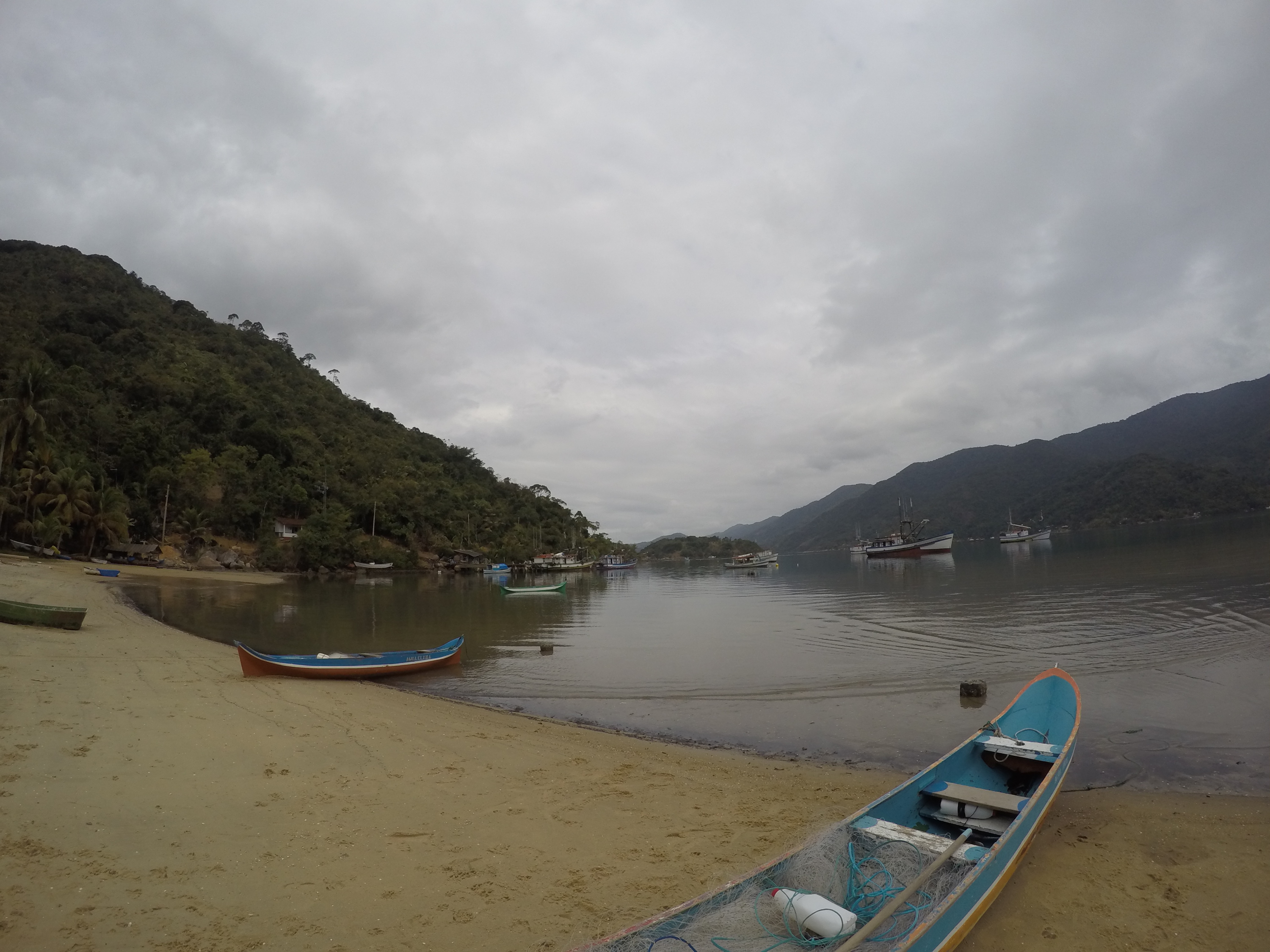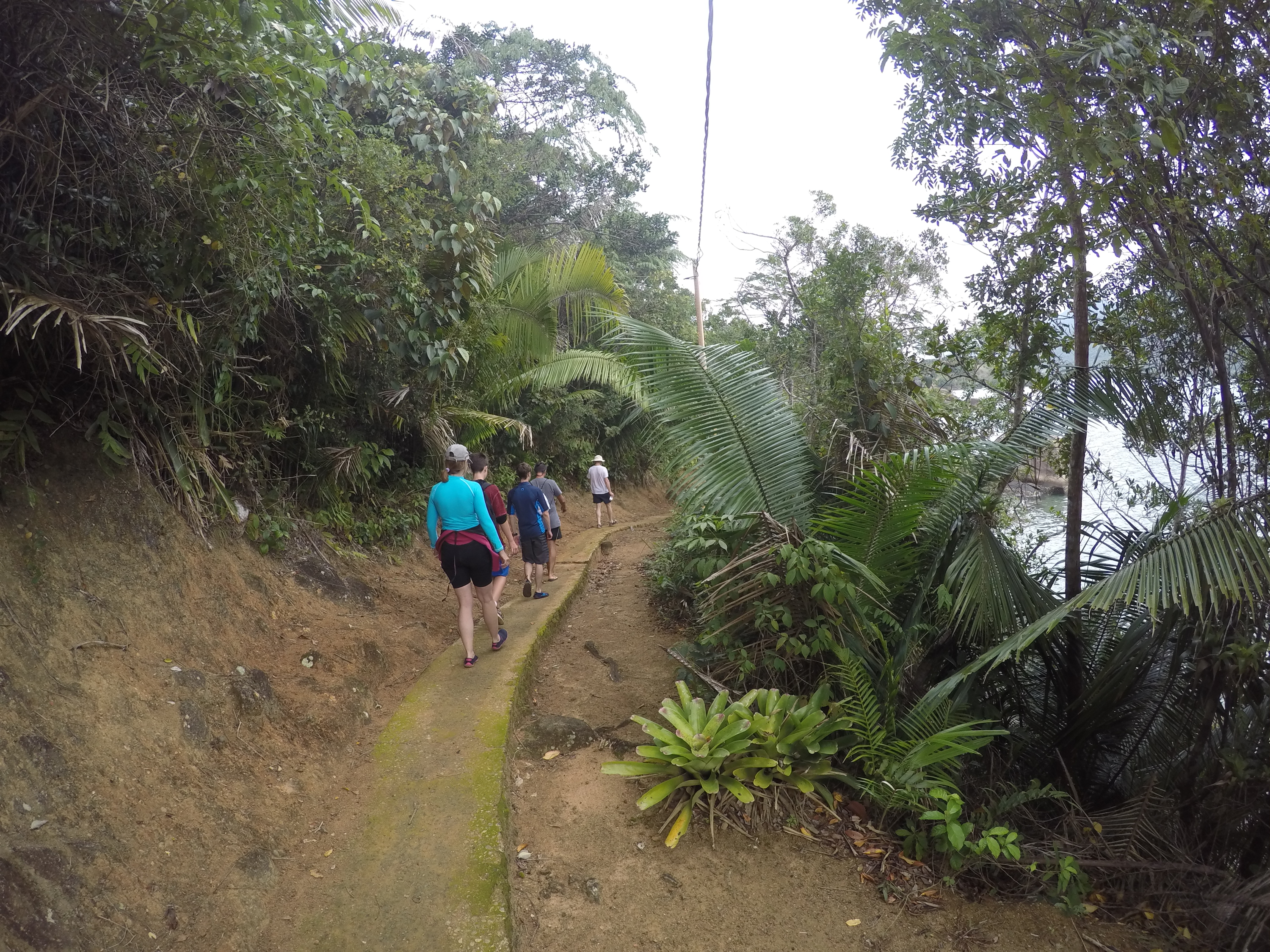 bem distantes da cachoeira. Retornamos, andamos e andamos, pedimos informação e andamos até encontrá-la, já cansados e sonhando com um bom banho de cachoeira. Valeu a pena todo o esforço pois o lugar é muito lindo. Retornamos, após 4 horas de caminhada que oportunizou um bom bate papo é assim falamos um pouco sobre o rumo de nossas vidas. Chegamos para o almoço no restaurante do seu Orlando. Prato muito gostoso com peixe fresco. Estávamos bem cansados, voltamos pro barco e rumamos para dormir na Ilha da Cotia. Pegamos a primeira chuvinha, depois de mais de quarenta dias que estamos aqui. Esta foi nossa maior trilha até agora. Logo logo faremos a trilha do Pão de Açúcar, que também fica no Mamanguá.