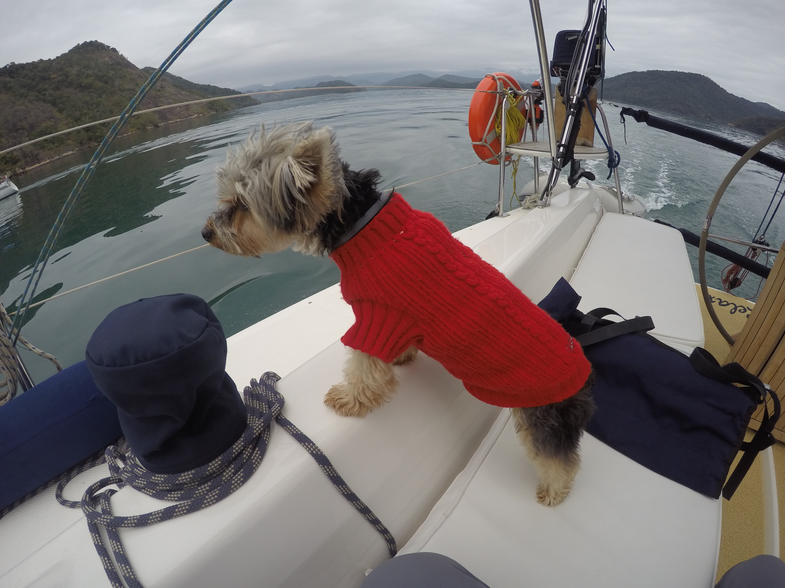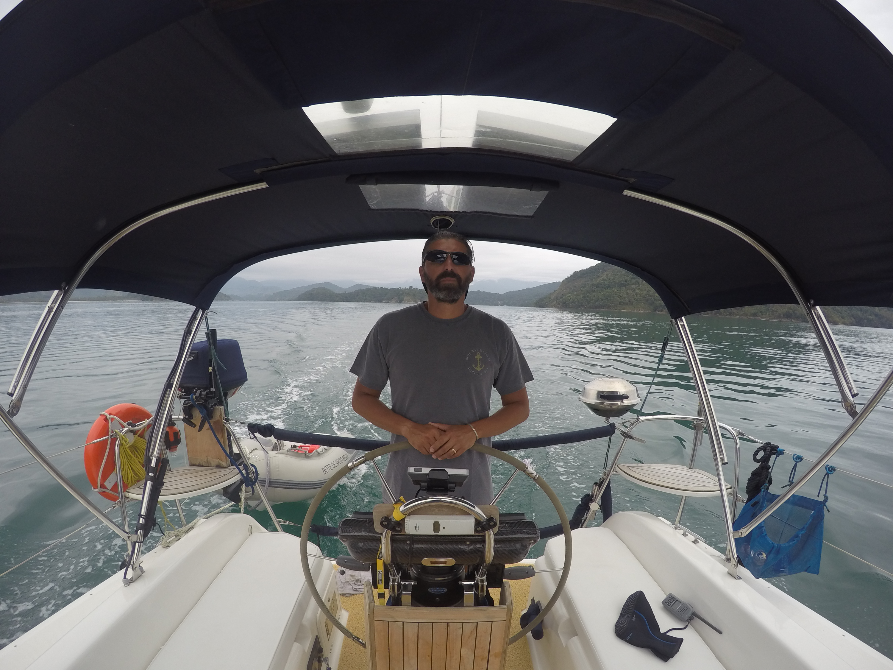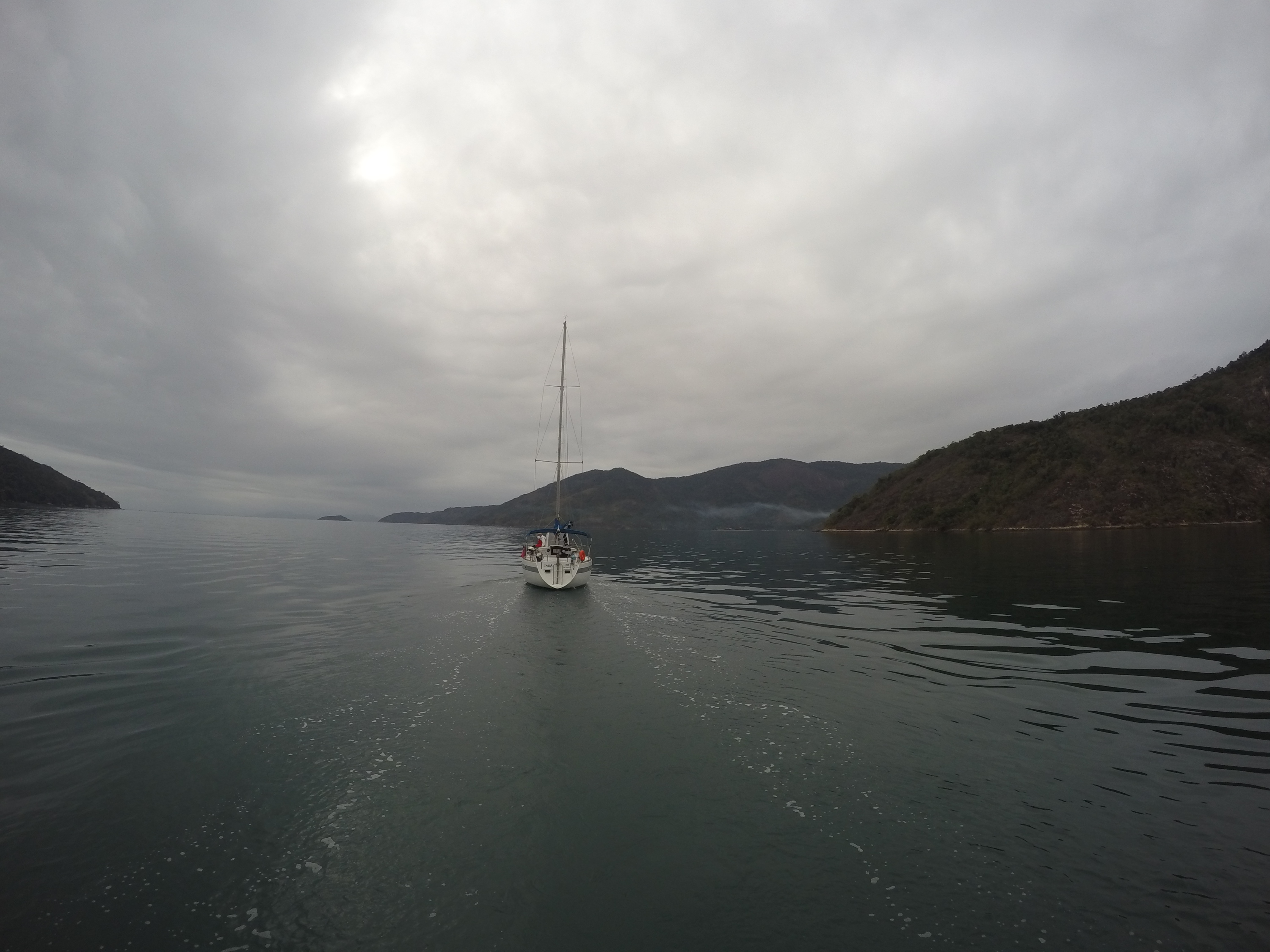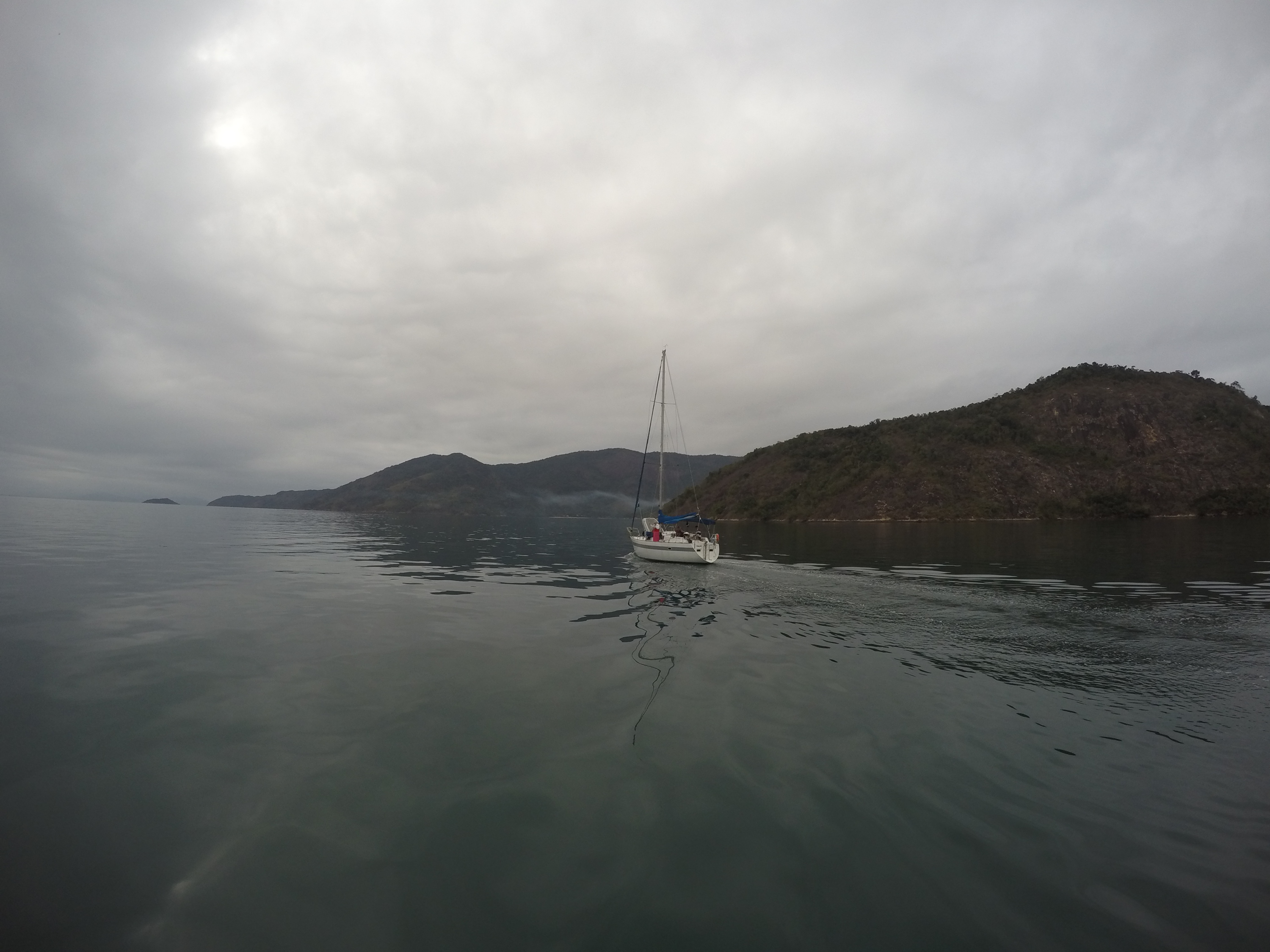 bem distantes da cachoeira. Retornamos, andamos e andamos, pedimos informação e andamos até encontrá-la, já cansados e sonhando com um bom banho de cachoeira. Valeu a pena todo o esforço pois o lugar é muito lindo. Retornamos, após 4 horas de caminhada que oportunizou um bom bate papo é assim falamos um pouco sobre o rumo de nossas vidas. Chegamos para o almoço no restaurante do seu Orlando. Prato muito gostoso com peixe fresco. Estávamos bem cansados, voltamos pro barco e rumamos para dormir na Ilha da Cotia. Pegamos a primeira chuvinha, depois de mais de quarenta dias que estamos aqui. Esta foi nossa maior trilha até agora. Logo logo faremos a trilha do Pão de Açúcar, que também fica no Mamanguá.