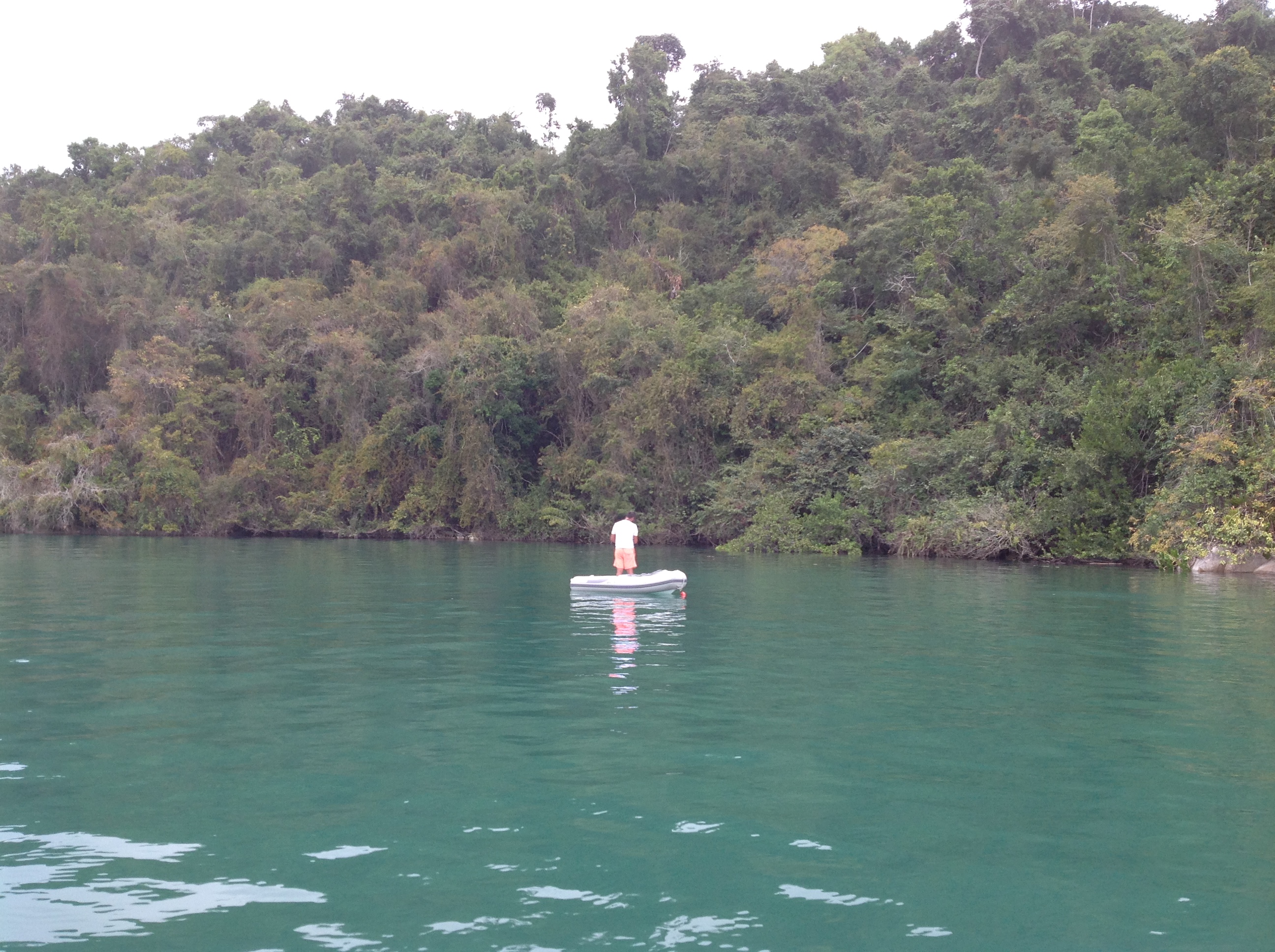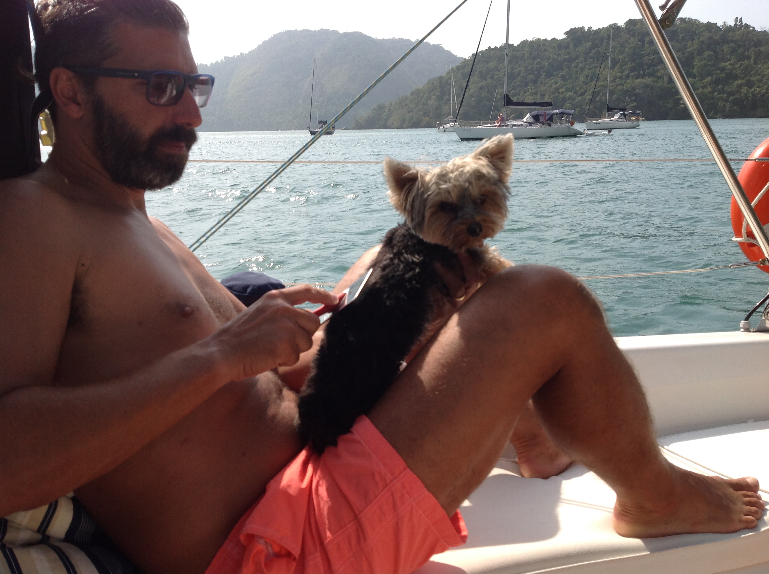 Dia 07/08 (domingo) dia ensolarado, combinamos ir para o Mamanguá fazer a trilha do Pão-de-açúcar. Saímos depois do café e ao sair da área abrigada, pegamos vento com rajadas de 30 knots. O barco não estava preparado internamente e muita coisa saiu do lugar quando o Renato abriu a genoa, muita gente usando o rádio, embarcação perdida, etc… Resolvemos retornar para a Cotia. Ancoramos e vimos vários outros veleiros saindo e retornando. A diretriz era manter-se abrigado até o vento passar e assim o fizemos. O dia passou tranquilo, preparei uma massa com ragu de calabresa, a tarde o vento foi acalmando, o Renato foi pescar de bote e usou sua âncora do bote que funcionou direitinho. Com o tempo fechado não tivemos por do sol. Estourei pipoca e ficamos no convés conversando e vendo os barcos aos poucos irem embora, afinal é véspera de segunda e muuuuitos ainda tem compromissos a cumprir. Pensando assim uma alegria muito grande nos invade, a de saber que estamos levando uma vida super leve, dormindo tranquilos e sem preocupações e isto é simplesmente maravilhoso. Sentimos a cada dia que precisamos de pouco para nos sentirmos felizes e livres. Para fechar o dia, revimos filme Código da Vinci e com ele relembramos os lugares que visitamos em Paris e Roma na companhia dos meus sogros queridos Áurea e Teixeira e os amigos Herbert e Simone. Namastê 🙏