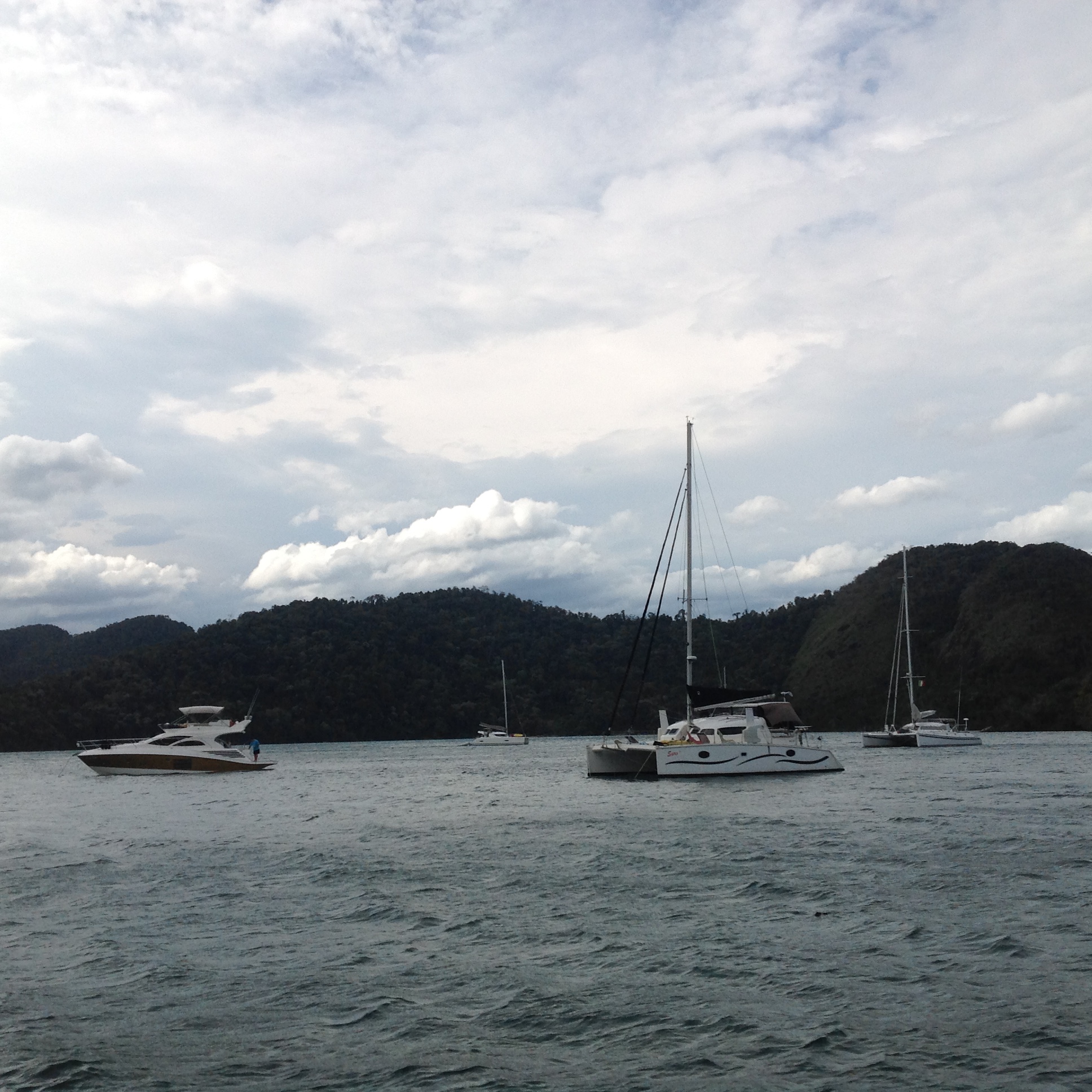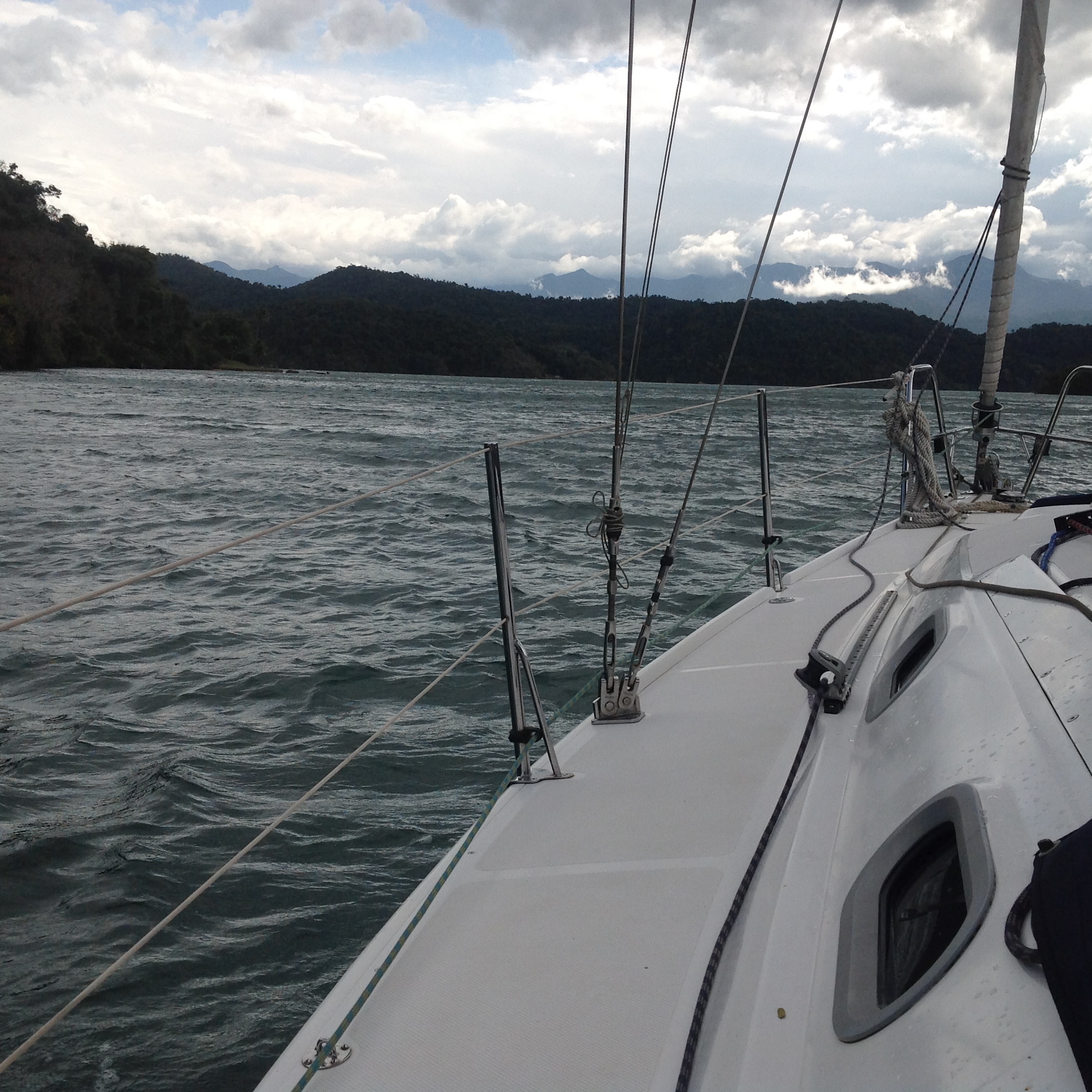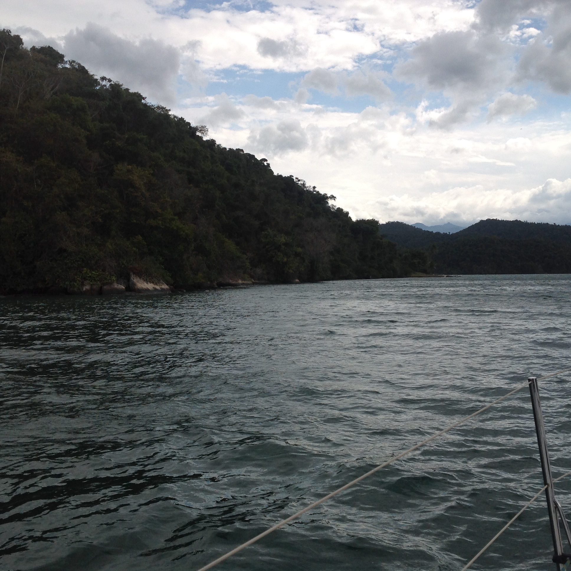 Estávamos bem ancorados e mesmo em meio ao vento forte, com rajadas de 38 knots, mudamos de ancoragem em função de um catamarã que garrou e acabou vindo ancorar próximo ao Relax. O vento estava muito forte e o Kauli veio auxiliar o Renato na ancoragem. Com tempo assim, o comandante preferiu dormir no cockpit mesmo com o vento gelado e o spray de água salgada que o vento levantava. Após muitas horas de atenção, o vento acalmou ás 03h da madrugada de segunda. A Cotia estava diferente, com ondulações, carneirinhos, spray de água salgada e muuuito vento forte, zunindo em nossos ouvidos. O final de semana foi diferente, pois aqui sempre tem muitos veleiros e lanchas e neste, estávamos somente em tres monocascos e três catamarãs. O dia passou lentamente e a noite requereu atenção. Namastê 🙏🏼