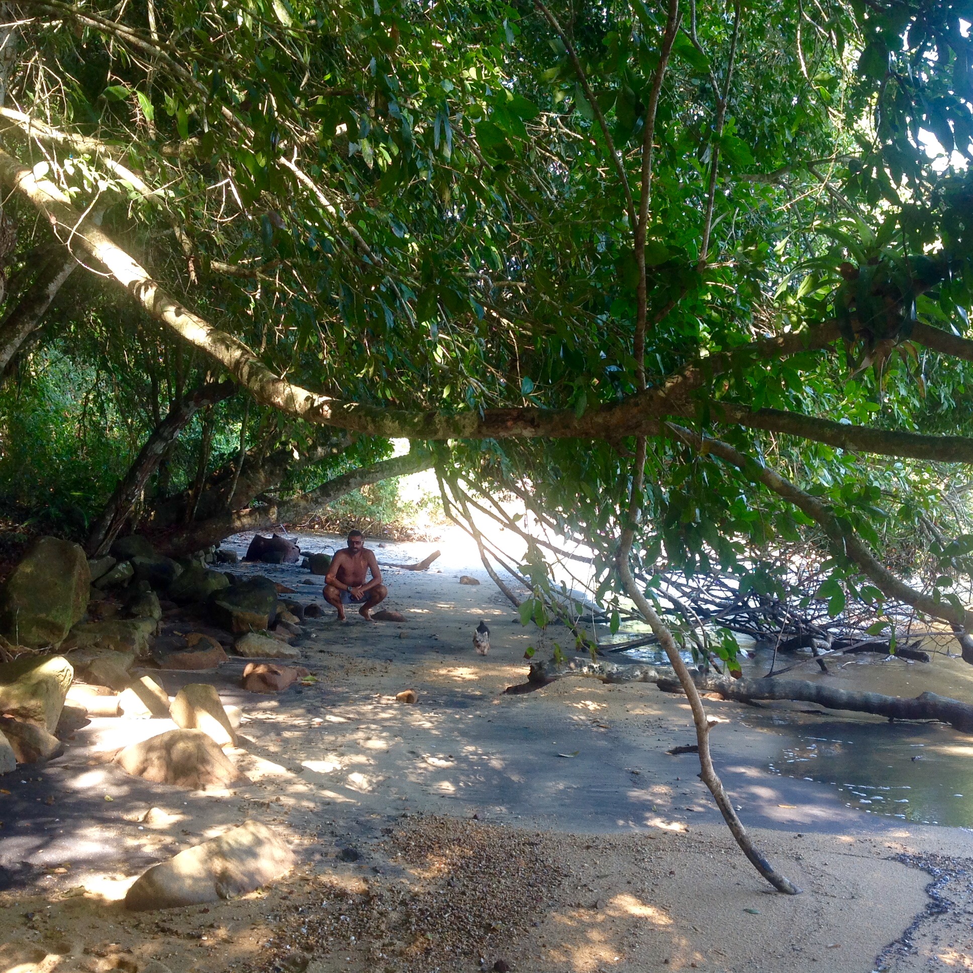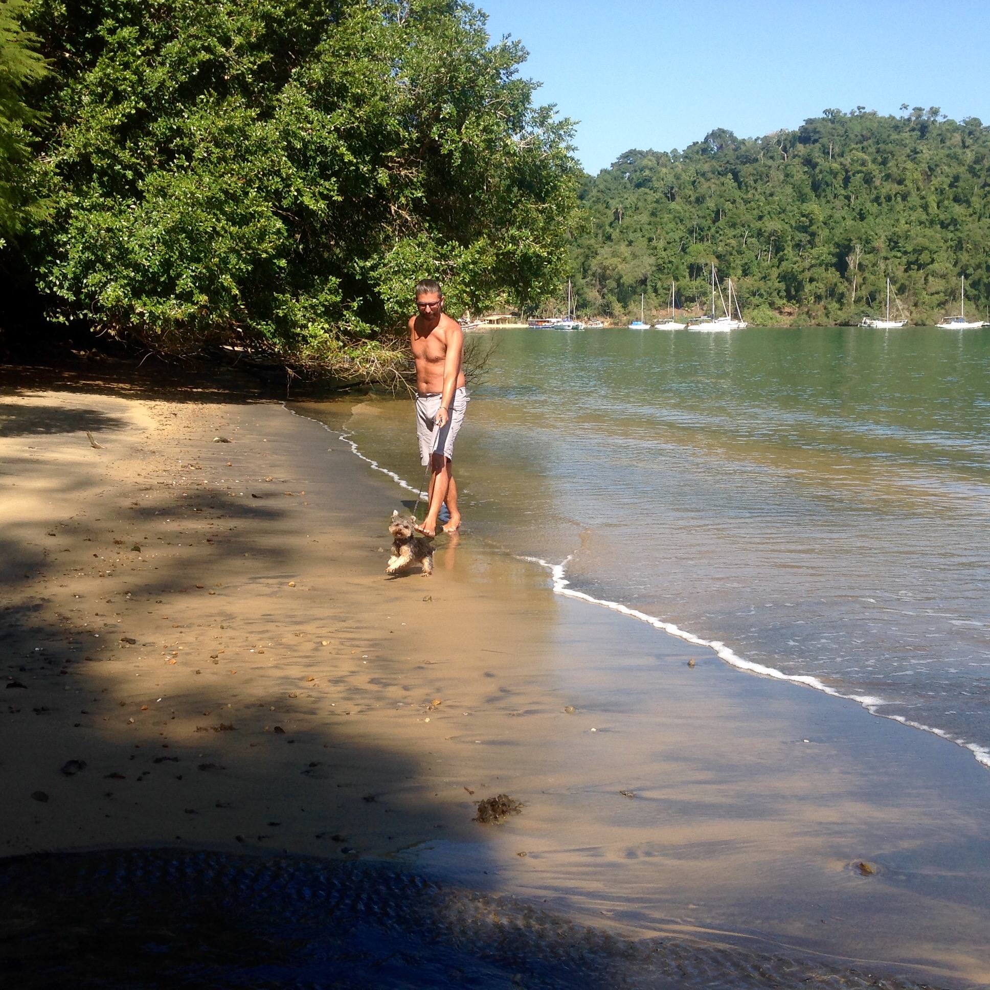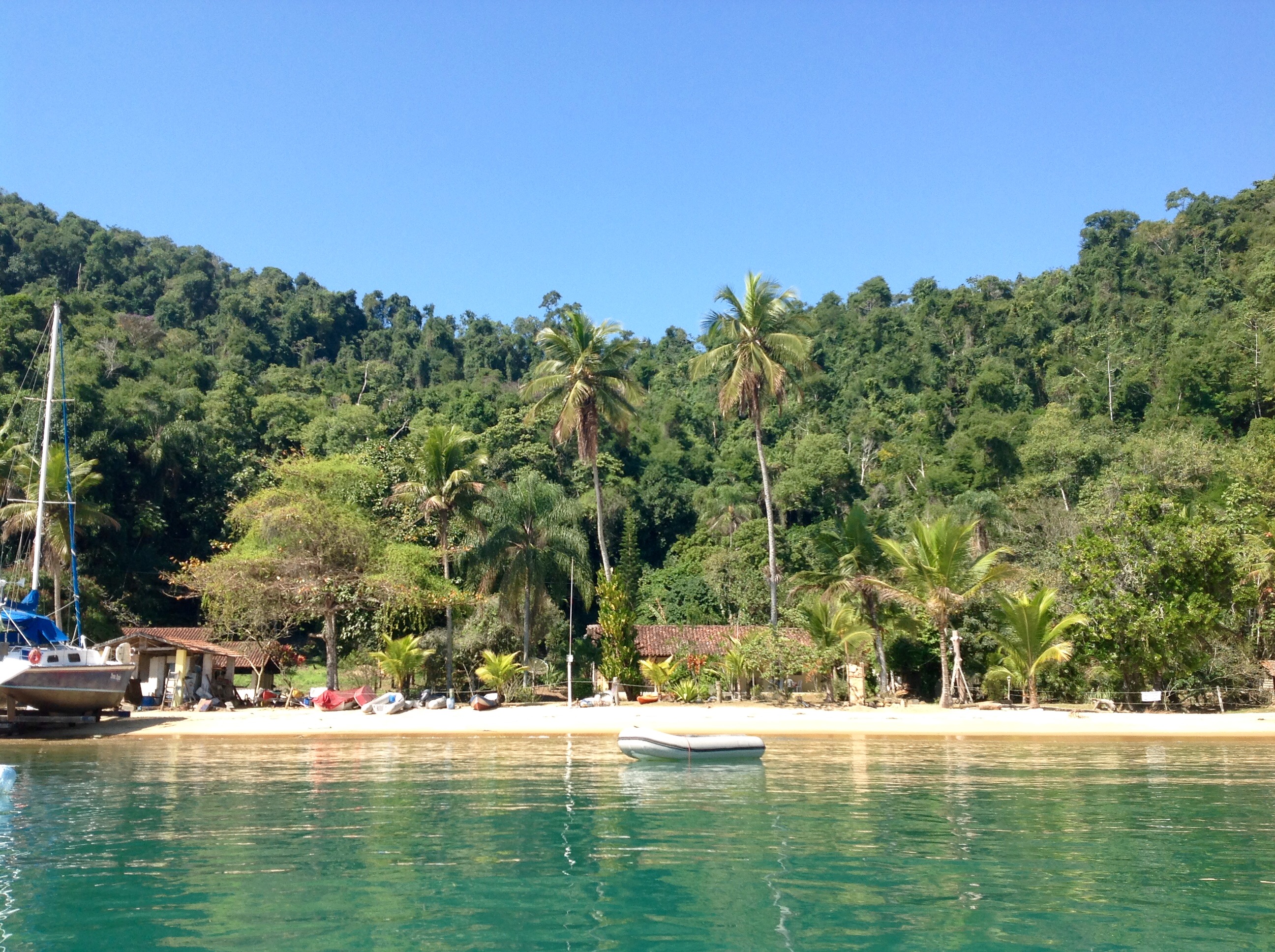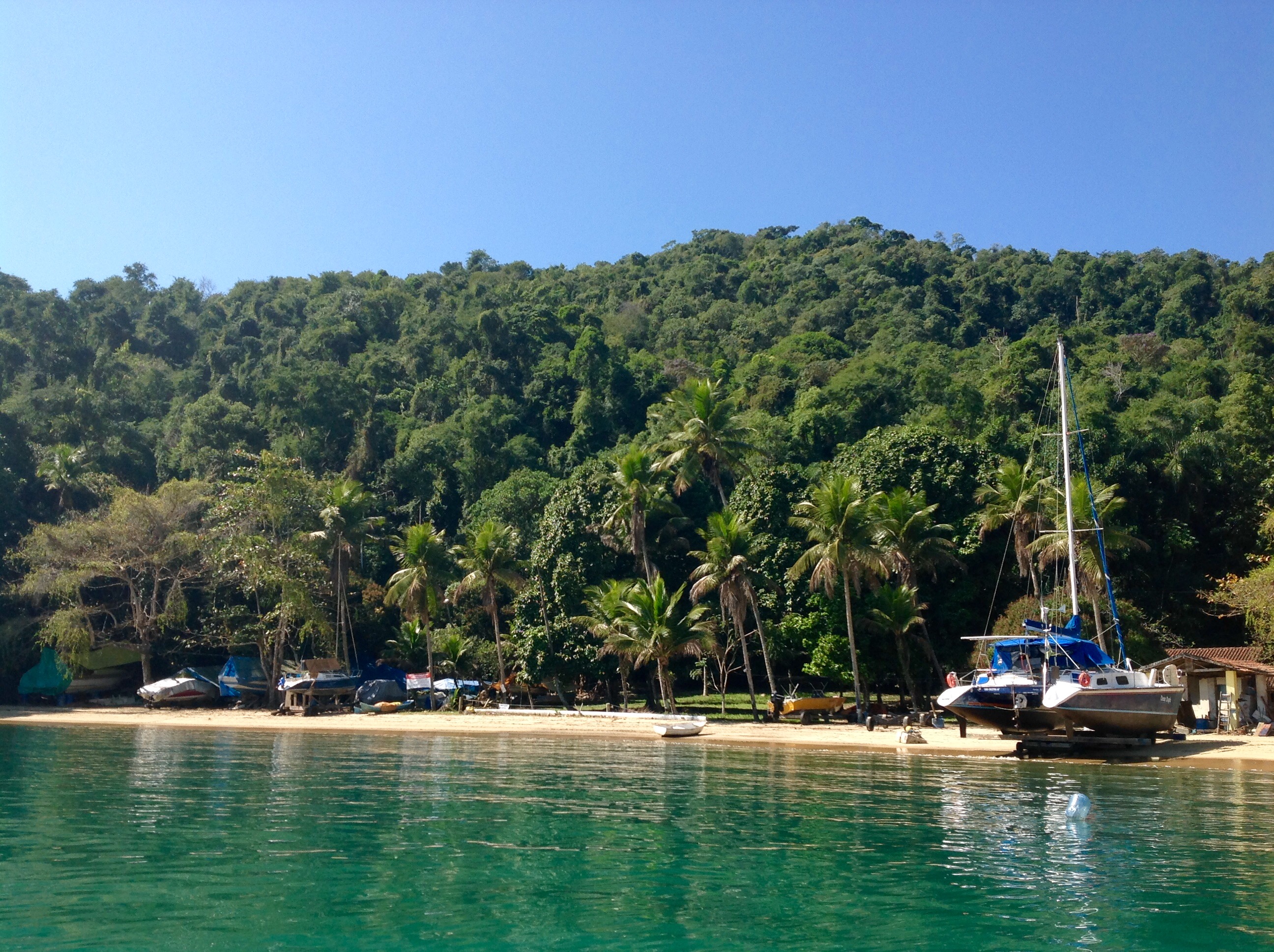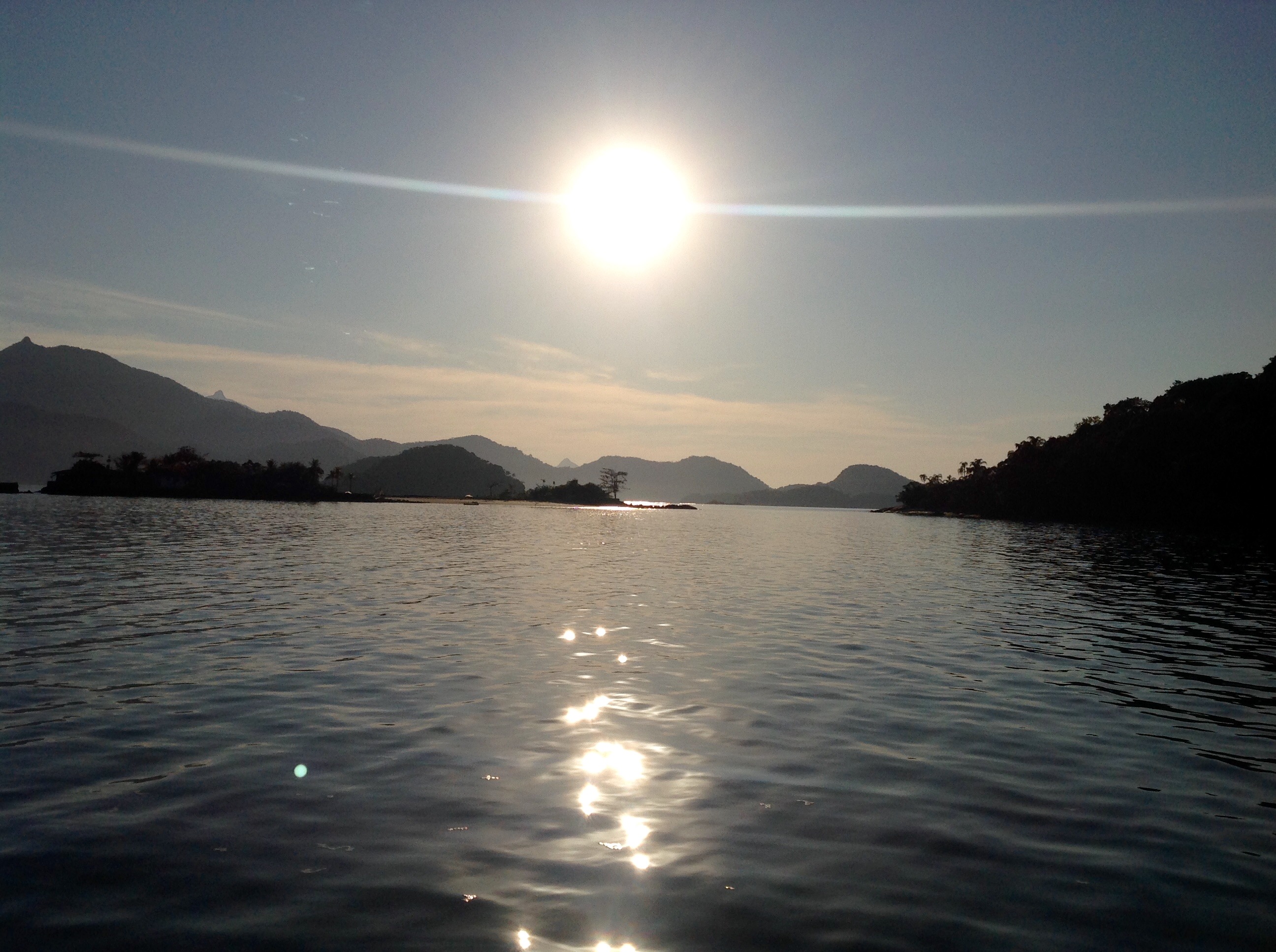 Dia 54 (14/08/16) domingo 🌞 dia dos pais – Renato ligou cedo para felicitar o Teixeira pelo seu dia. Hoje olhamos no guia do Helio Magalhães: Santos-Rio (imperdível para quem quer ficar navegando por aqui) e decidimos seguir para a Praia Grande e Praia do Engenho. As duas são vizinhas, bem próximas. Ao chegar descemos de bote (sem motor, pois o Renato está curtindo remar quando o percurso é pequeno ou então quando vamos passear bem na beirinha do mar, para ver os peixinhos) na Praia do Engenho e caminhamos um pouco e já encontramos uma grande roda d’Água, que já se mistura com a vegetação, mas que produziu aguardente até o final da segunda guerra mundial.