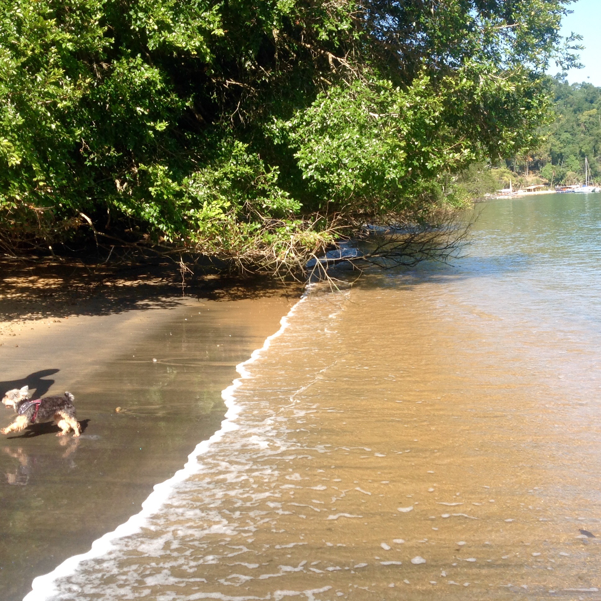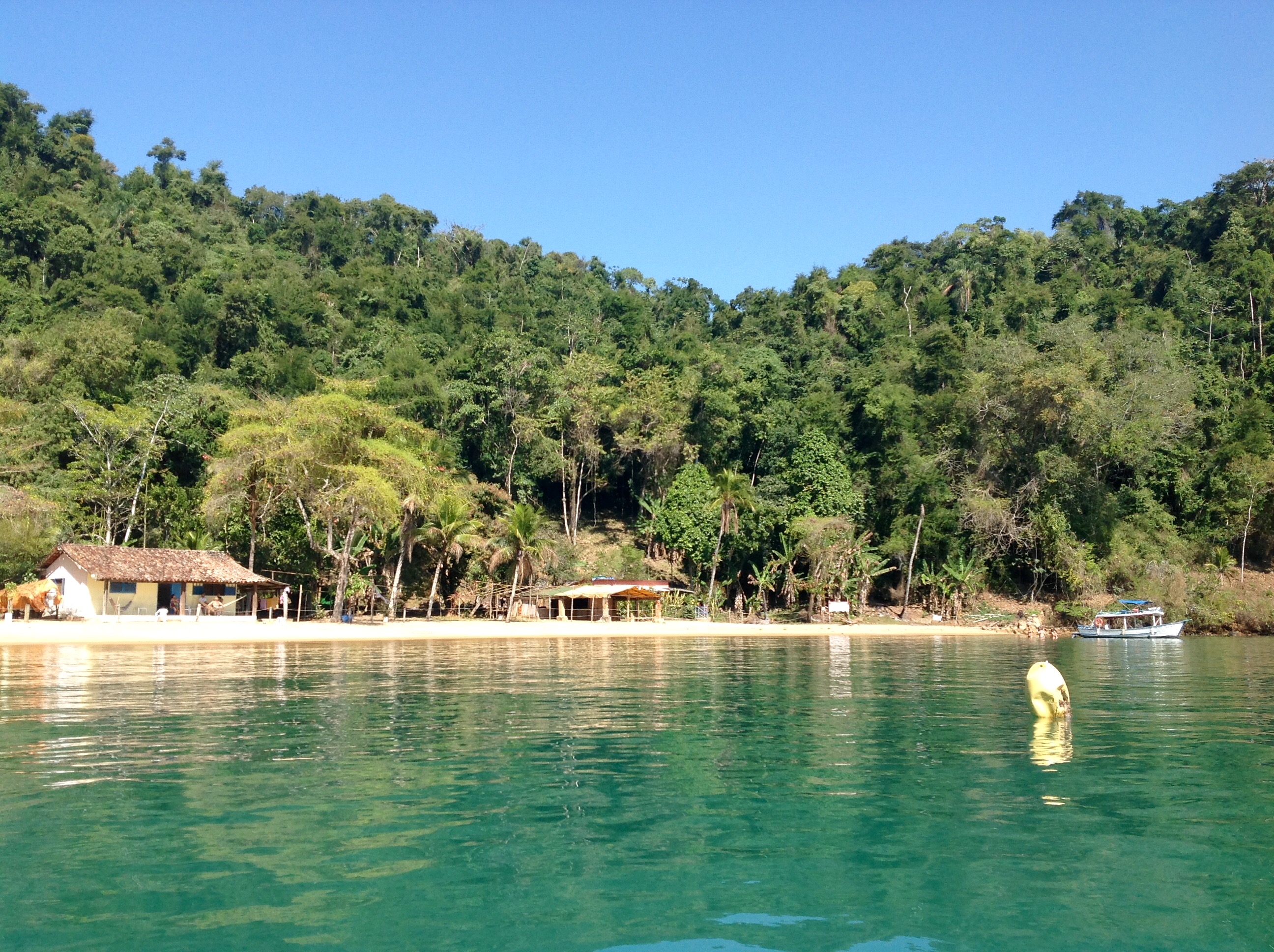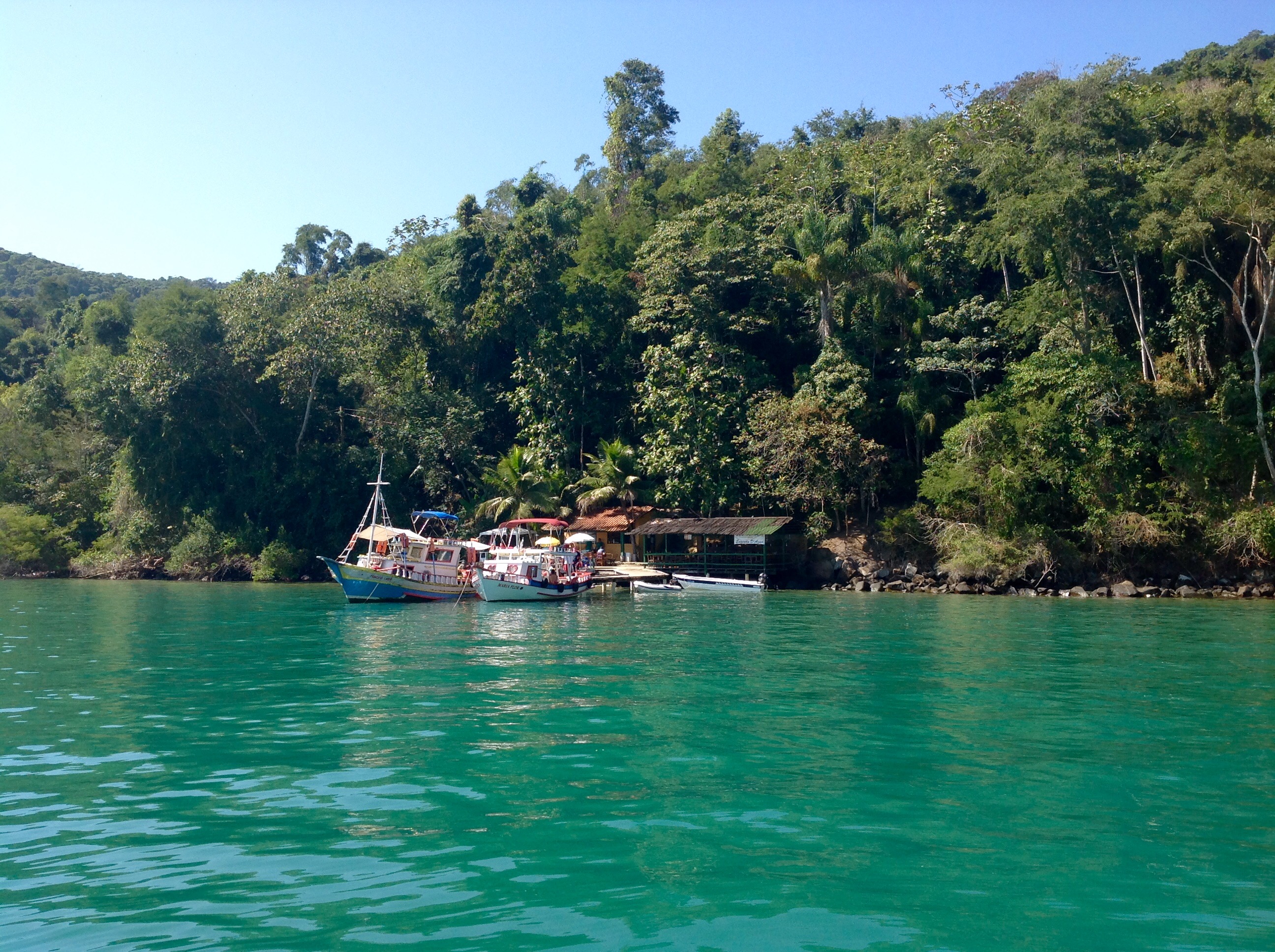 Na sequência nos aproximamos da Praia Grande, um faixa de areia pequena e com uma parte tomada por um estaleirinho a céu aberto. Chegamos perto e a primeira placa que vimos foi, entre outras coisas, proibido descer com animais…. Puf!!! Acabou nosso ânimo e decidimos por não descer. Como ponto positivo tínhamos visto o restaurante Engenho onde pensamos em almoçar, mas aí vimos também inúmeros barquinhos de passeio chegando, uma muvuca se formando e assim deixamos para trás, o primeiro lugar que não gostamos 🙁.