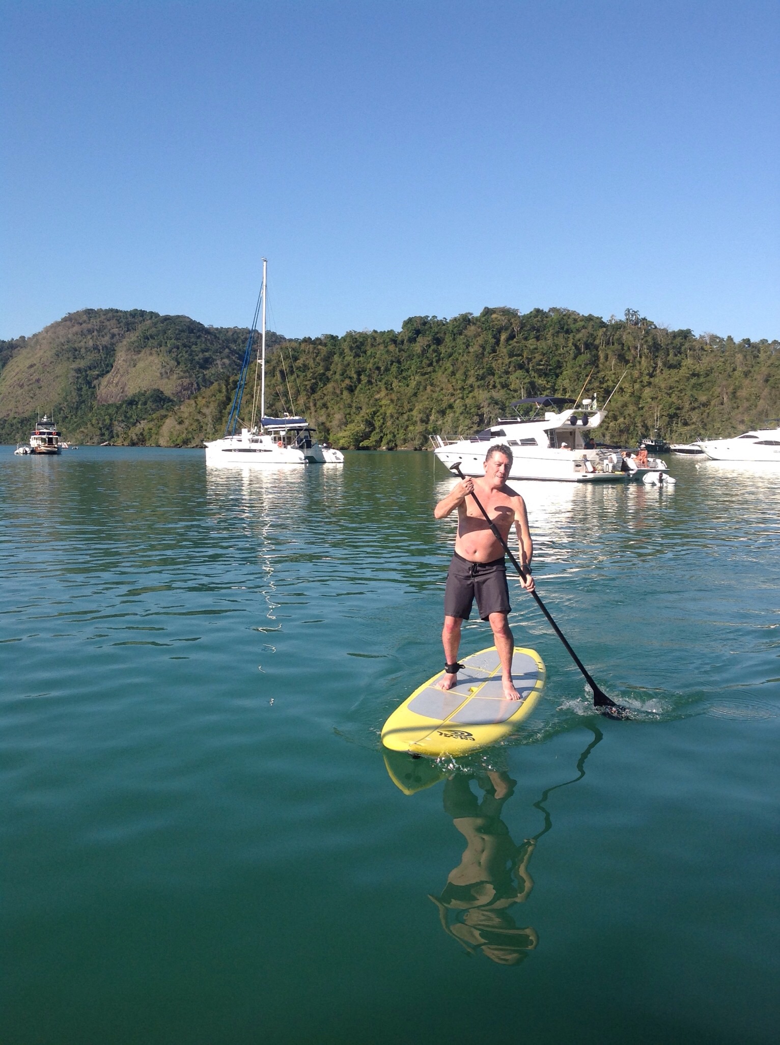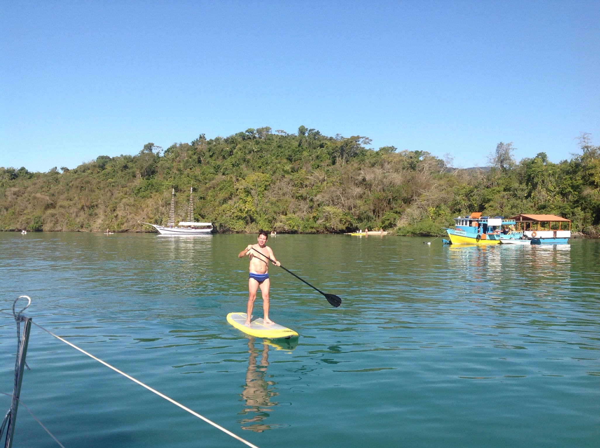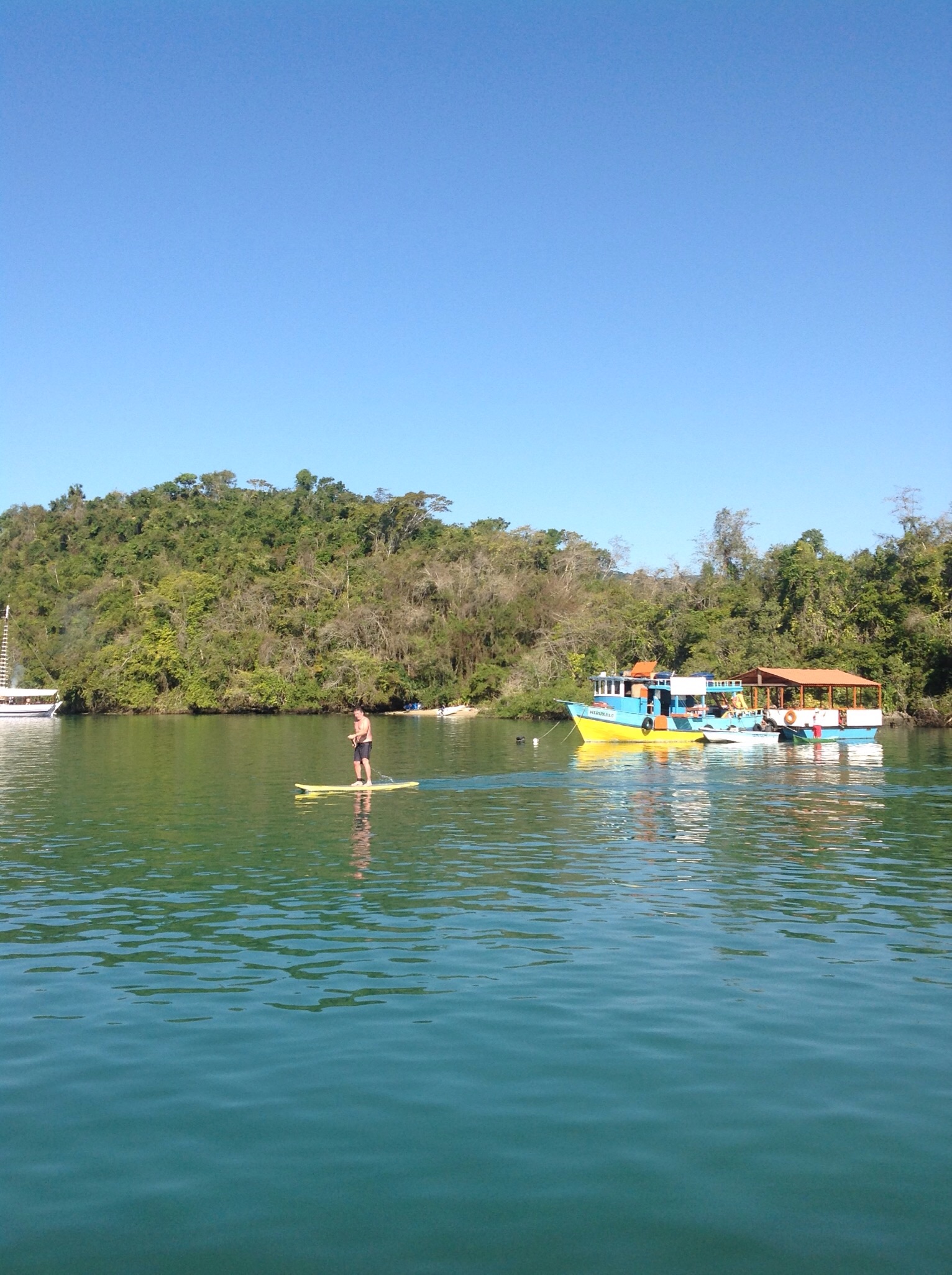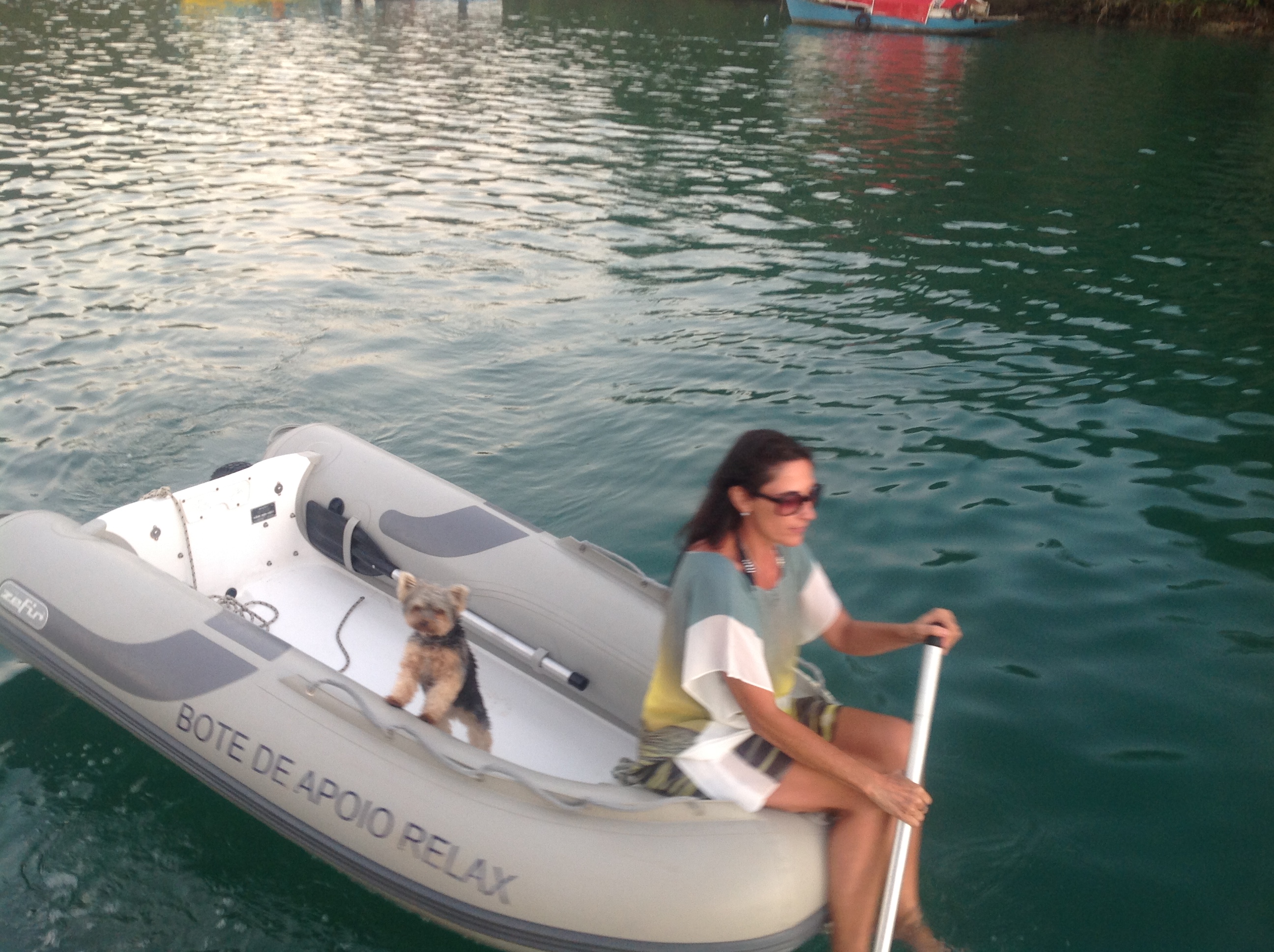 Eu fiquei com a Bella a levei passear de bote, depois fui com o stand up até a prainha da Cotia e como a água estava muito limpa, mergulhei com o snorkel e vi peixinhos coloridos que ainda não havia visto aqui.