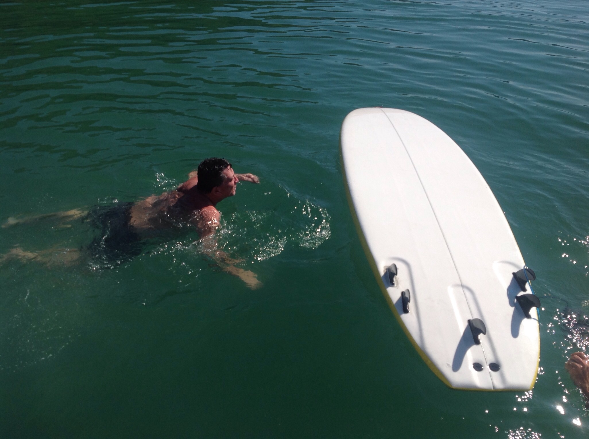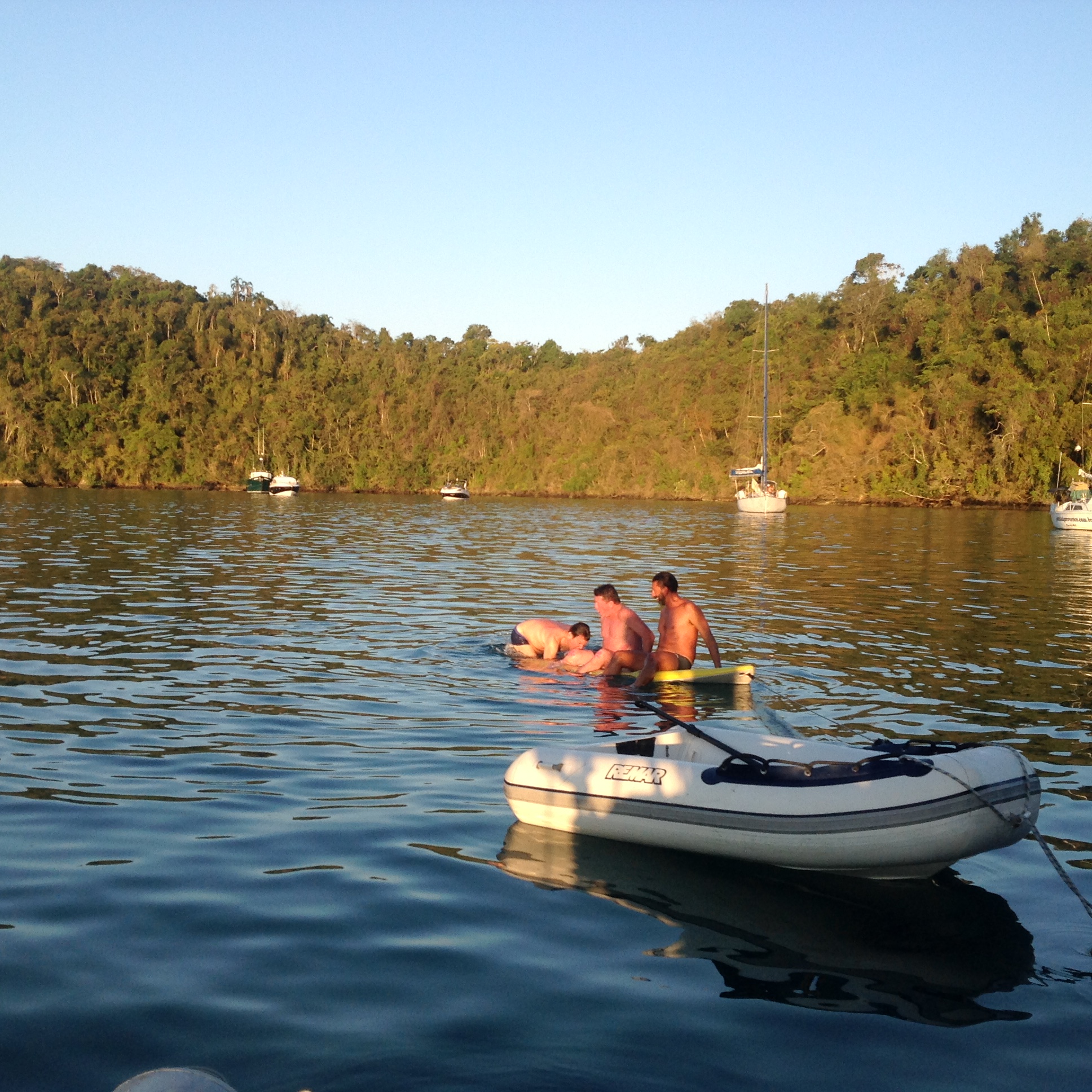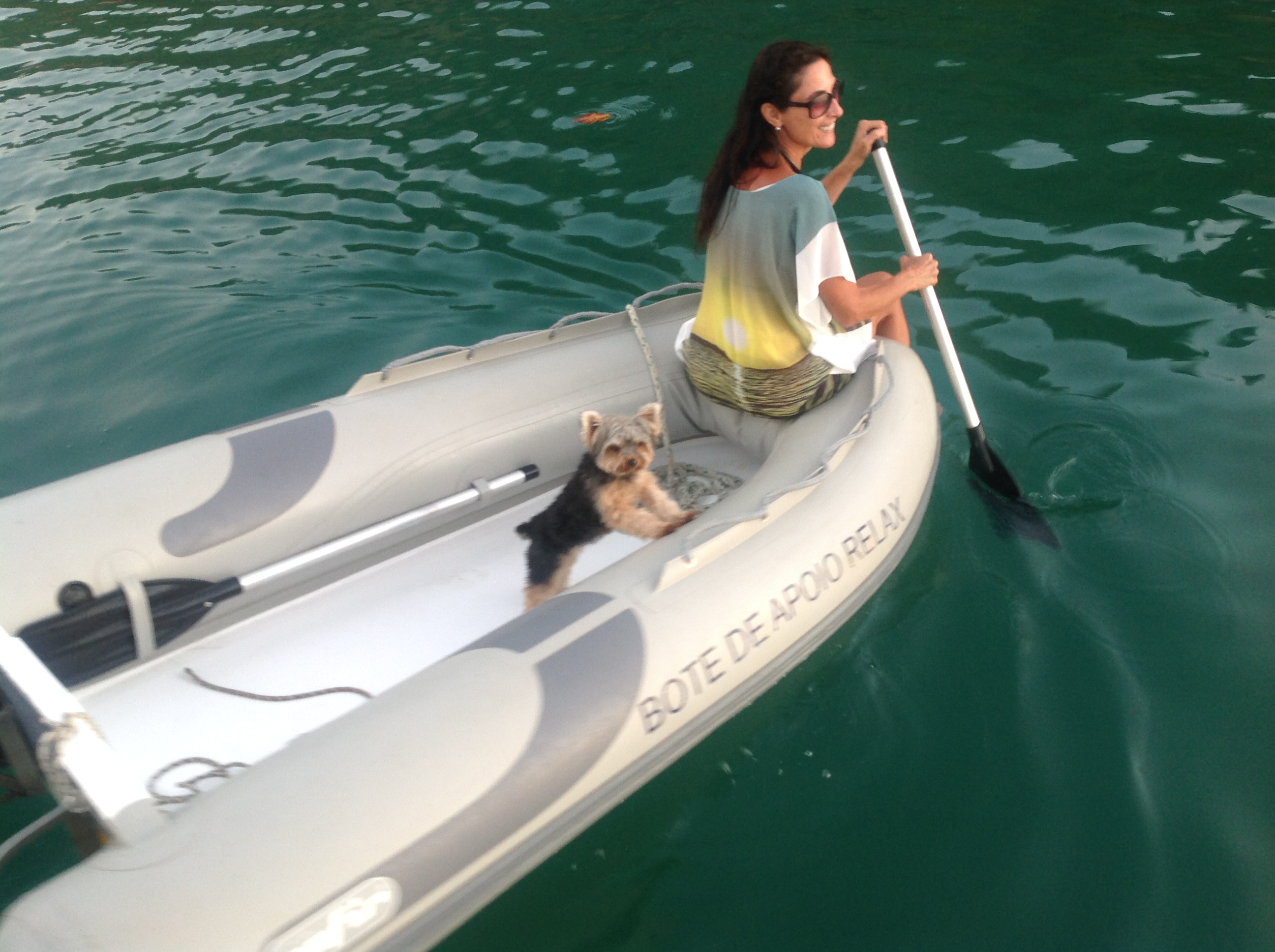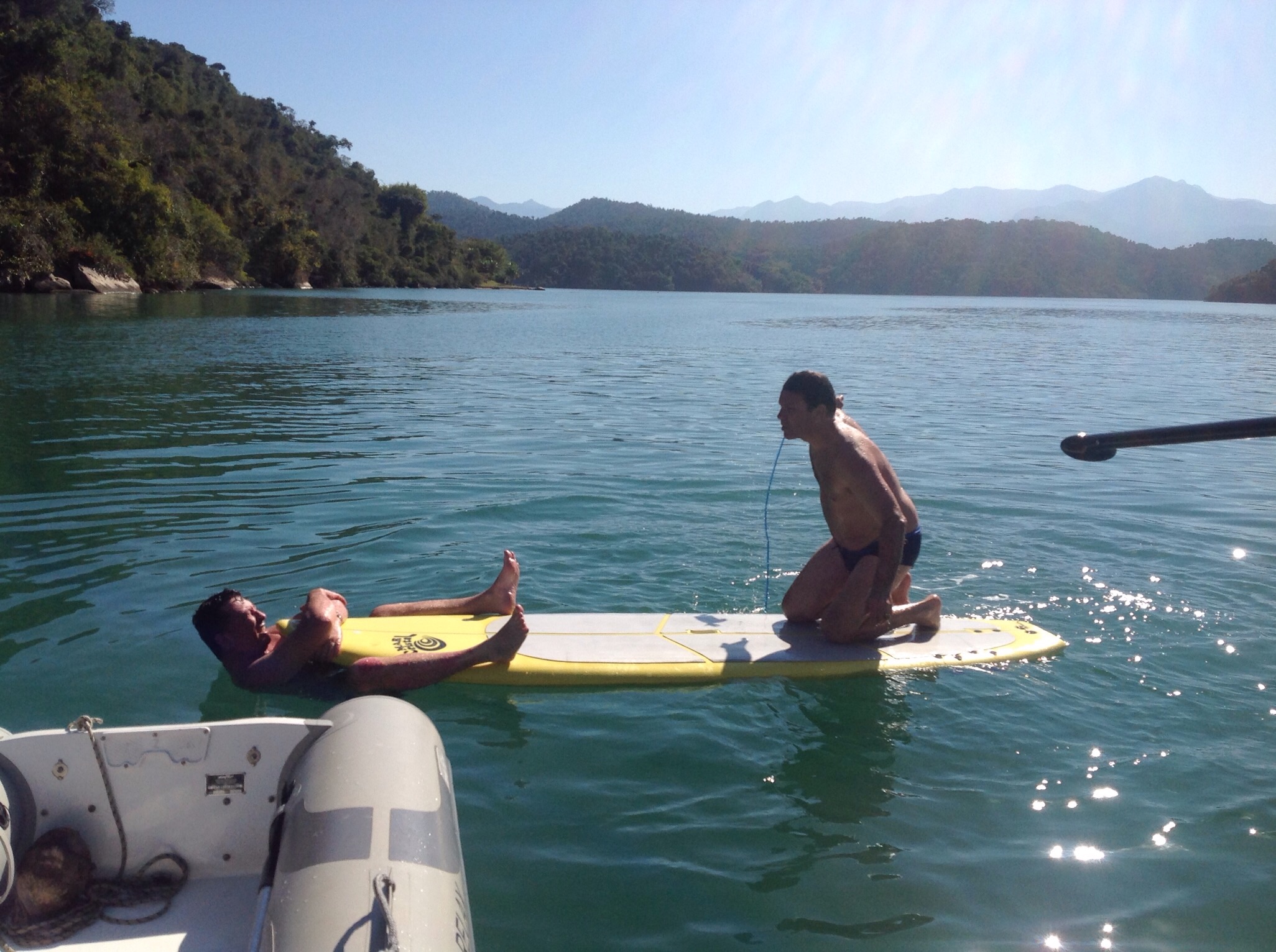 Eu fiquei com a Bella a levei passear de bote, depois fui com o stand up até a prainha da Cotia e como a água estava muito limpa, mergulhei com o snorkel e vi peixinhos coloridos que ainda não havia visto aqui.