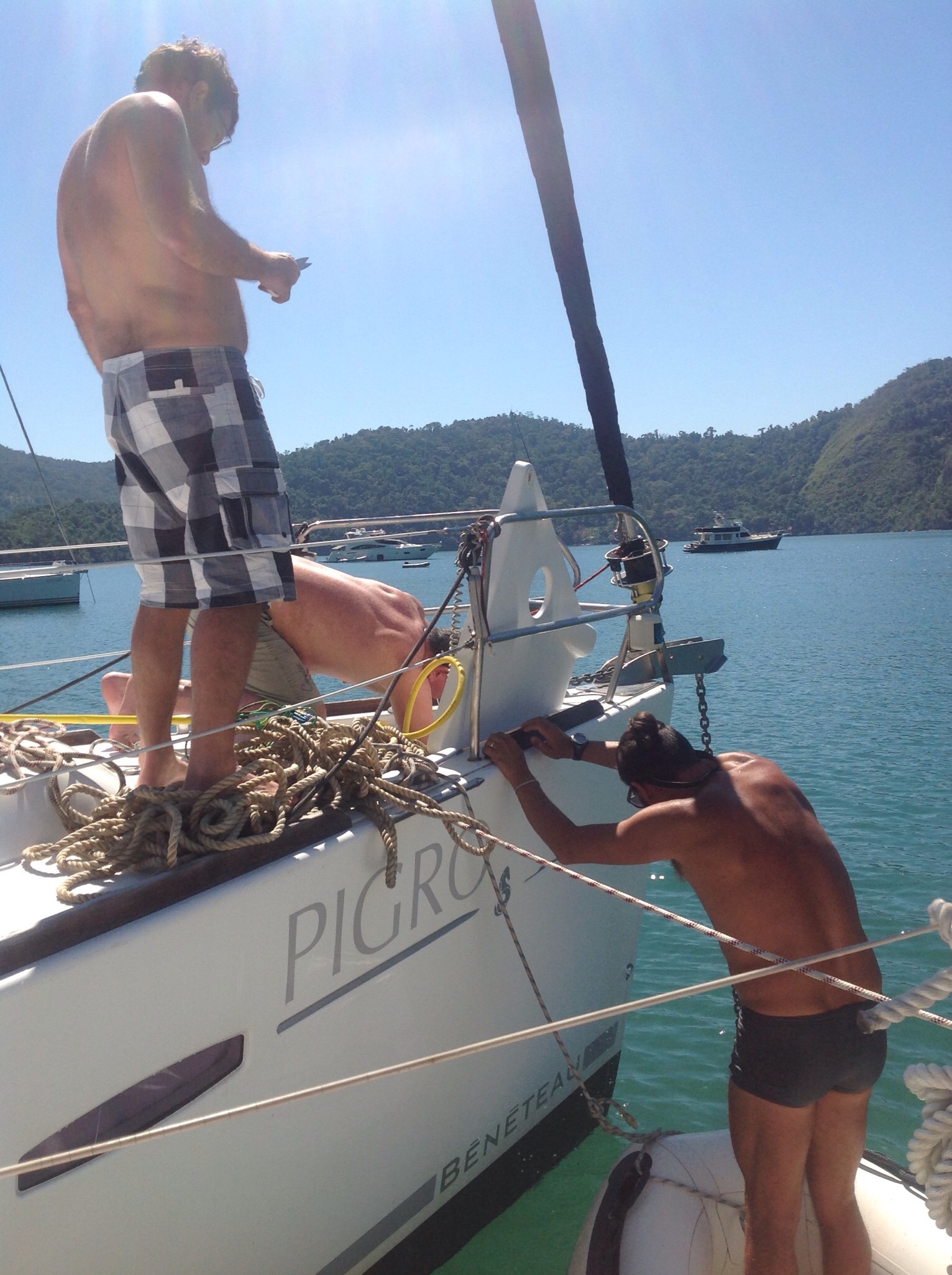 conhecendo os detalhes do barco e depois saíram velejar rumo à Ilha do Algodão, afinal queriam mesmo era dar uma velejada e sentir o Pigro com as velas abertas.