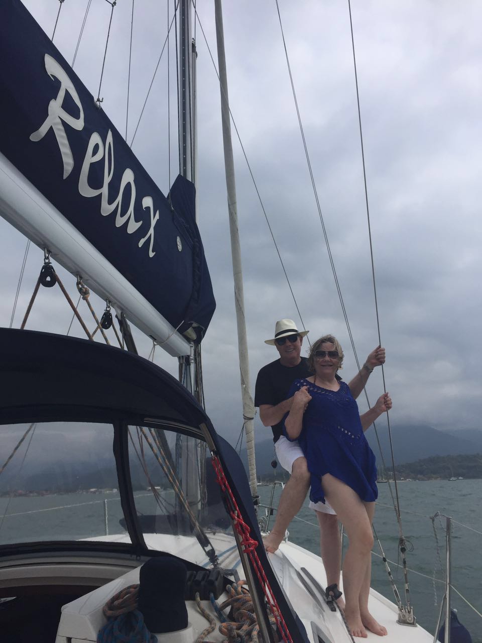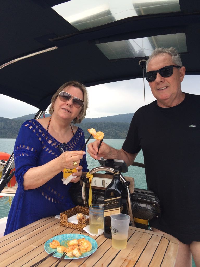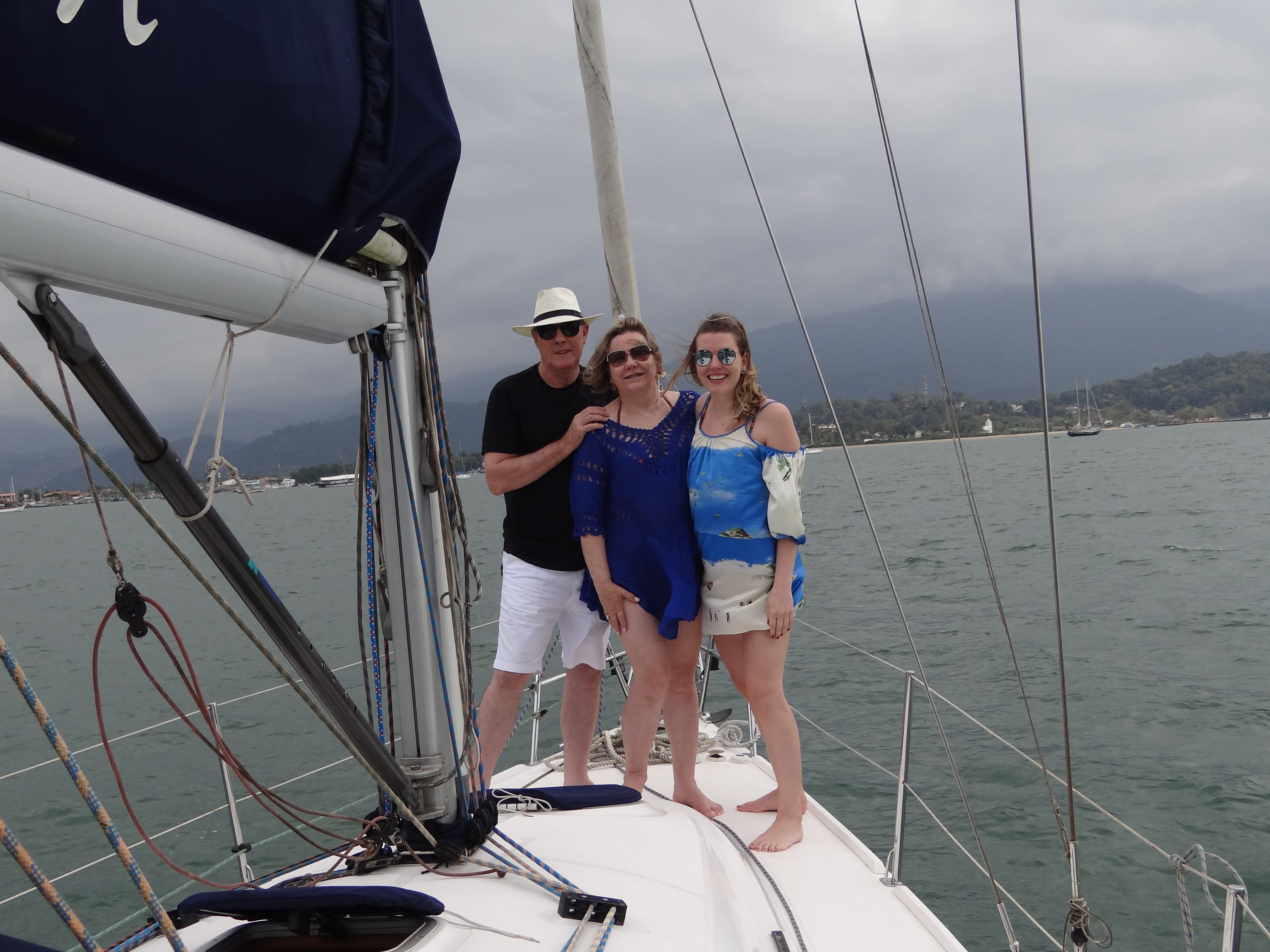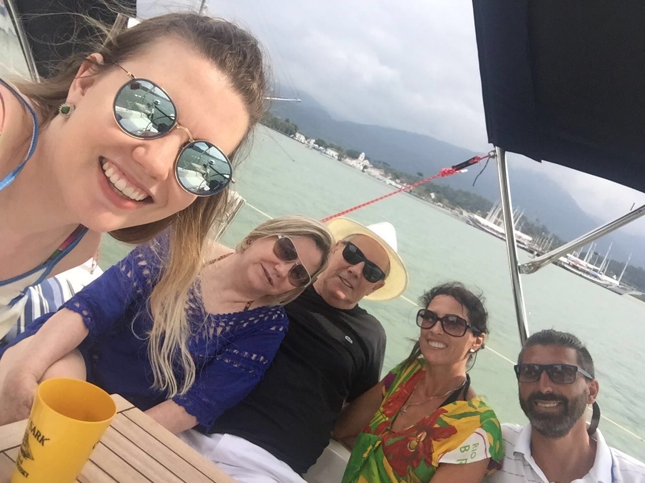 O dia começou muito feliz, mostramos o barco a eles, seu funcionamento e logo se acomodaram. Saímos da Marina rumo a Ilha da Cotia, mas fomos costeando e mostrando cada prainha, contando o que vimos por lá, o que há de interessante em cada uma delas. Eles também se admiraram da cor da água, que mesmo sem muito sol, estava clara, verde esmeralda. O Ilson se saiu muito bem como imediato, quase tomou o lugar da mandante kkk. Ao chegarmos na Cotia preparei uma entrada com camarão branco, os daqui são deliciosos e graúdos e a seguir almoçamos o já tradicional camarão ao ninho, especialidade que veio do Oceanware e que todos adoram. Passamos a tarde gostosamente conversando, matando a saudade e compartilhando com eles um pouco de nosso dia a dia. O dia foi maravilhoso simplesmente. Retornamos da Cotia para a Marina e marcamos de nos encontrar no dia seguinte. Namastê 🙏🏼