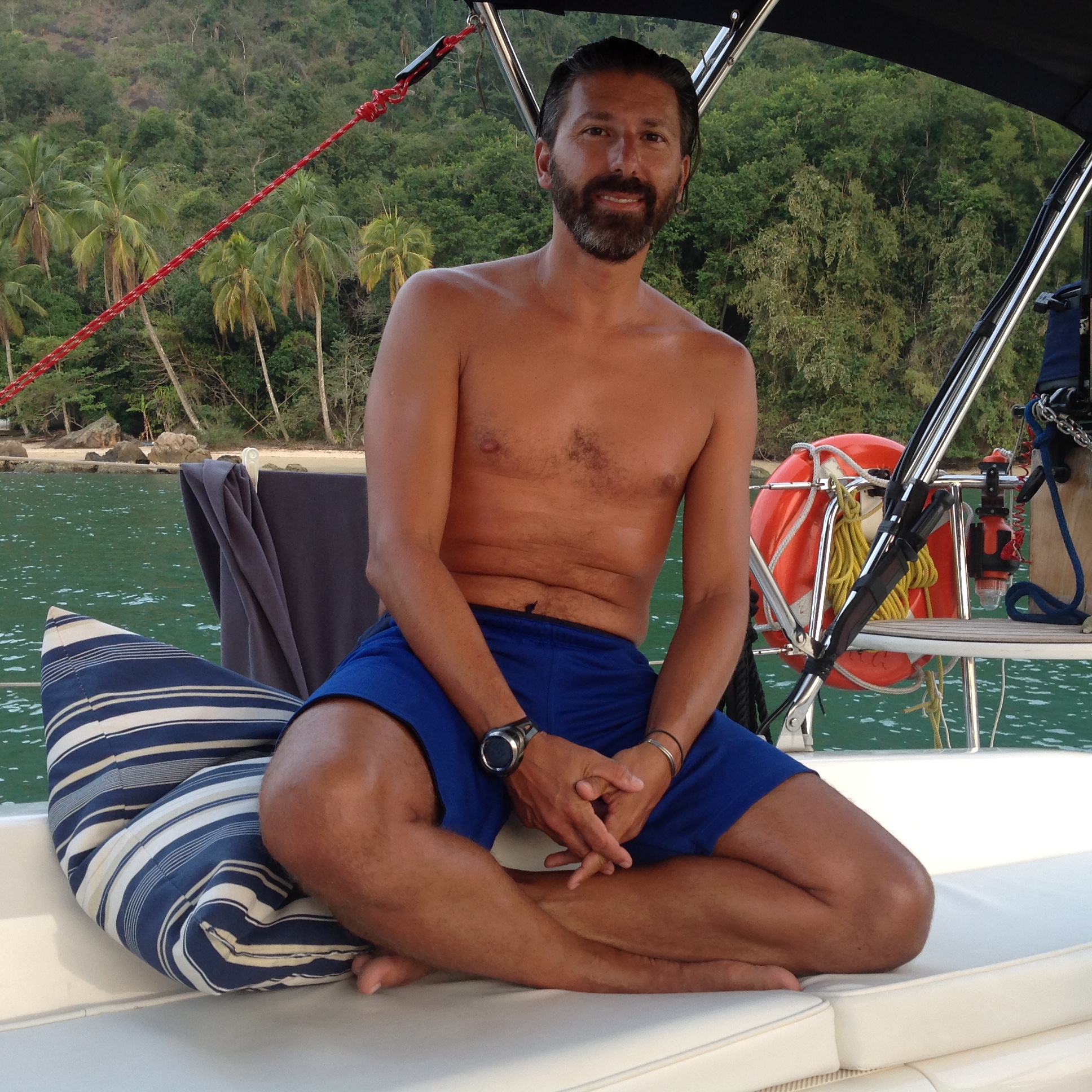 O Renato vai impermeabilizar o tanque de água doce e fomos comprar o material. Deixamos o bote preso com corrente na areia bem próximo do cais. Passeamos um pouco e fizemos as compras e logo retornamos ao barco e nos dirigimos para a Prainha Cantagalo. O Renato fez a manutenção, fomos para a prainha brincar com a Bella.