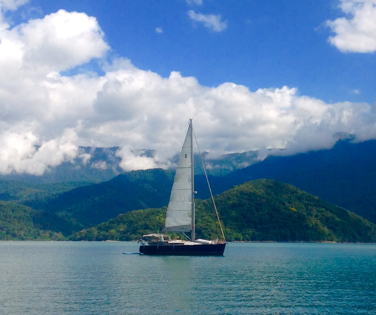 Dia 108 (07/10/16) sexta 🌞🌥🌧 Ilha do Cedro. Acordamos com o sol entrando, tomamos café no cockpit, os barcos pesqueiros saíram de madrugada e ancorado próximo de nós o Oceanware, do amigo Herman.