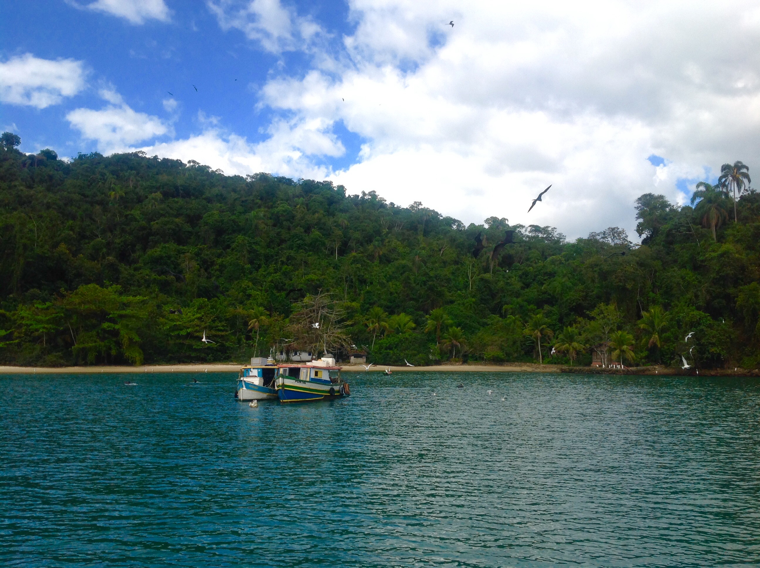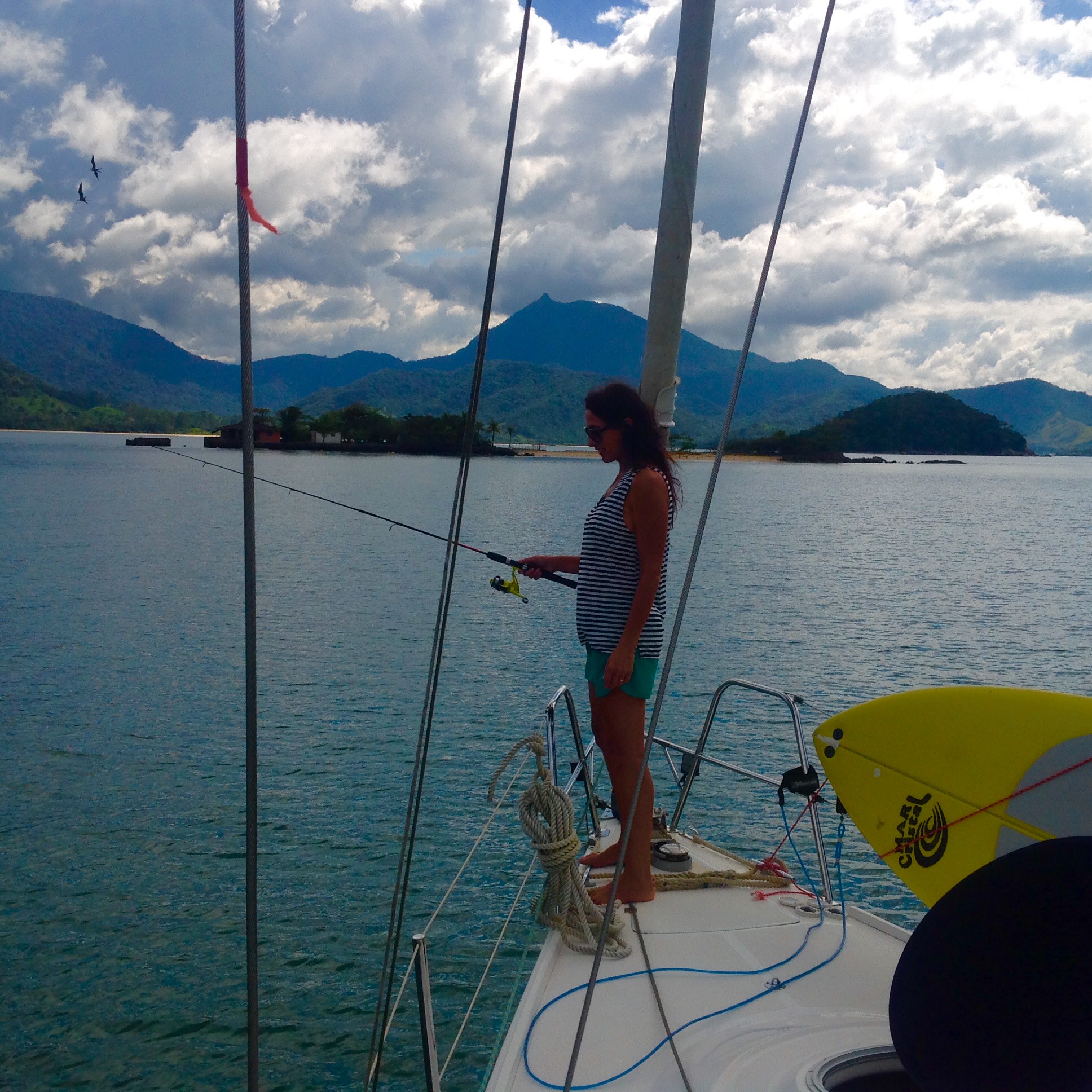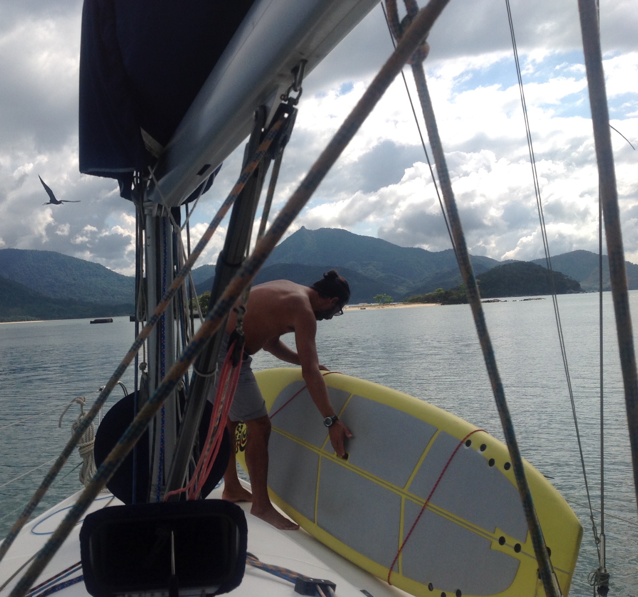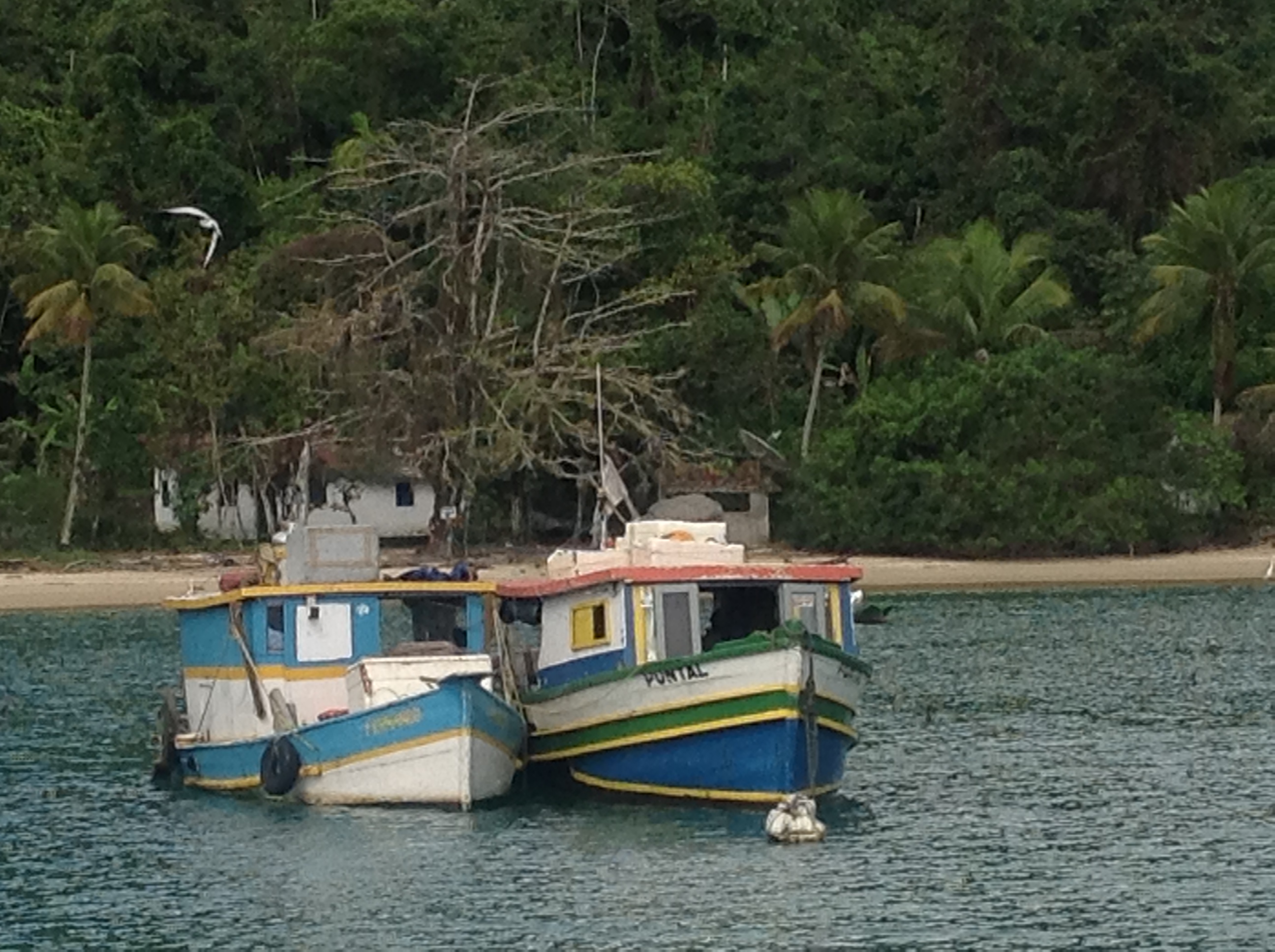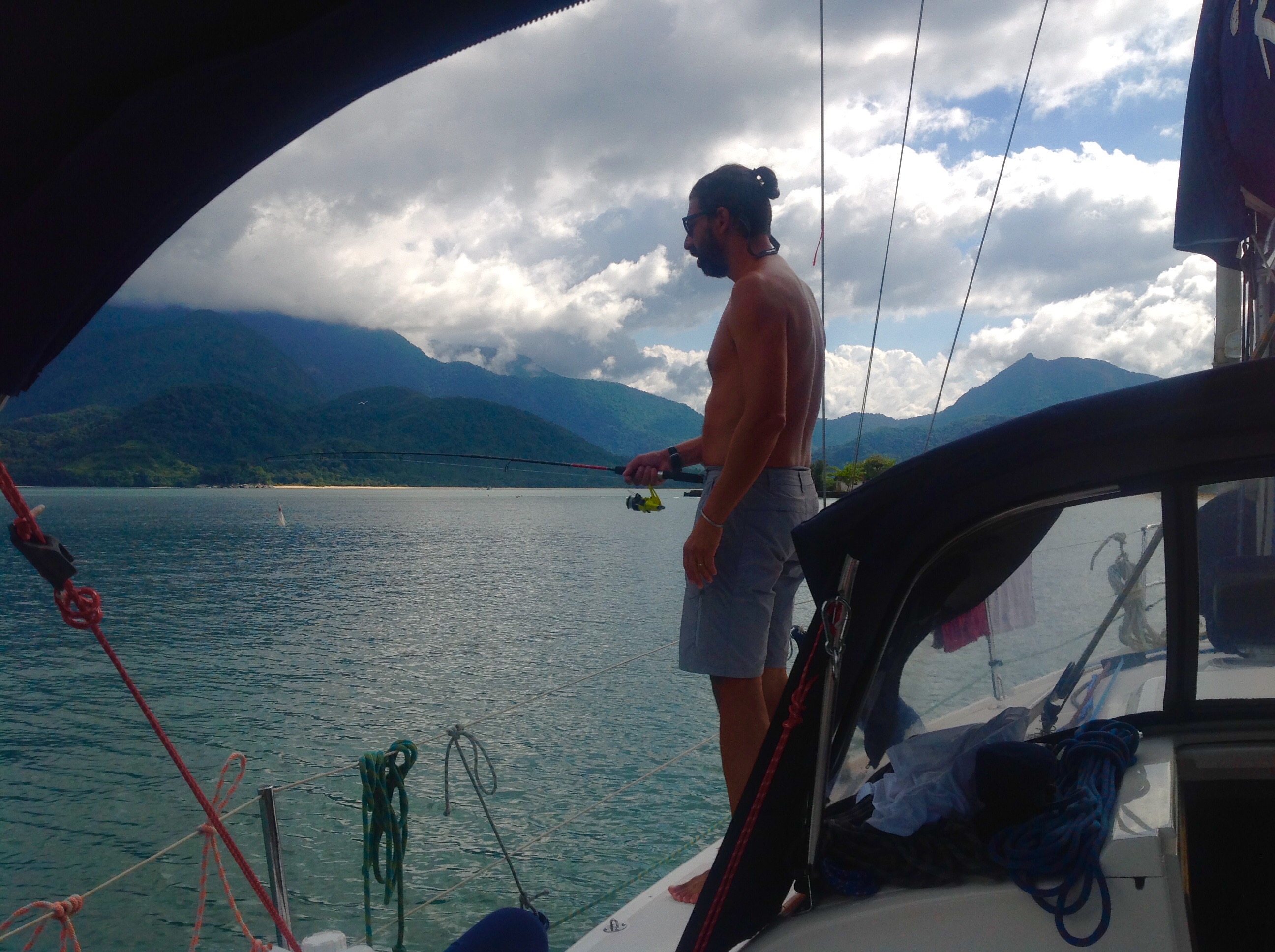 Recebemos aviso de vento forte de sudoeste e nos preparamos, mas ele acabou não chegando, passou ao largo. Descemos com o bote até a praia, brincamos e juntamos conchas bem bonitas, uma bem diferente estava ainda com seu dono dentro…. Agora vamos esperar ele sair para ficar com a concha. Almoçamos com o Herman e a tarde tentamos pegar o robalo, mas ainda não foi desta vez, o Renato pescou um bagre que acabamos por soltar, pois o Herman disse que com ele dava para fazer uma sopa e aí achamos melhor deixar pra lá kkkk. Depois saímos com o bote e o molinete, mas não pegamos o tal robalo. Na prainha vimos um pé de jaca carregado, realmente é uma árvore muito estranha, apesar de ser grande os frutos também são enormes e dá medo de cair sobre a gente.