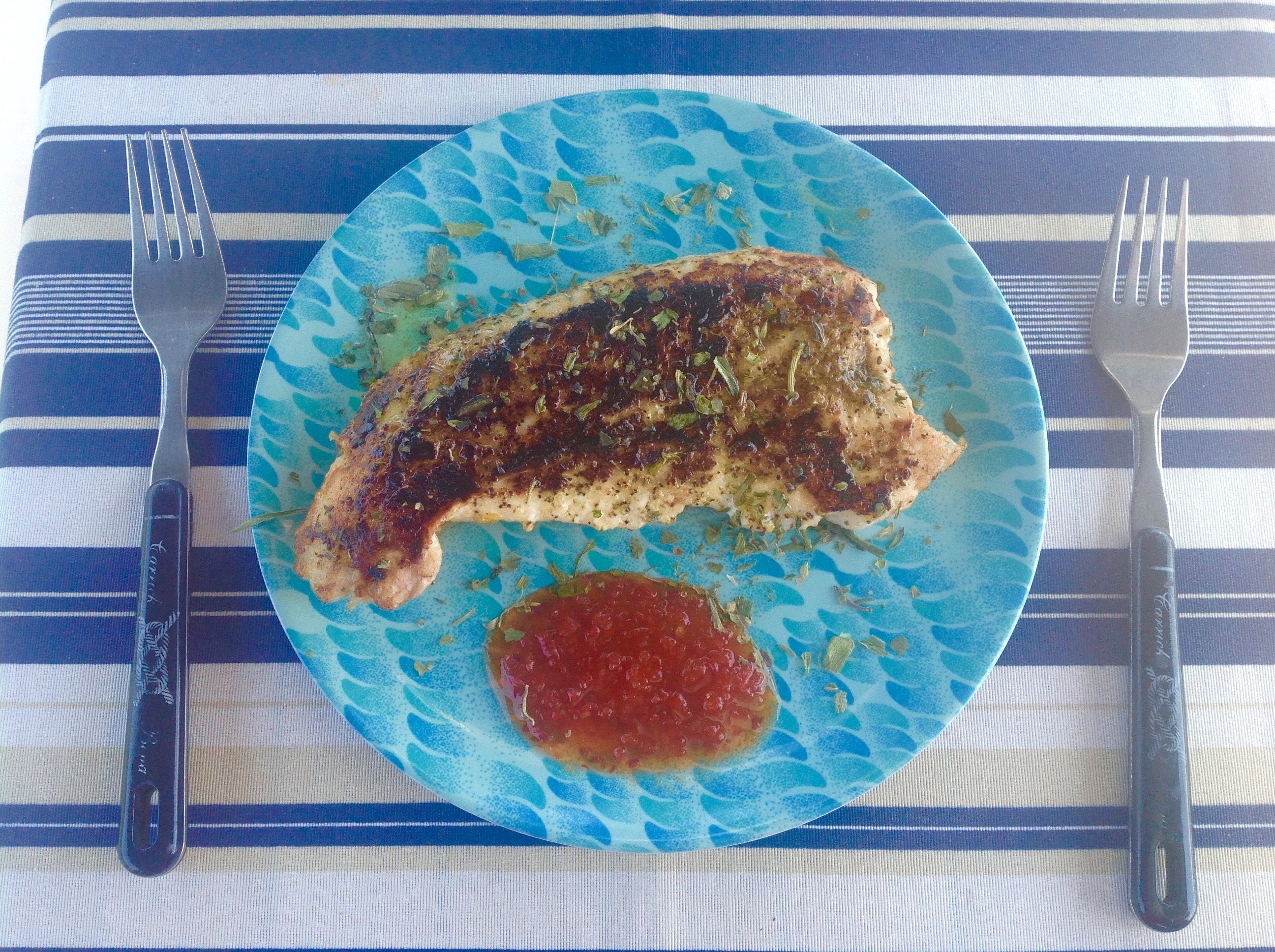 Antes do meio dia o Herman, do veleiro Oceanware passou e nos deixou metade do robalo que pescou ontem e eu o preparei grelhado com crosta de lemon & peper ficou muito bom, ainda mais que era peixe fresquinho pescado por nosso querido amigo!!