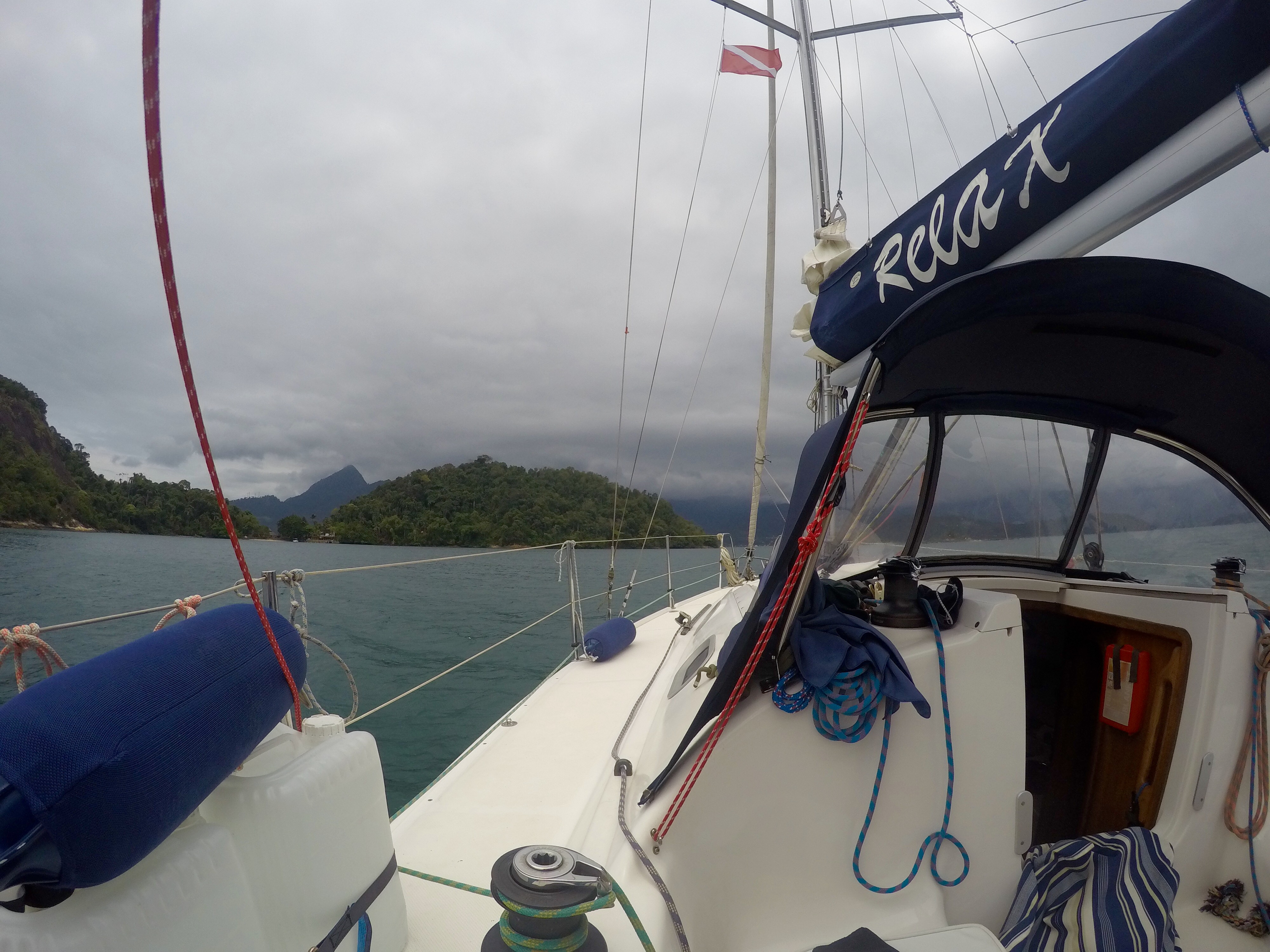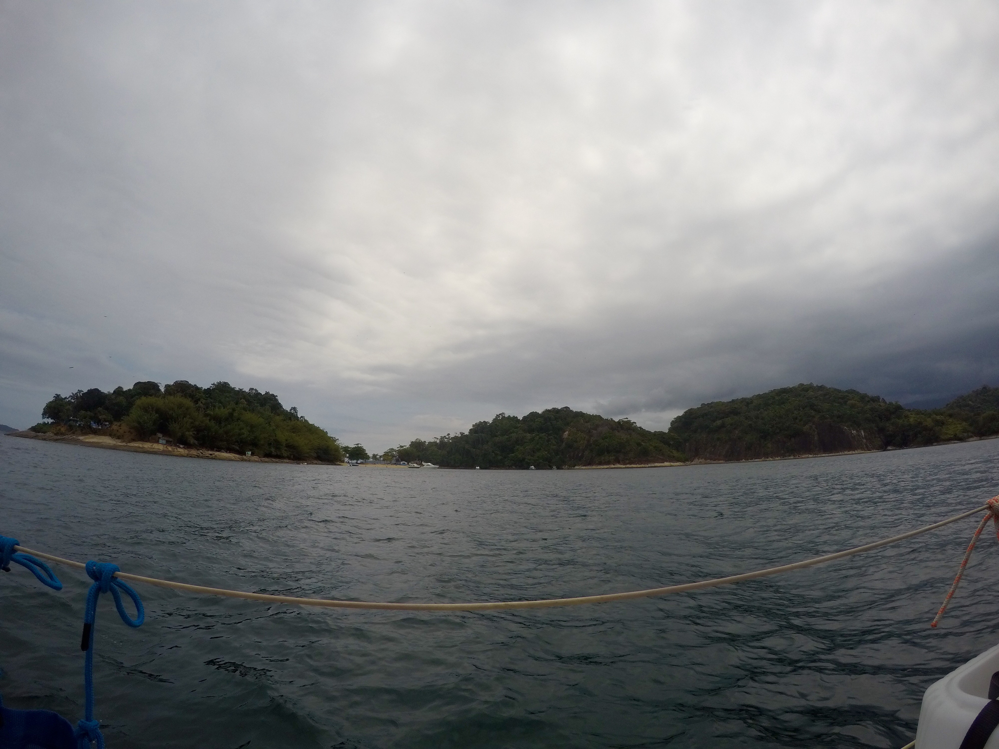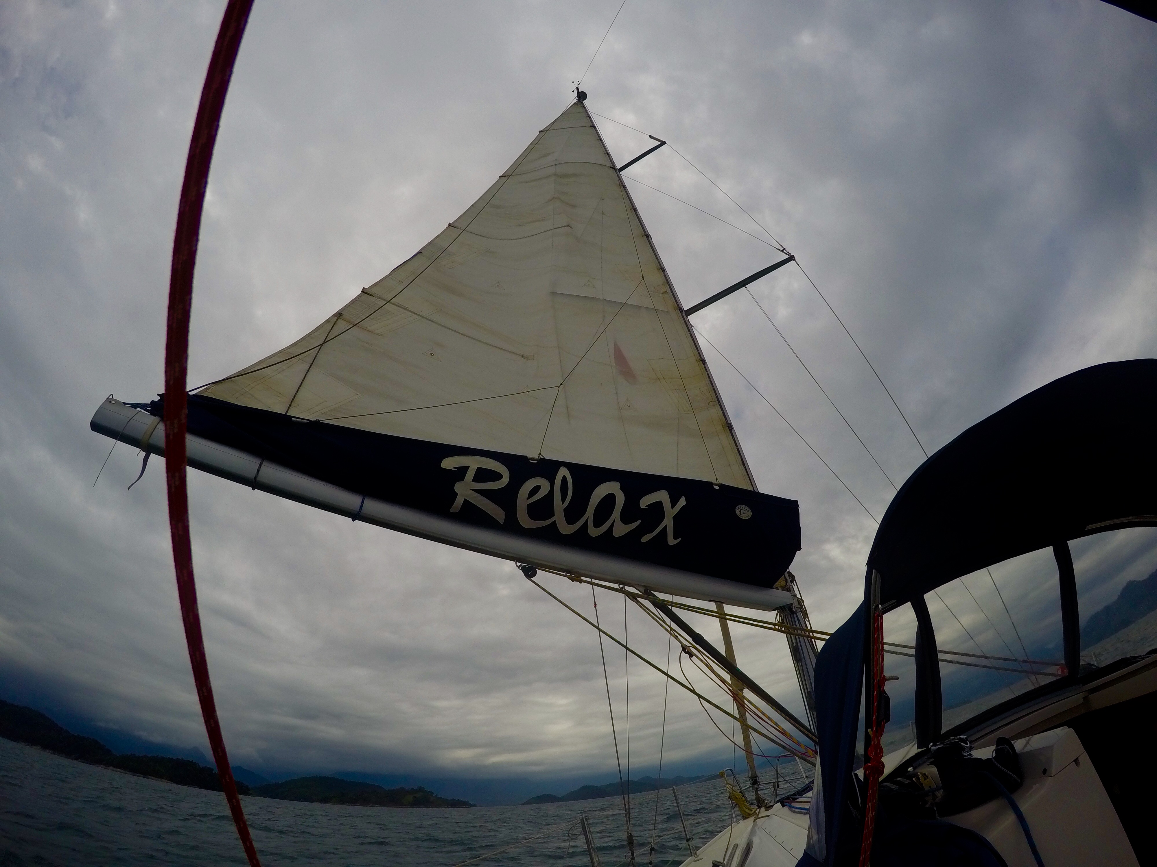 Dia 135 e 136 (03 e 04/11/16) quinta e sexta, Ilha Itanhanguá 🌞💨🌧. Estávamos planejando tirar umas “férias ” de Paraty e ir para Angra dos Reis. O Paisano decidiu nos fazer companhia e assim hoje, às 08:30h zarpamos da Ilha do Araújo rumo a Itanhanguá, nossa primeira parada. Motoramos na saída e logo entrou o vento e velejamos até a chegada.
