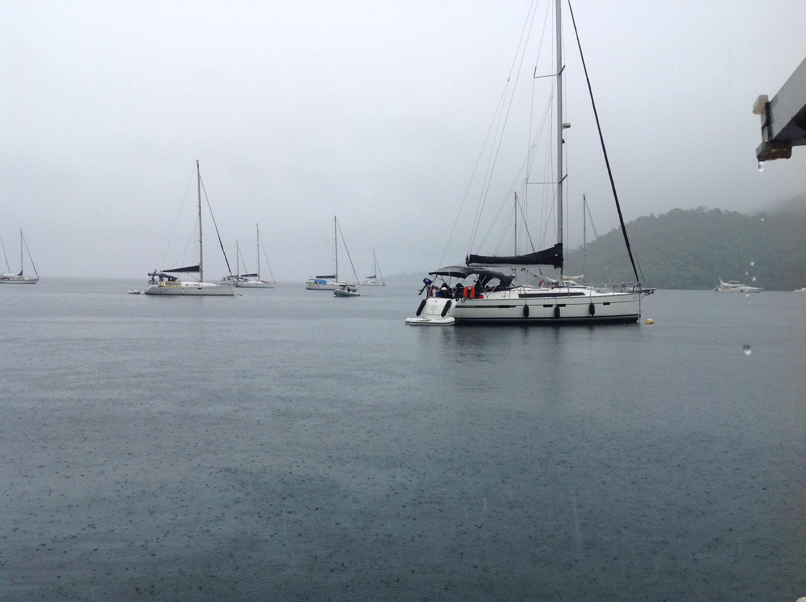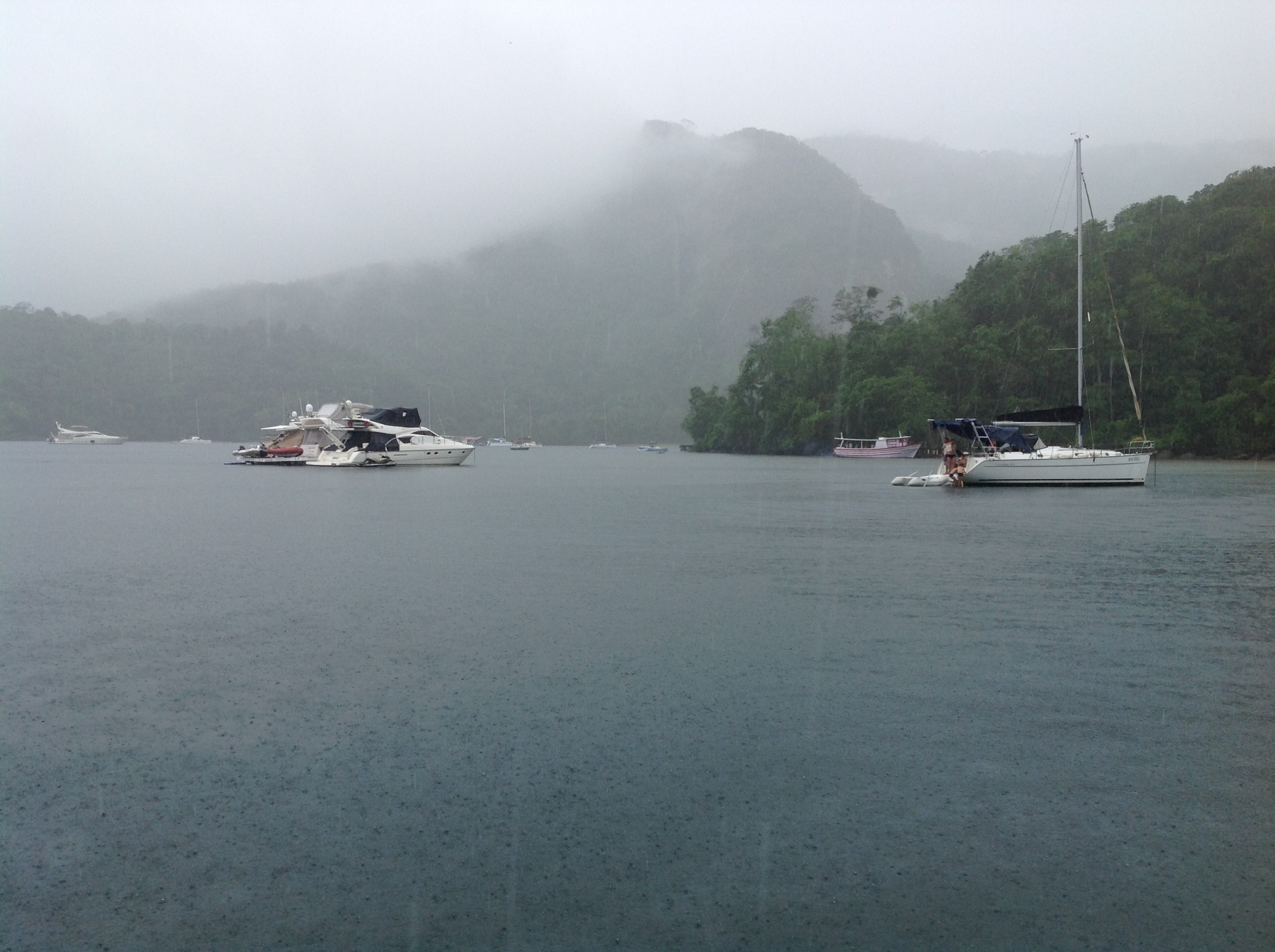 Dias 144 e 145 (12 e 13/11/16) sábado e domingo, Praia da Tapera, Sítio Forte, Ilha Grande 🌥☁️🌧🌧🌧🌧. Como os amigos velejadores bem sabem, quando o tempo é de chuva surgem algumas limitações nas atividades. O Renato até que nem sente, pois acaba fazendo tudo da mesma forma, eu, já não fico com a mesma disposição em sair de bote, me molhar, etc. porém não podemos reclamar pois desde que estamos morando a bordo poucos foram os dias chuvosos. Quando se tem amigos por perto é melhor, pois entre uma visita e outra, juntamos as receitas, jogamos rummikub e o dia vai passando rapidamente.