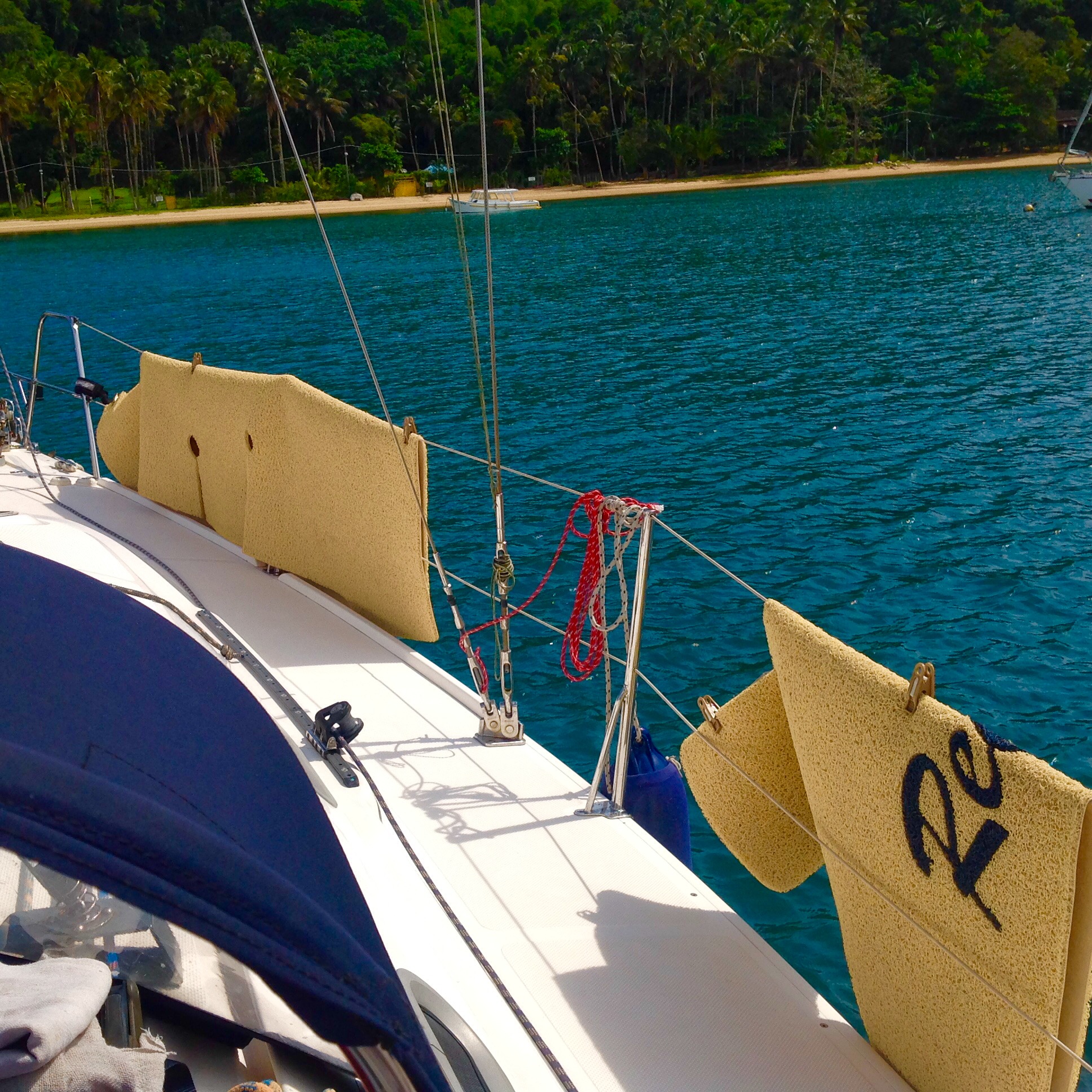 O Renato mergulhou para limpeza do casco, somente um fino limo. Como a faina foi grande almoçamos na Telma, que aliás é o Naude que cozinha e o peixe estava muito saboroso. Encontramos uma família que mora a bordo, a Ursula e o Boris do veleiro Espirit gitan e no final do dia recebemos uma breve visita do Nestor, do belo veleiro Vento. Dia lindo, feliz e produtivo. Namastê 🙏🏼