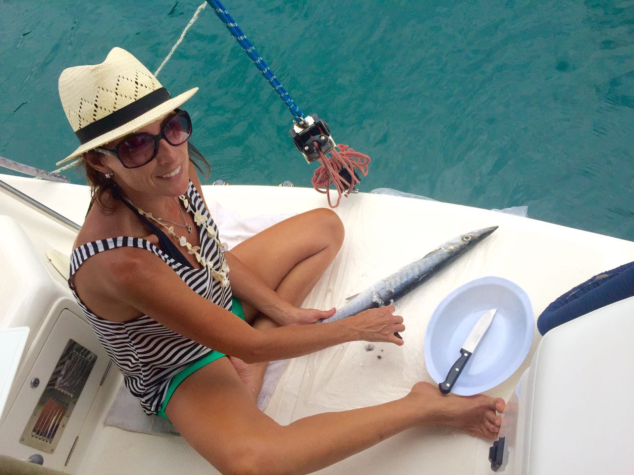 Chegamos em uma hora e lá fomos nós limpar o peixe na popa do barco. A estratégia para não sujar a popa é abrir um saco plástico e limpar o peixe sobre ele. Pedi ajuda ao Renato para temperar e assamos a bicuda que ficou uma delícia 🐟😀. Descemos para a praia no final da tarde e encontramos a Skipper Cris, que conhecemos no Bracuhy. Estava fazendo Charter para jornalistas que farão matéria para a revista da gol sobre a Ilha Grande e seus encantos. Deu tempo de standapear e depois retornamos o barco, onde a Bella nos aguardava cheia de saudades. Dia nota 10! Namastê 🙏🏼