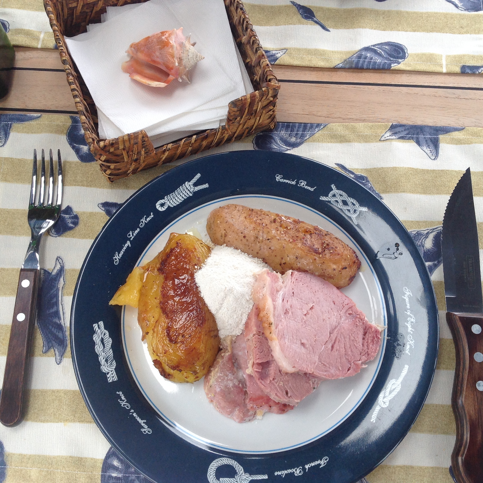 Mais tarde retornamos para o barco e o Renato foi para a cozinha fazer um assado de suíno, que encontramos no supermercado do Piratas, embalado a vácuo da marca Pamplona, que já usávamos em Curitiba e tem ótima qualidade e tempero. Não deu outra, ficou uma delicia 🐷.