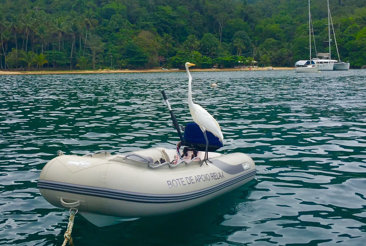 Dia 158 e 159 (26 e 27/11/16), sábado e domingo, 🌥🌤☀️, Praia da Tapera, Sítio Forte, Ilha Grande, RJ. Dia movimentado com a chegada de veleiros, catamarãs e lanchas, que se animaram com a previsão de fim de semana ensolarado. Sai remar de stand up e o Renato ficou enchendo o tanque de água doce” depois descemos para a praia, ficamos pegando sol na areia e brincando com a Bella, que cada dia está mais familiarizada com a praia e já começa a se soltar um pouco mais em relação ao mar. Fomos conhecer o bar “bacana’s”, que fica qui bem próximo. É um flutuante, bem arrumadinho, que serve porções e bebidas. Fica apoitado num local raso, com água muito transparente que se vê o fundo do mar e os peixinhos que ficam na volta. Gostamos do lugar, bom atendimento e boa comida.