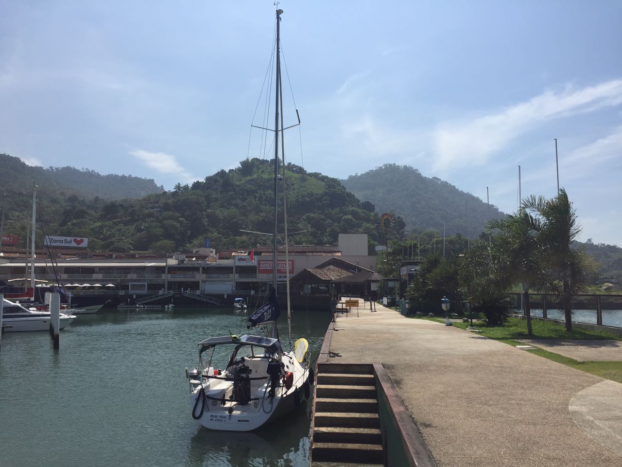 Dia 160 (28/11/16) segunda 🌤☀️☀️ Angra dos Reis, RJ. Hoje fomos para a Marina Piratas, abastecermos de combustível e de alimentos. Saímos após o café e motoramos até lá, pois não havia vento suficiente para abrir as velas.