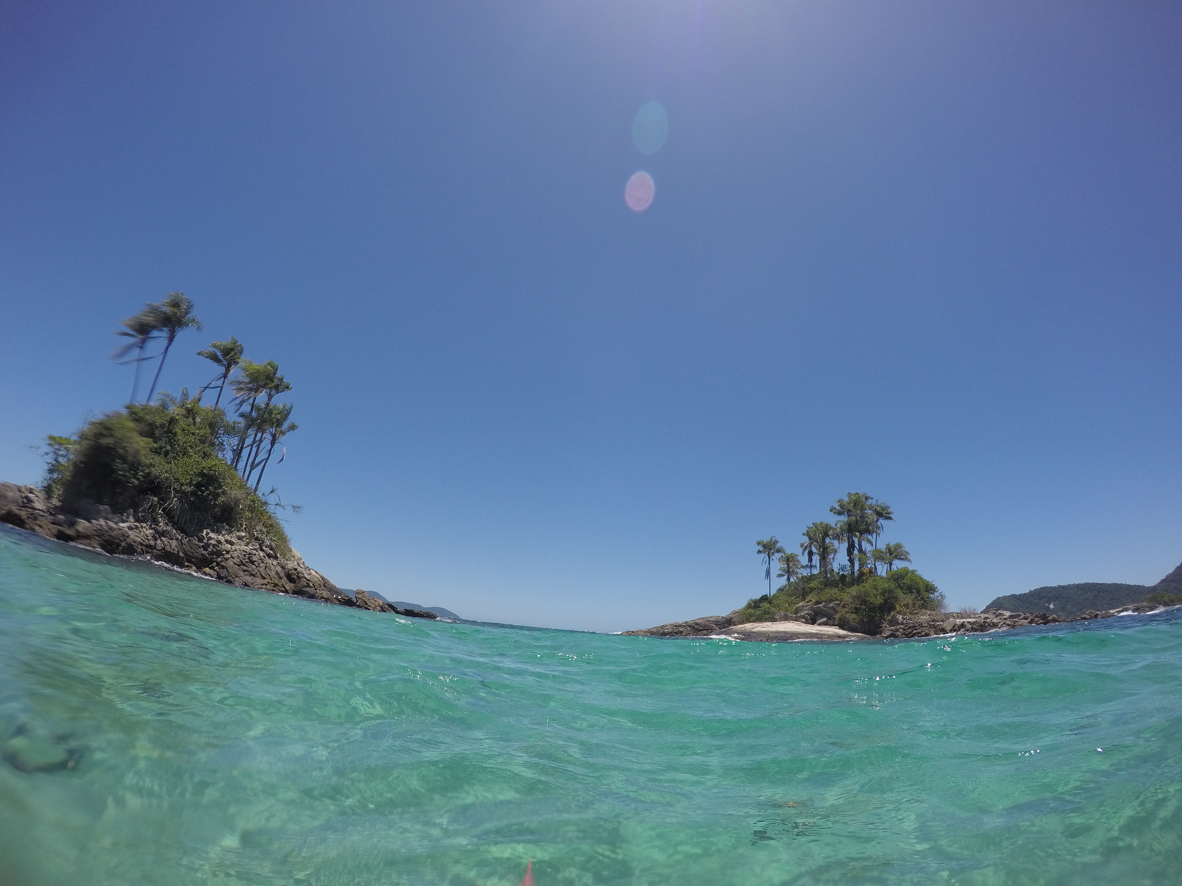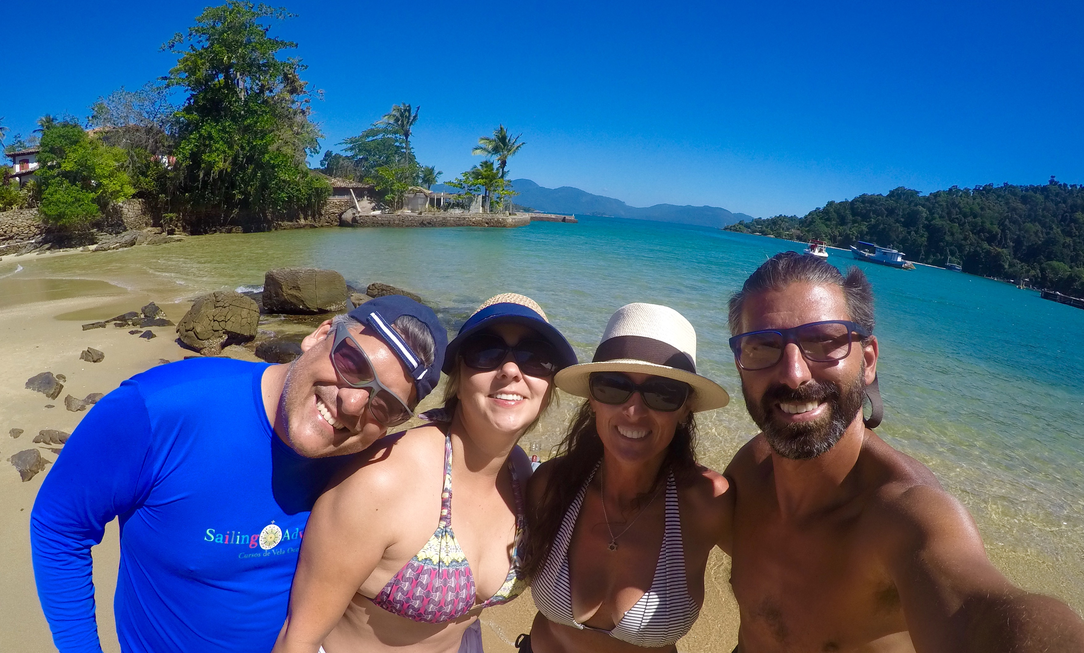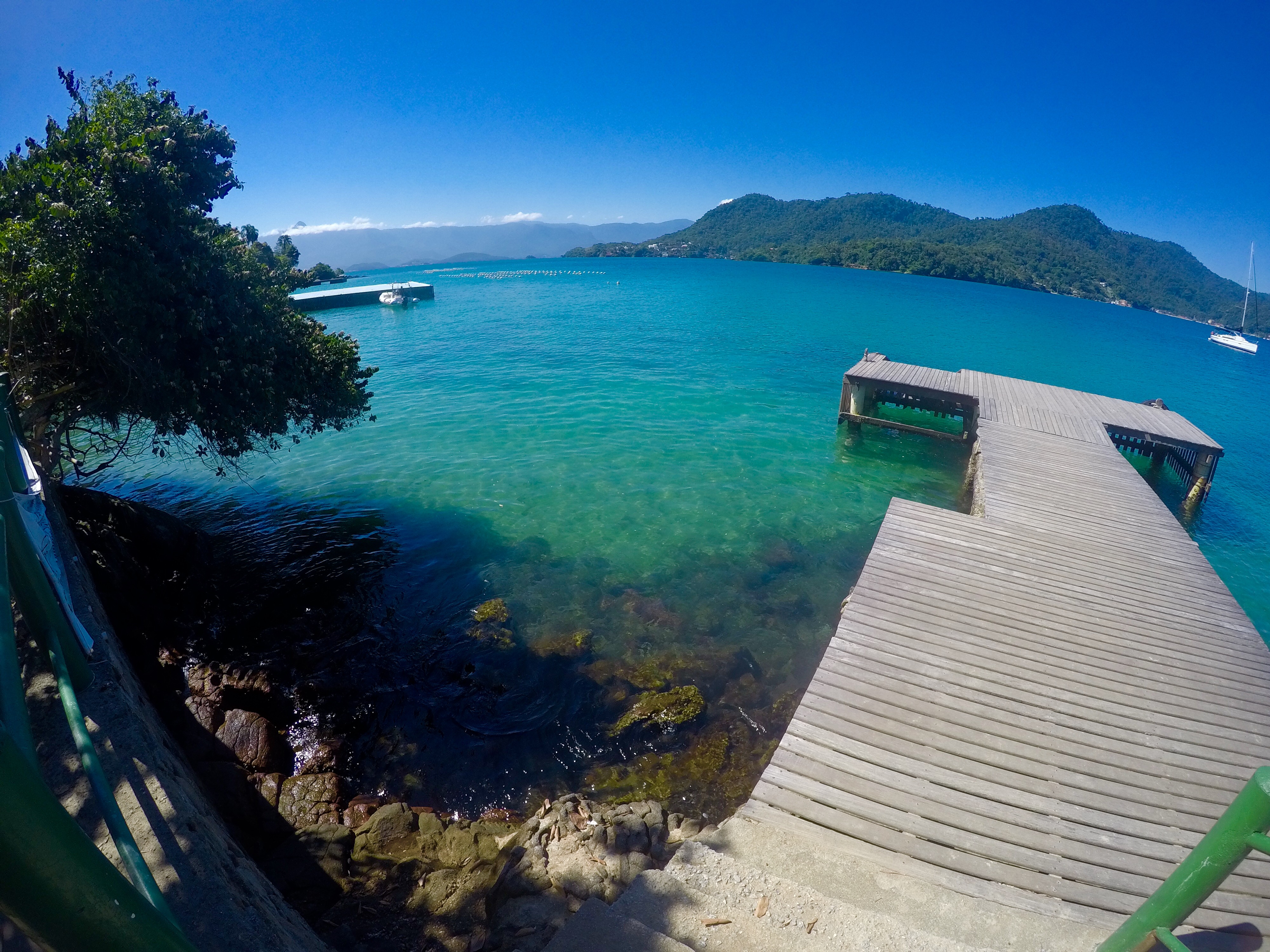 Dia 168 (06/12/16) terça ☀️☀️☀️, Ilha Botinas, Angra dos Reis, RJ. O dia amanheceu com o sol entrando pela gaiúta, descemos para a praiana nos exercitar e brincar com a Bella, pensamos em mergulhar em Ubatubinha, aqui ao lado, mas a convite do Grão fomos juntos para as Ilhas Botinas. Fica praticamente em frente à Angra dos Reis e as Ilhas são pequenas, somente rochas com alguns coqueiros sobre elas reparamos que estava bem limpo 👍🏻👍🏻👍🏻, sem indícios de pessoas por lá, muito embora seja um lugar super visitado, com um vai e vem de lanchas com muitos turistas a bordo, que param para mergulhar.