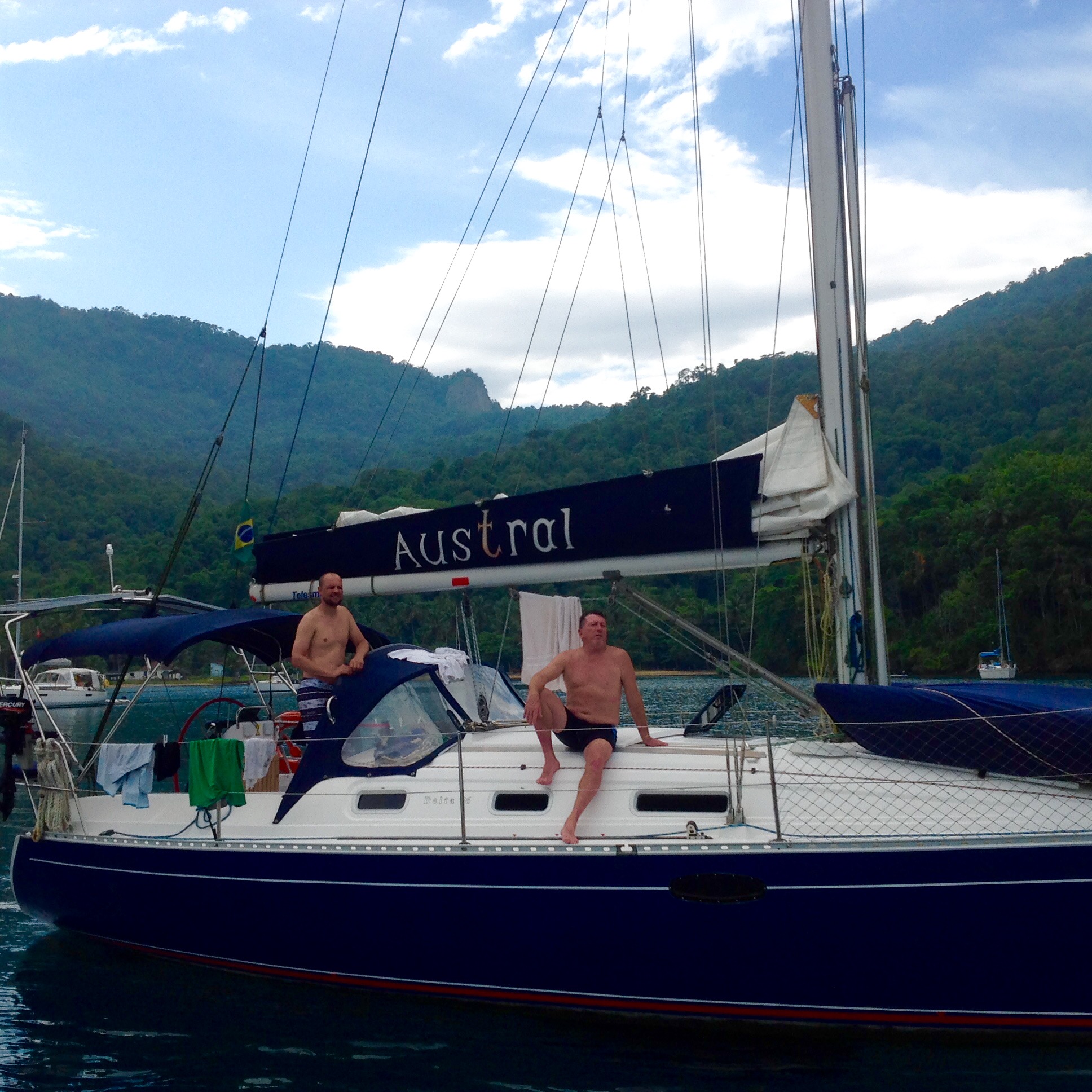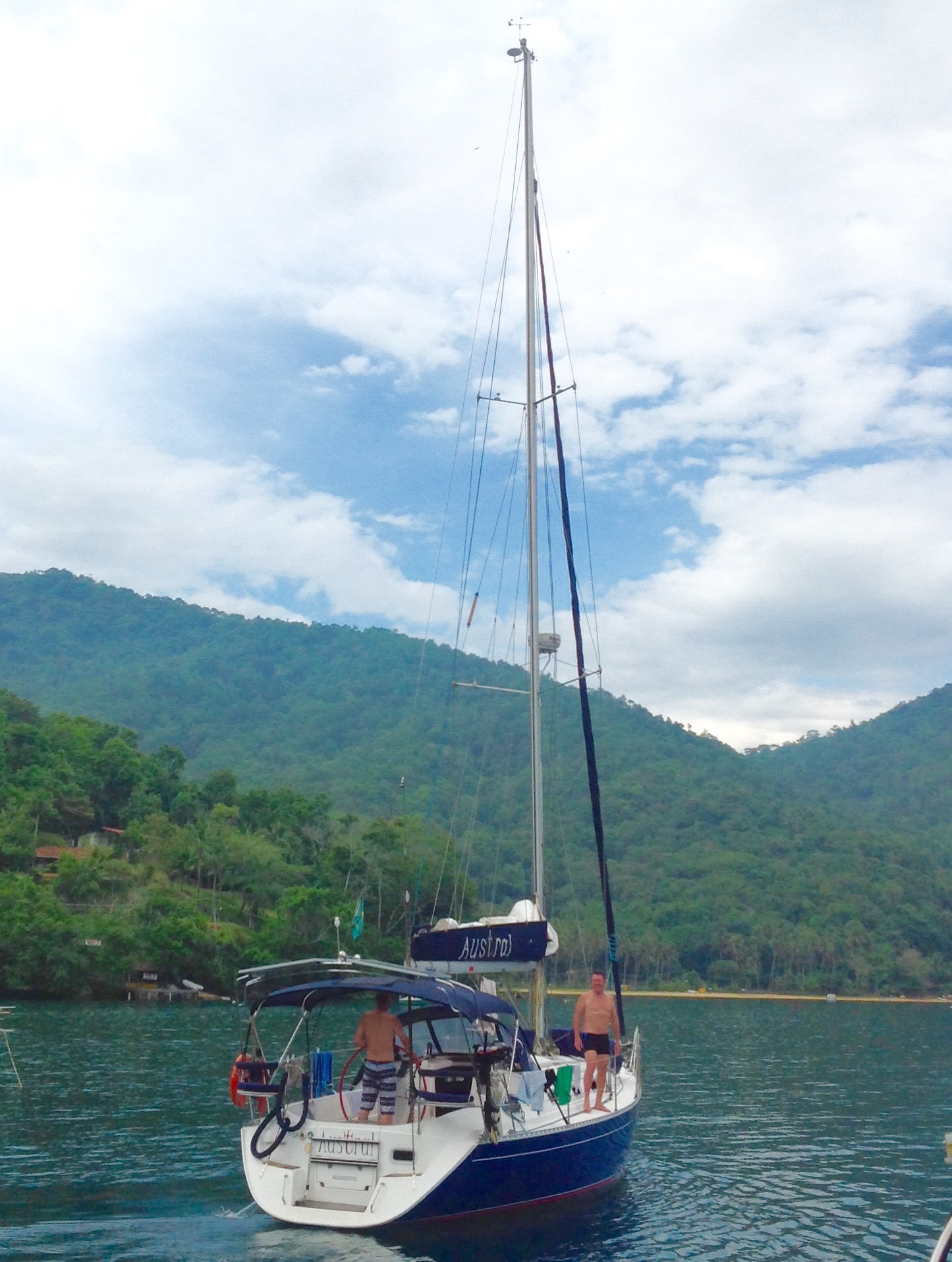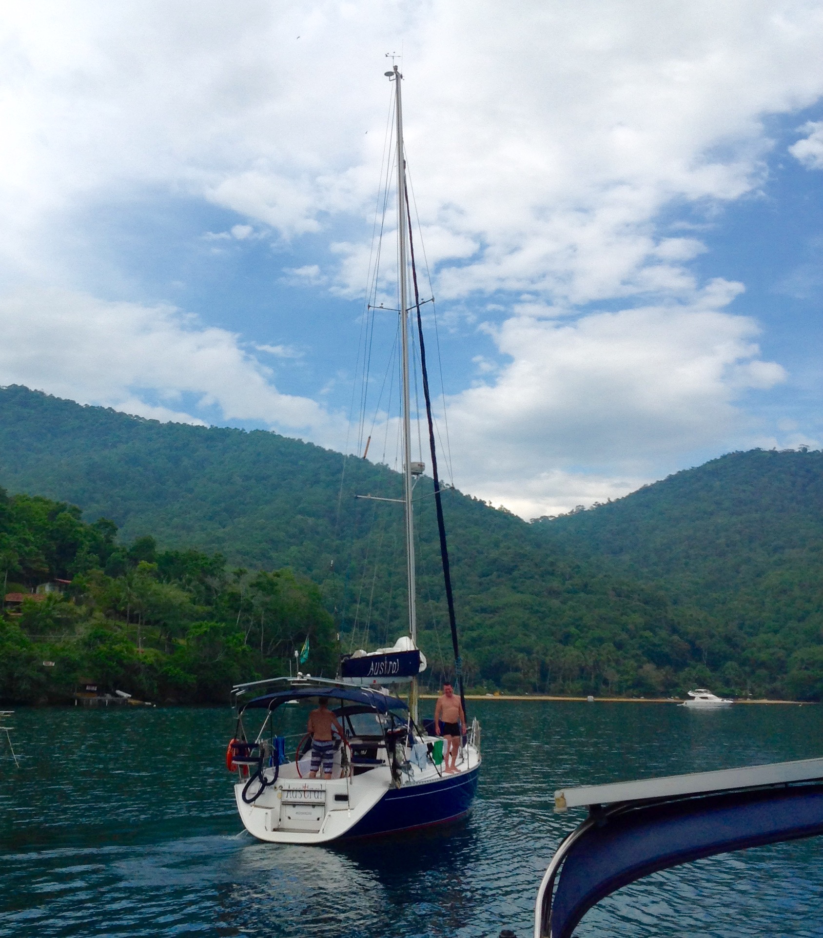 No meio da tarde chegou o Austral, barco muito bonito e sempre impecável, muito bem cuidado pelo Pádua, o Renato foi recebê-los e logo vieram para o Relax para o churrasco de boas vindas. O Pádua foi uma das primeiras pessoas que conhecemos quando compramos nosso veleiro e deixamos no Clube Náutico de Antonina, PR e ao longo desses anos temos construído com ele uma grande amizade. Pessoa alegre, divertida e sempre de bom “Austral” kkk.O Robson veio com ele para trazer o barco e relataram que foi uma viagem super tranquila e sem imprevistos. Caiu uma chuvinha e os meninos entraram na água para brincar. Noite tranquila.
