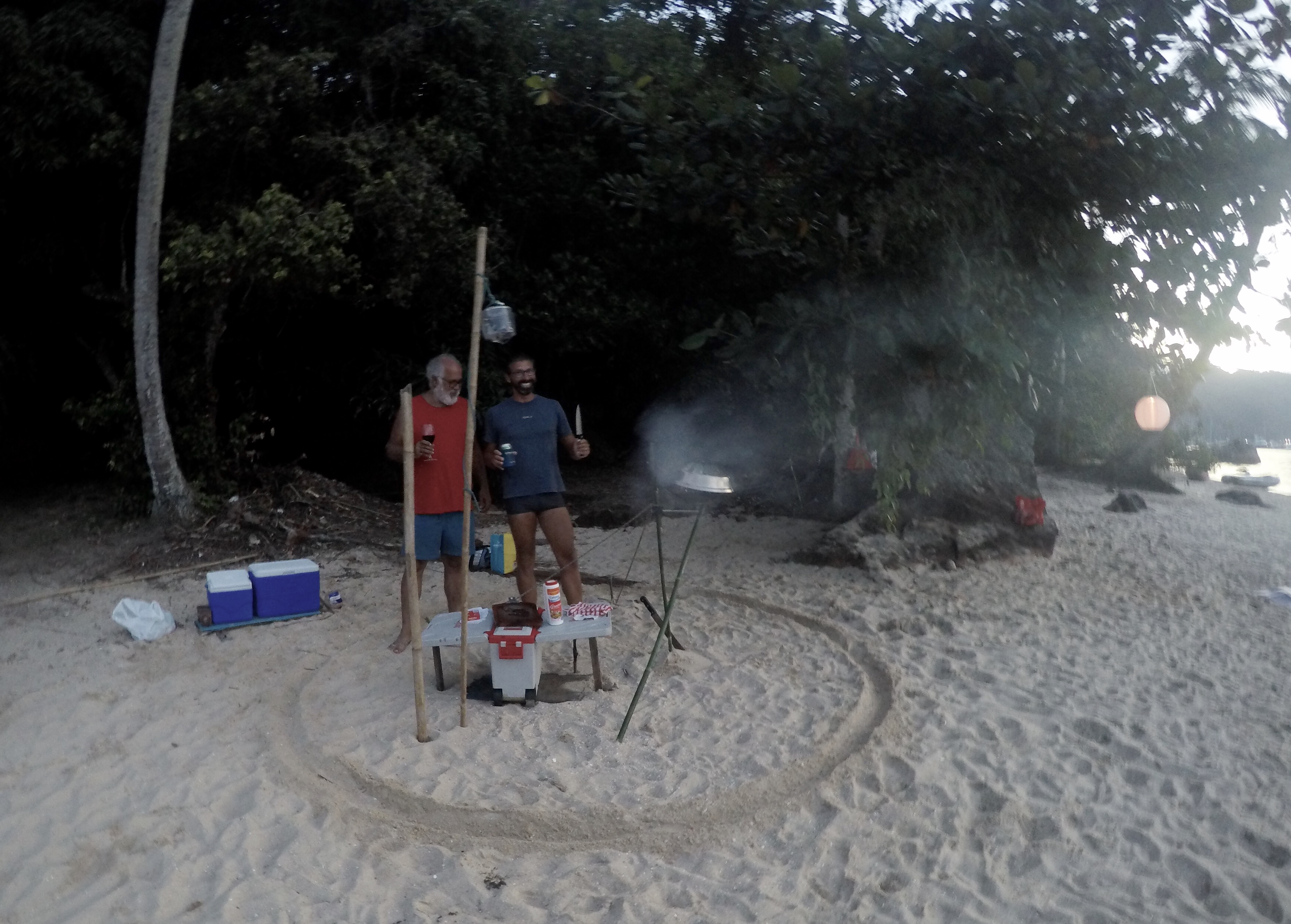 Os comandantes montaram um belo cenário com fogueira, lanternas e fixaram a churrasqueira em bambus e cabos, feito estais, para mantê-la na posição correta.