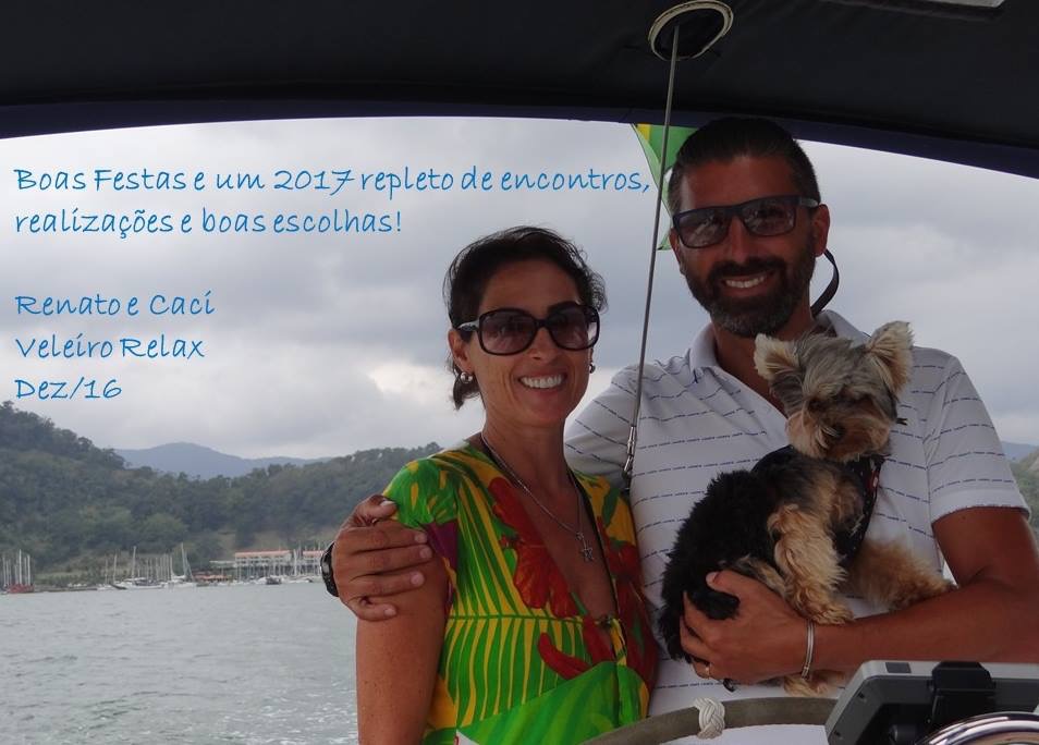 Dia 186 (24/12/16) sábado ☀️☀️☀️ Marina Piratas, praia da Tapera, Sítio Forte, Ilha Grande, RJ. Saímos às 9 ilha de Itanhanguá rumo a Marina Piratas, para abastecimento de combustível e supermercado. Como não sabíamos se haveriam três vagas no estacionamento, resolvemos ir somente no Relax e o Furioso e Teimoso ancoraram próximos do canal de acesso. Compras feitas, lanche, rumamos para o Sítio Forte, nossa base para os próximos dias na Ilha Grande. Local muito lindo e bem receptivo. Ancoramos numa poita do Nalde e o comandante orientou os outros veleiros sobre a laje na chegada e os locais para ancoragem. Todos ancorados, encontramos com o Prieto e a Sandra, do veleiro Tutatis, que vieram dar as boas vindas. Descemos de bote para a prainha, tomamos “leite de macaca” bebida típica daqui, feita com o côco. Combinamos ceiar mais cedo para aproveitarmos mais à noite de Natal e cada um leva um prato para a ceia. Como o Marco Antônio, do veleiro Furioso, estava esperando o papai noel, esperamos ele chegar pela gaiúta trazendo os presentes.