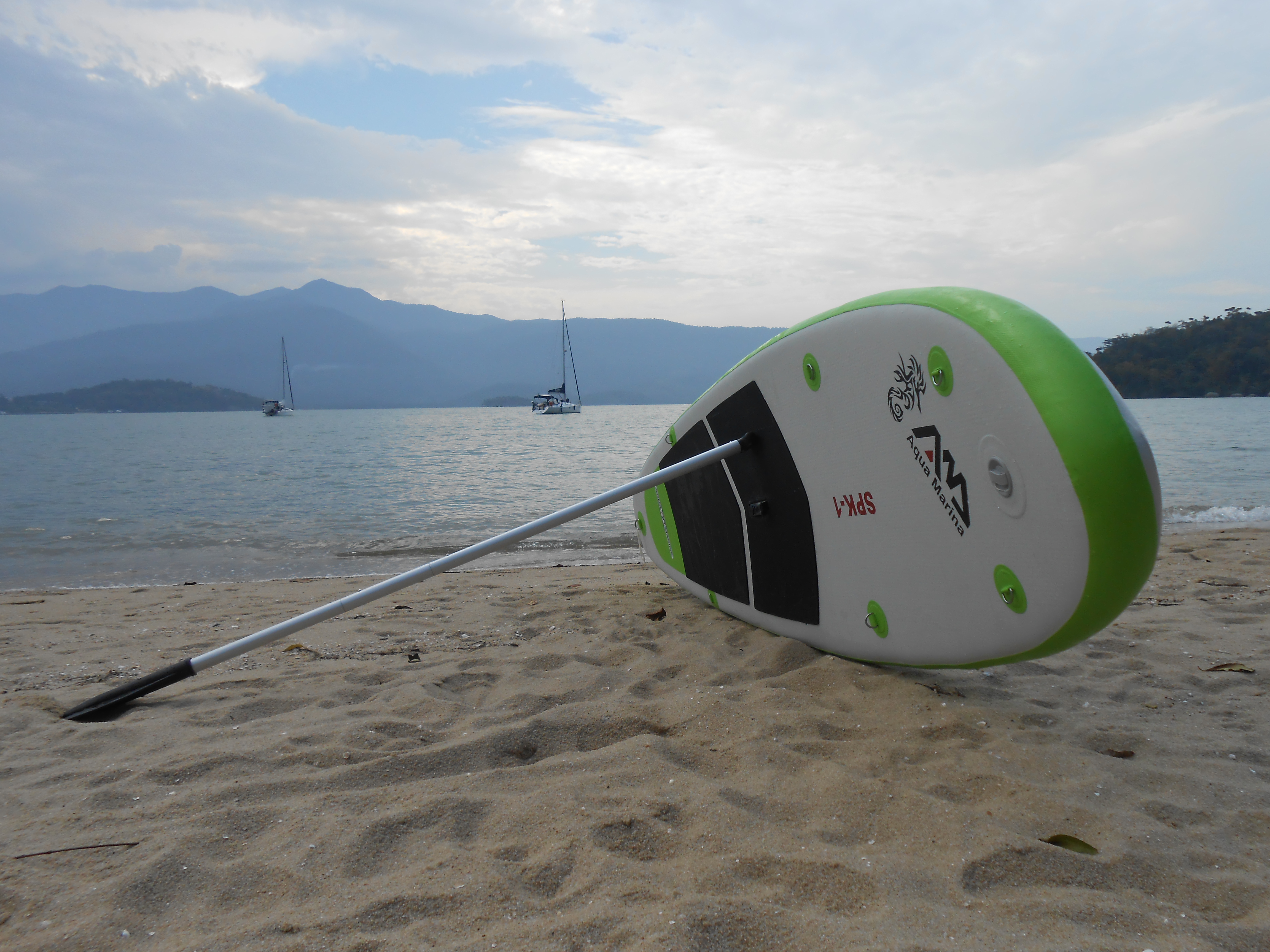 Passamos para frente nosso stand up antigo, pois estava bem queimado do sol e optamos agora por um inflável, com 10 pés e pesando 10 quilos apenas. Bem fácil de puxar e colocar na água, assim não dependo do Renato para colocar ou tirar da água toda a vez que quero usar.