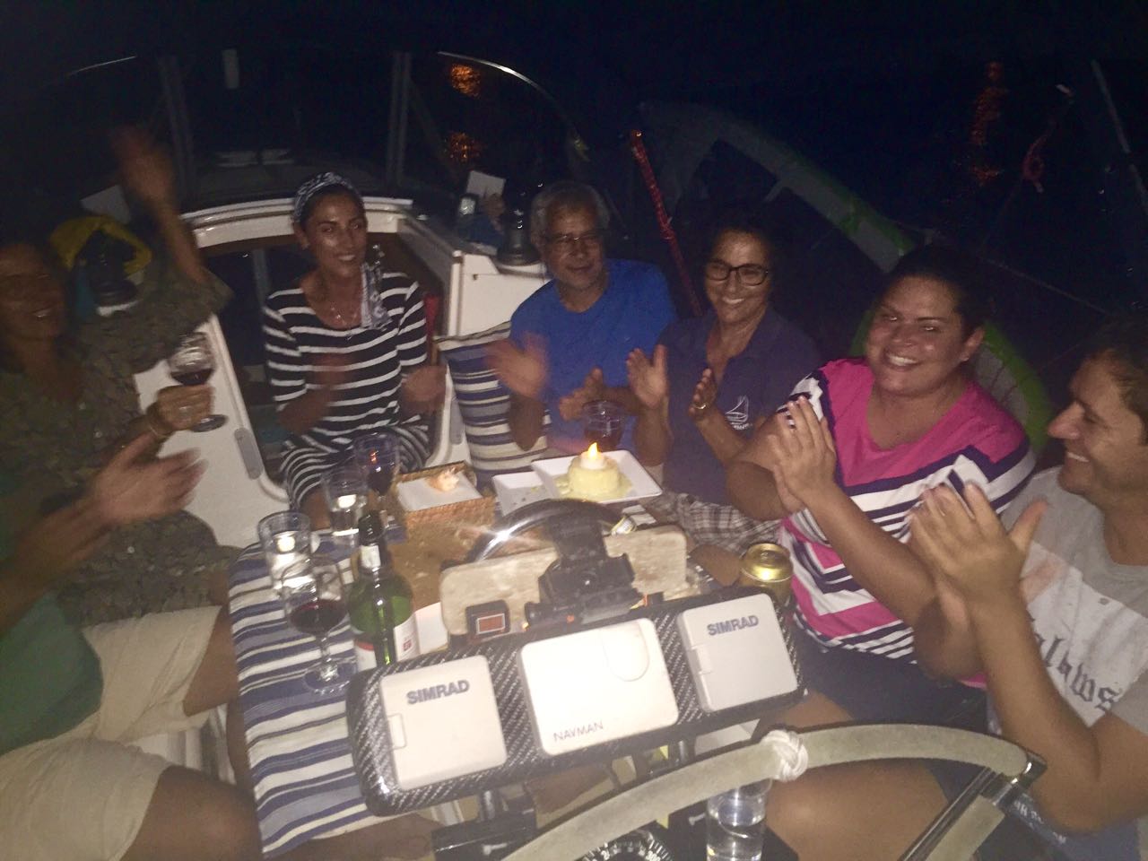 Descobrimos que o Jairo, do veleiro Caboges estava de aniversário e não deixamos passar em branco. Nos reunimos no fim do dia com a tripulação do Paisano, nossos amigos Helena e Artur e com o Jairo e a Bruna do Caboges para brindar o aniversário.