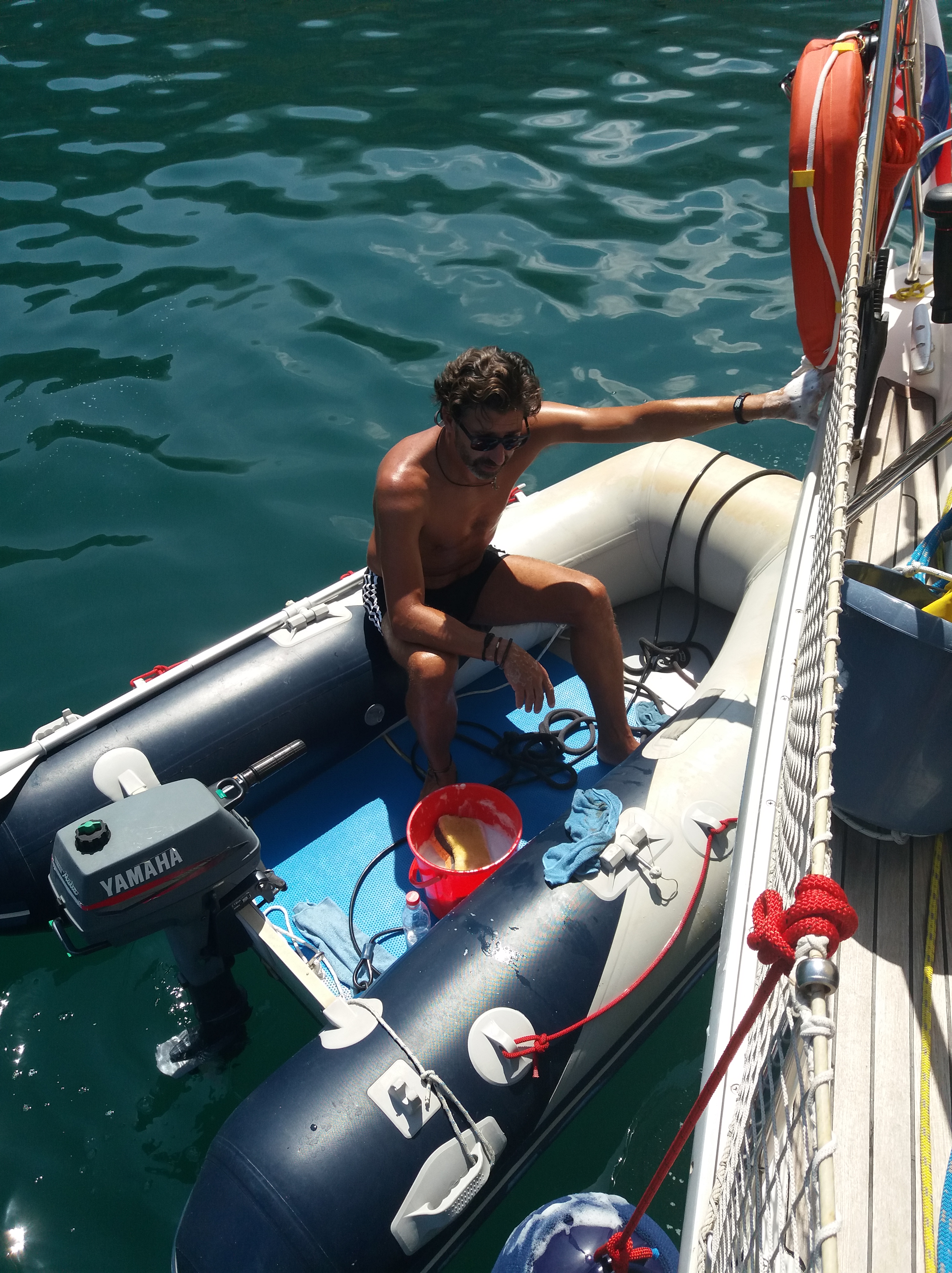 Estamos a mais de 60 dias no mar e temos feito a manutenção e conservação da Pharea e do bote de apoio de forma contínua, limpando o costado, as peças de inox, conferindo os cabos, hidratando a teka e a mantendo limpa, aproveitando a água da chuva para adoçar o cockpit, enfim diariamente há o que ser feito e assim também vamos ocupando nosso tempo livre.