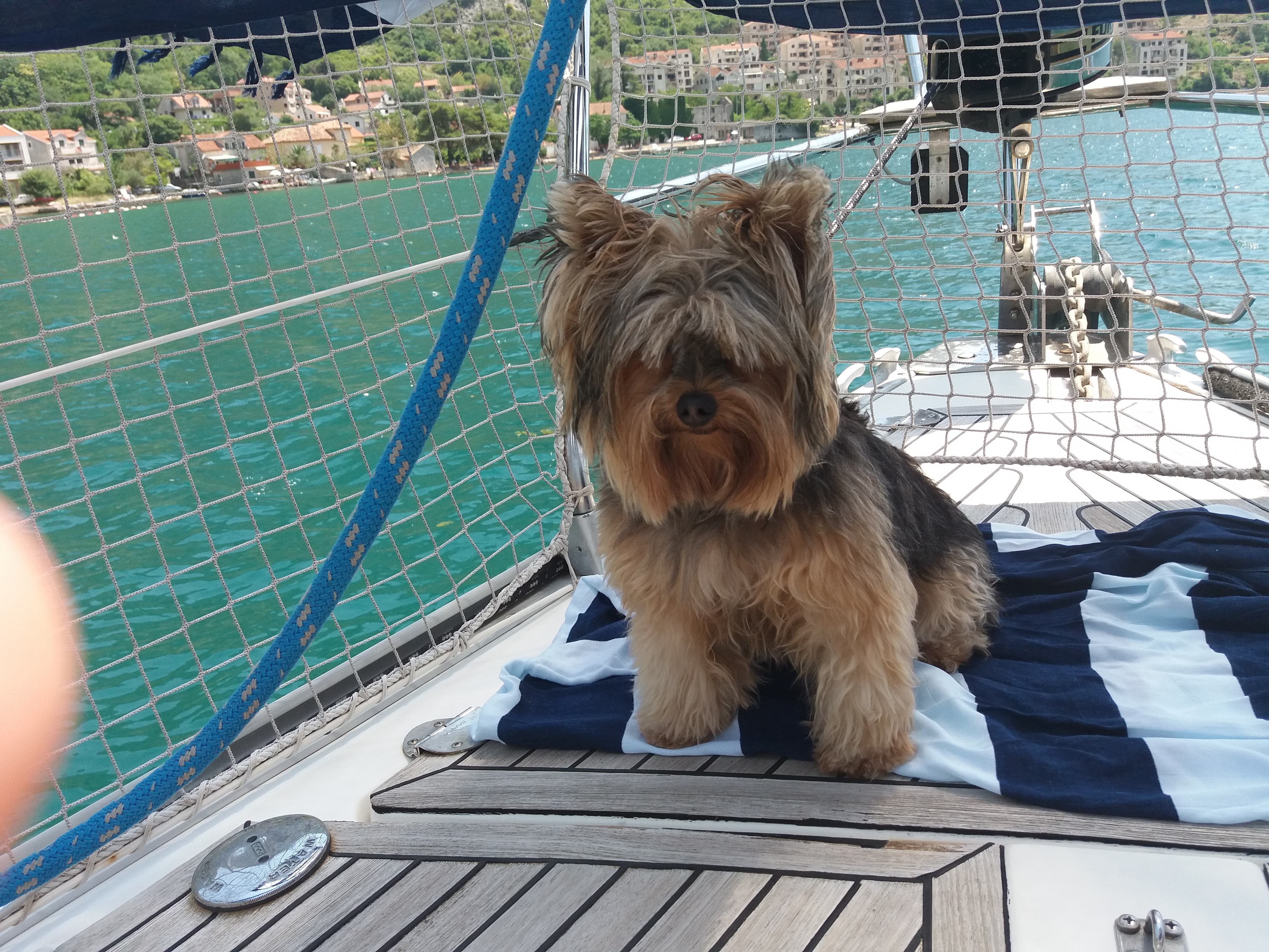 No convés, quando estamos de tro-lo-ló na proa, fizemos uma tendinha para ela se abrigar do sol. Não vimos muitos cães por aqui, existem sim muitos gatos 🐱, na rua! Nos muros, nos jardins… por todos os lugares. Os pets vendem produtos mas não vimos nada quanto a banho e tosa, assim diariamente passo a rasqueadera na Bella, limpo seus olhinhos e as vezes aparo seu pelo, é claro que tudo isso é possível…sempre em troca de um biscoitinho kkk. Namastê 🙏🏼