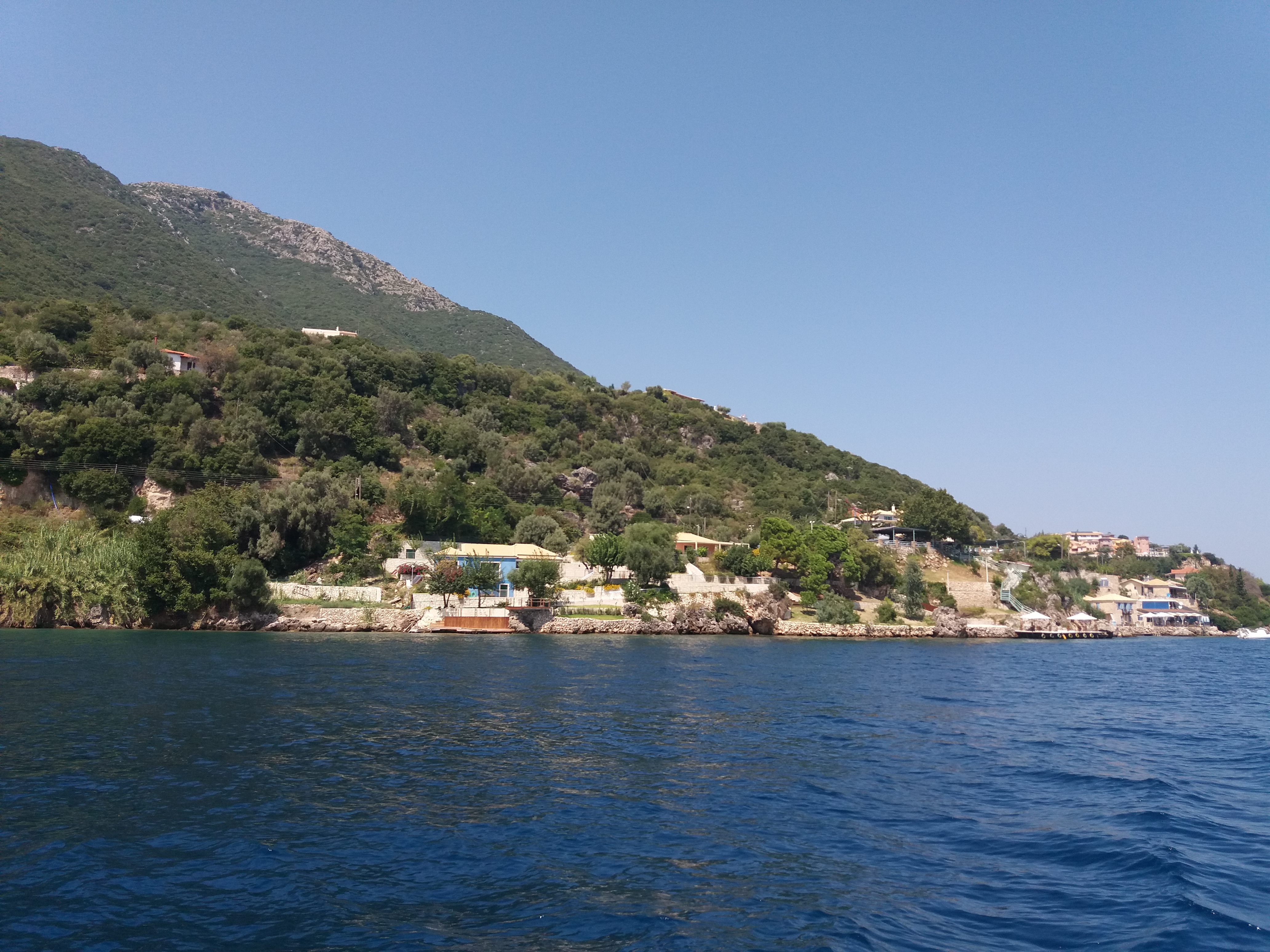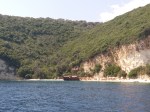 Havia uma escuna com turistas mas tudo bem organizado, sem gritaria nem música alta… ao longo do dia chegaram lanchas e veleiros para curtir a praia de seixos rolados, tomar banho de mar e no final do dia ficamos sozinhos no paraíso kkk. Pela manhã (02/09) acordamos e tomamos um banho de mar, água transparente a 32 graus, simplesmente maravilhoso! Levantamos âncora e rumamos mais ao sul da ilha Lefkas.