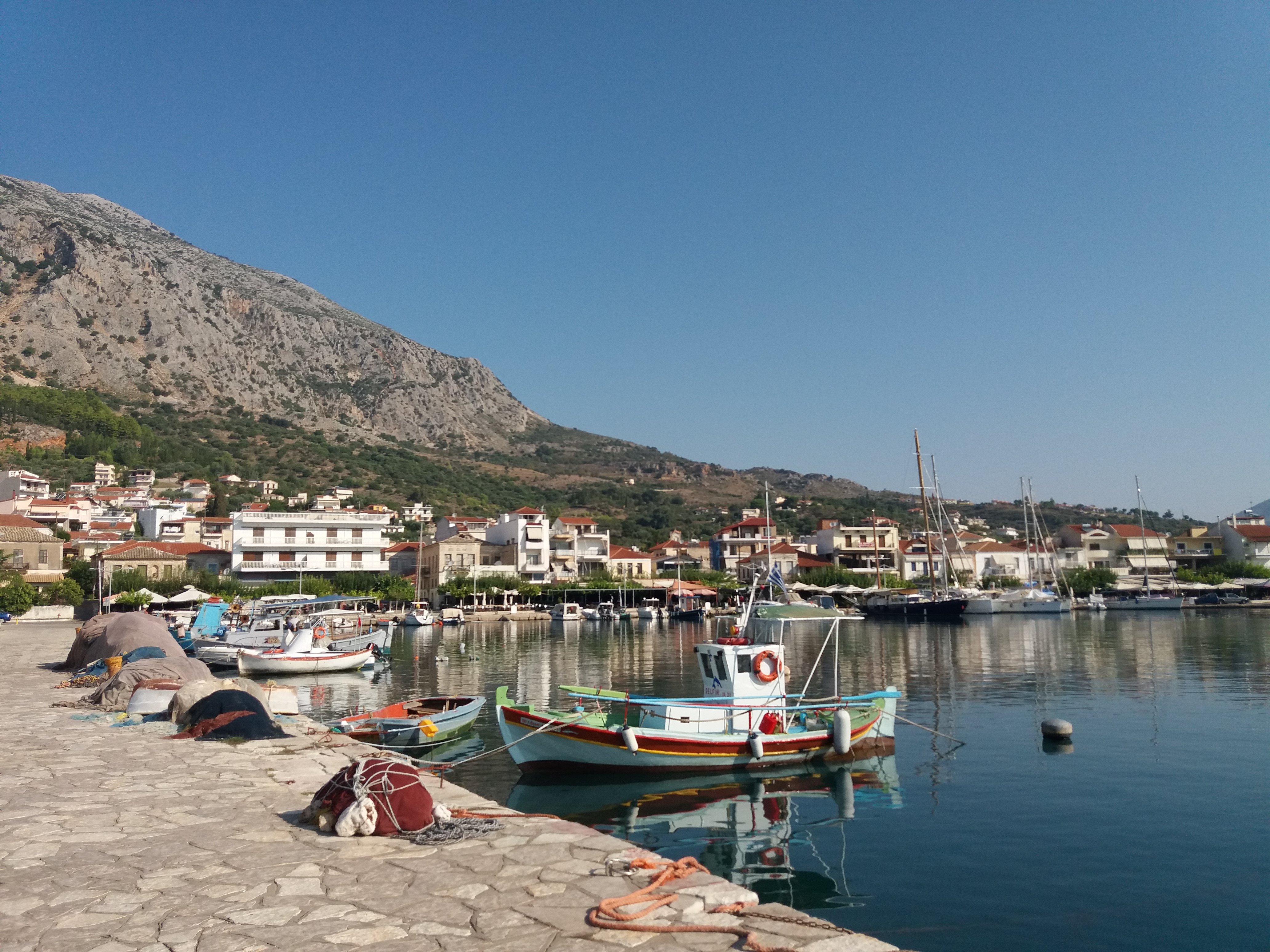 chegando lá, ancoramos em frente a cidade (38°31.751’N / 21°4.626’E, 10-20m) e de frente para o Monte Veloutsa, com 930m, já era início da noite… bom poder ancorar e descansar.