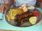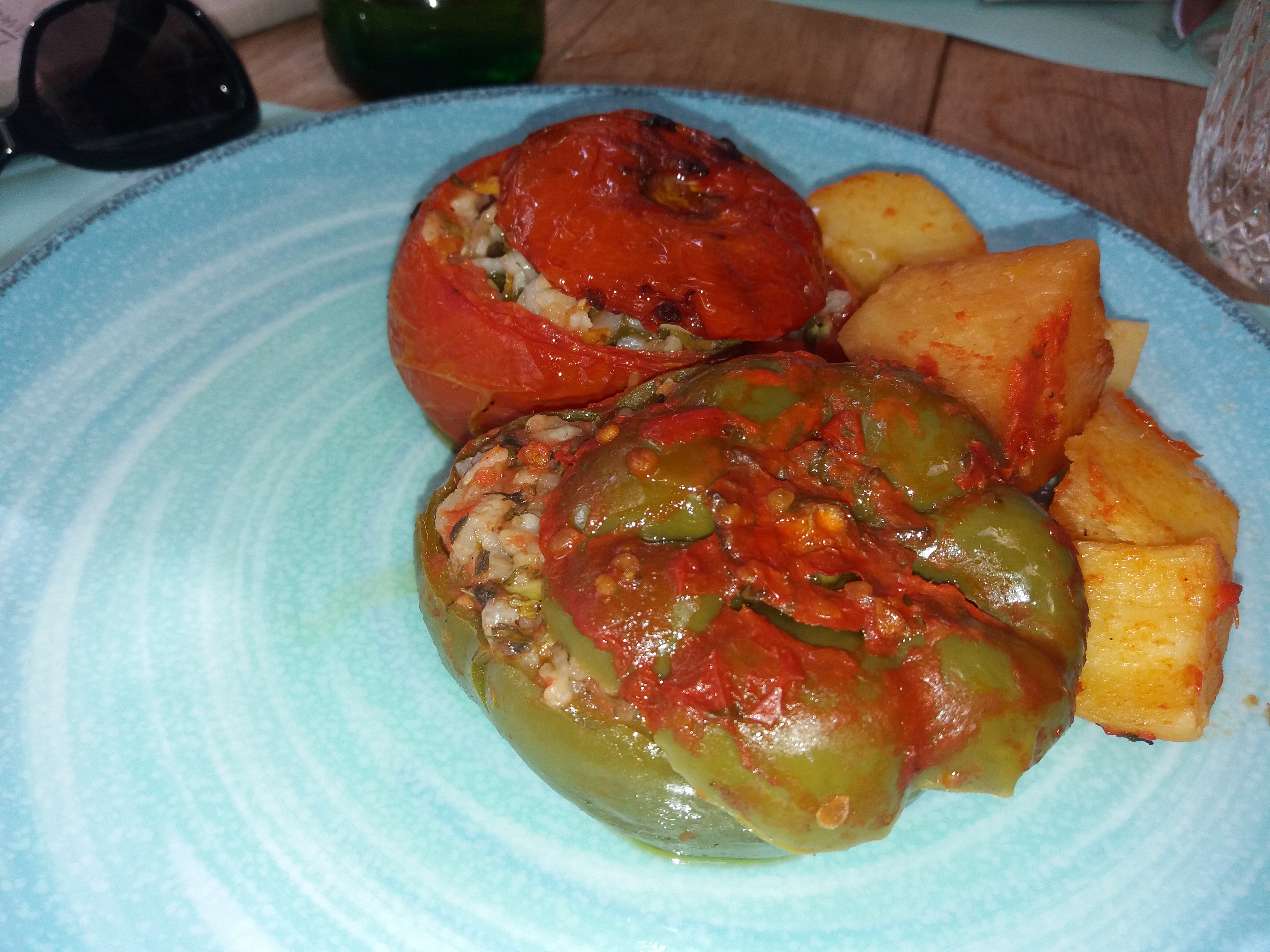 Gyros, Moussaka, Souvlaki, Yemista, salada grega, Kebab, iogurte grego e Ouzo, uma bebida típica feita de anis, tudo muito gostoso e com porções gulosas, digo, enormes! Nas ruas as calçadas são arborizadas com cítricos, pés carregados de laranja e limão na cidade toda.