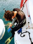 Em nossa saída, quando fomos recolher a âncora uma má surpresa… a âncora estava presa numa ancora tipo garatéia no fundo do mar…. o Renato colocou sua roupa de mergulho e desceu para ver o que havia… como estávamos ancorados com 12 metros, tivemos que chamar um mergulhador com equipamento de mergulho para desenrolar a corrente e lá se foram 200 euros… e tivemos a impressão que isso é bem rotineiro por lá… talvez por este motivo não tirem os entulhos jogados no fundo da enseada… uma pena. Namastê 🙏🏼