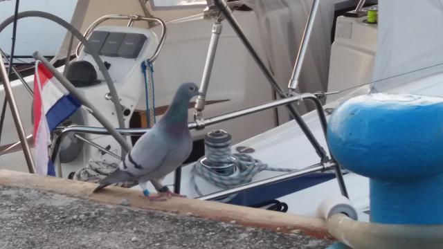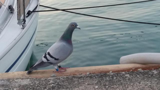 Por três semanas tivemos a companhia de um pombo correio que chegou e ficou andando no píer onde estávamos atracados. Estava cozinhando e de repente ele surgiu e colocou a cabeça para dentro da gaiuta… Levei um baita susto. Achamos que poderia estar com fome e o Renato o alimentou com milho de pipoca e água e ele se esbaldou.
