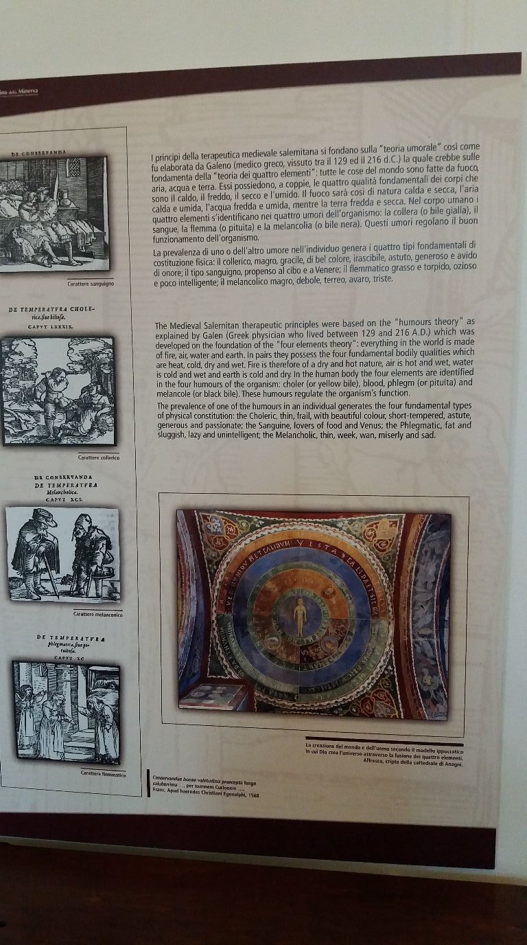 Ficamos surpresos com a teoria umorale, elaborada por Galeno, médico grego, por volta do ano 216 d.C., e de saber como num simples jardim foi produzido tanto conhecimento a ponto de a Faculdade de Medicina de Salerno ter sido a primeira e mais importante instituição médica da Europa, na Idade Média, e a precursora das universidades modernas.