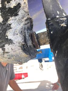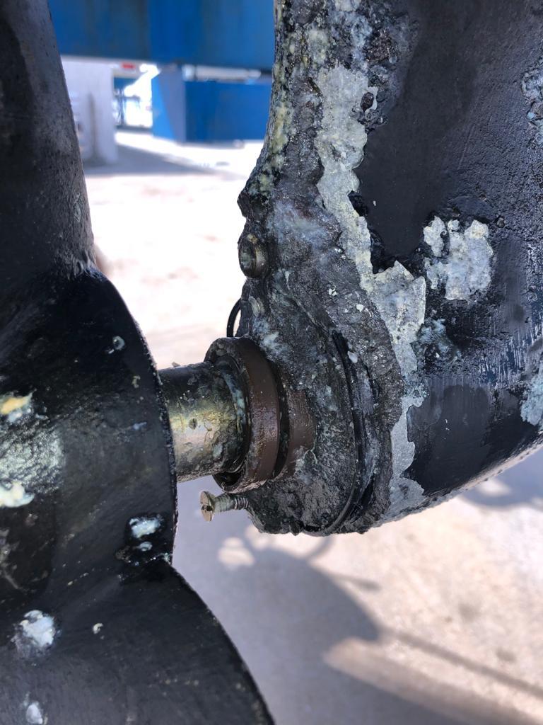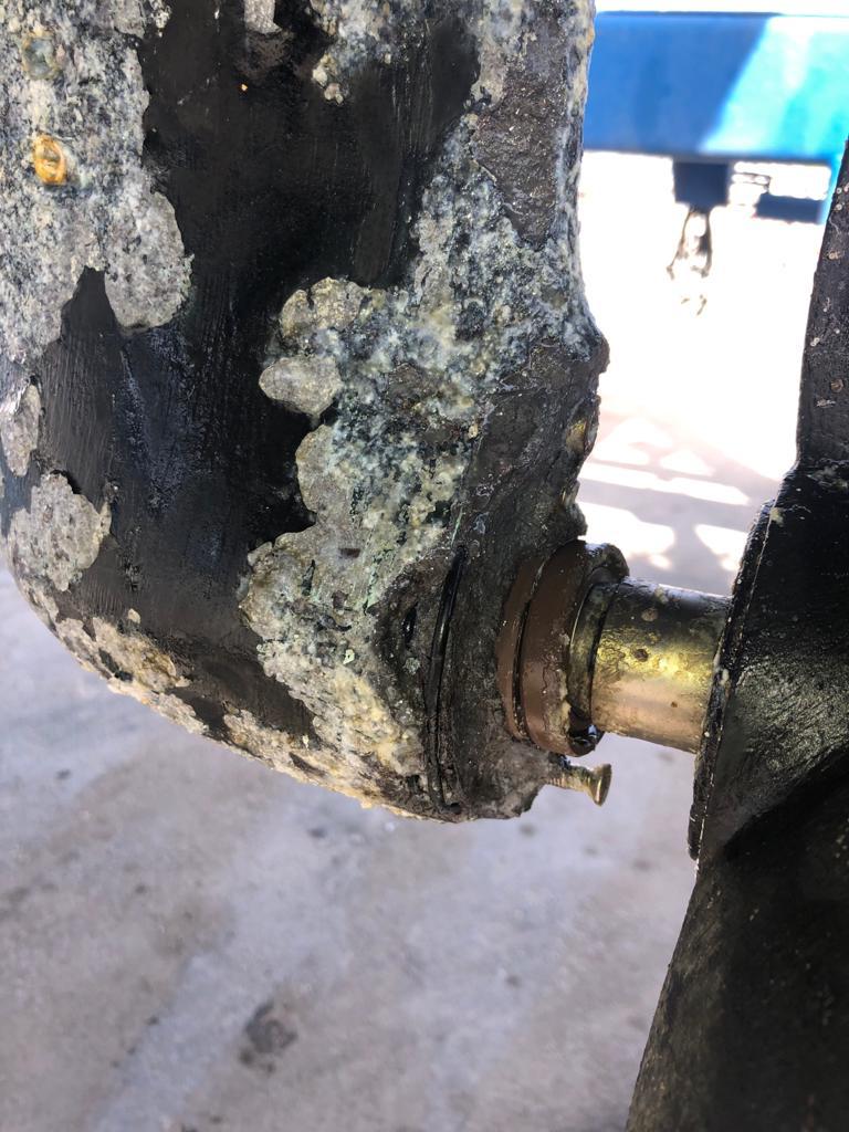 “Quando partimos de Siracusa, Itália 🇮🇹, em direção à Monastir, Tunísia 🇹🇳, em novembro de 2019, no través de Portopalo  pegamos uma rede de pesca ou algo parecido na quilha e rabeta do barco. Senti a velocidade do barco cair de 6,5 para 2 knots. Rumamos para Portopalo onde ancorei e mergulhei para verificar se havia algo preso ou algum dano. Nada, tudo certo. Com a proa novamente para Monastir partimos. Após nossa chegada em Monastir, era hora das manutenções preventivas e entre elas a troca de óleo do motor e check do óleo da rabeta. Para minha surpresa o óleo da rabeta estava “leitoso” com aspecto esbranquiçado, o que significava que havia água misturada com o óleo. Imaginei que a suposta linha de pesca pudesse ter entrado no eixo da rabeta e danificado os selos de vedação. Como não iríamos navegar pelos próximos meses decidi tirar o barco da água somente no final do inverno para substituir os selos. Bem, no final do inverno veio o Covid-19 e o lockdown. Então após a abertura das fronteiras pela Tunísia, no final de junho, fomos tirar o barco da água para substituir os selos de vedação. Tudo acertado com o estaleiro para subir o barco e deixar ele no travel lift enquanto trocaria os selos, serviço de no máximo uma hora. Para minha surpresa, quando tiramos o barco da água, o problema era muito maior que os selos de vedação. Nos meses em que ficamos parados no pier da Marina, nossa rabeta foi atacada, ou melhor, destruída por um processo chamado eletrolise galvânica. Vejam abaixo as fotos da rabeta em novembro de 2019, quando substituí a borracha interna de vedação e as fotos da rabeta em julho de 2020 aqui na Tunísia.