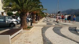 O calor estava intenso e tivemos um dia de praia, após atravessar toda a cidade, finalmente chegamos numa linda praia de seixos rolados. Valeu a pena o esforço. Permanecemos quase dez dias aqui ancorados, saíamos as vezes para um passeio de bote e para entrar no mar, pois aqui como é fundo de baía a água não é muito clara, tem um tom esverdeado. Neste tempo aproveitamos a facilidade do pier e nos abastecemos de água mineral e também enchemos os tanques do veleiro.