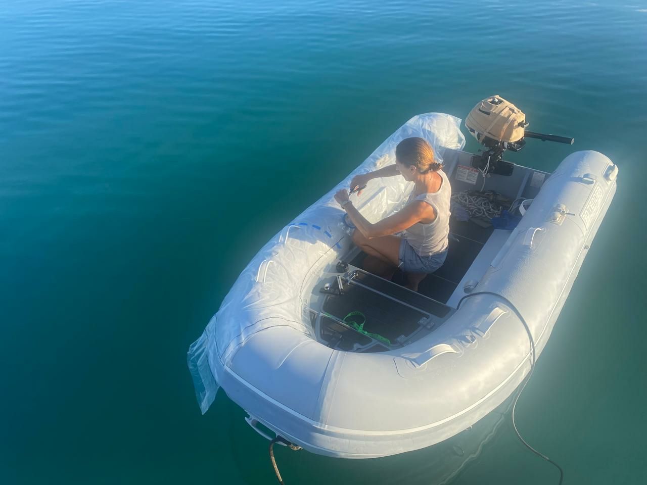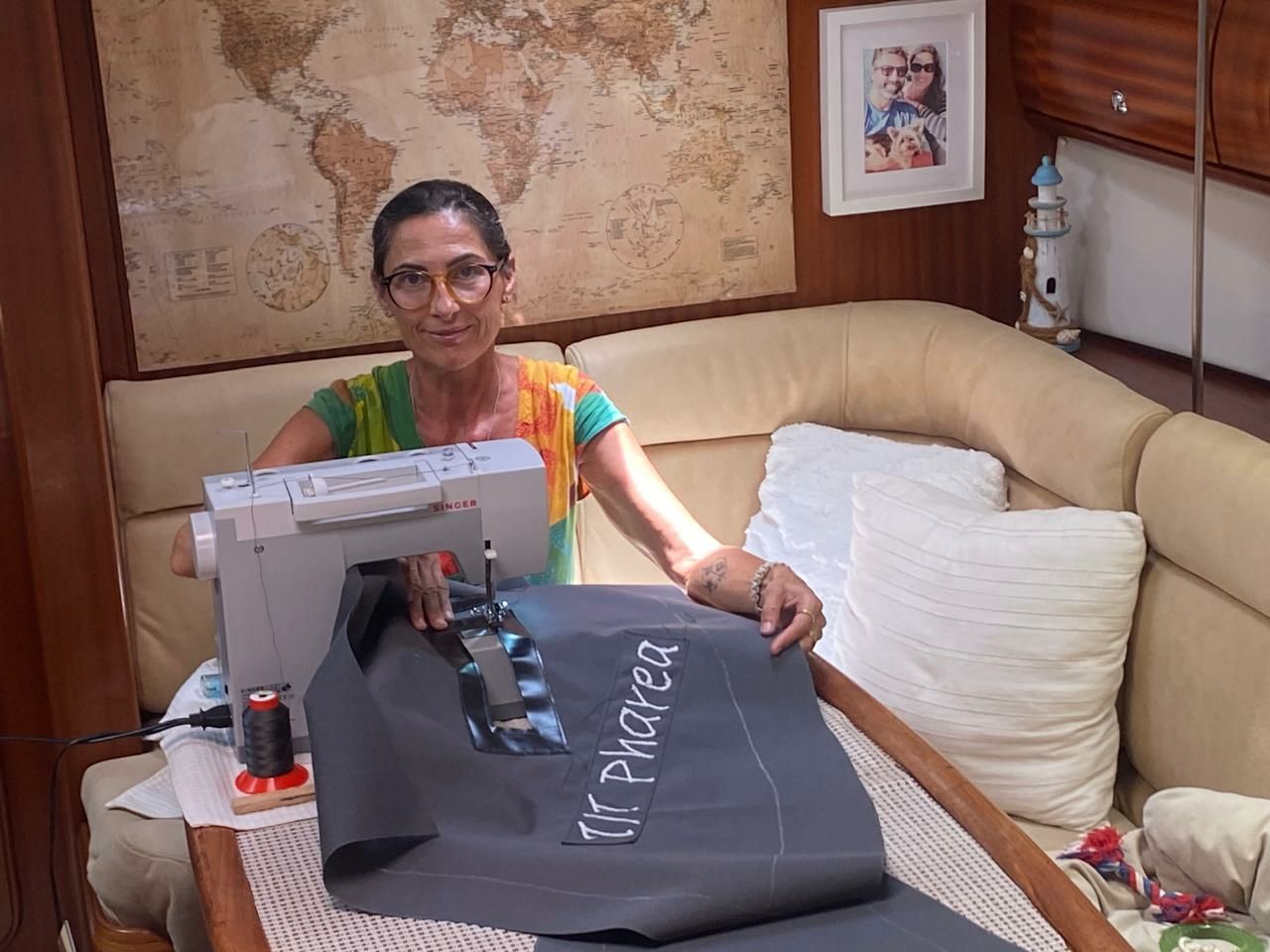 Aqui, como a baía era mais calma, decidimos comprar o material para fazer a capa do bote novo. Acordávamos mais cedo, antes do vento, para baixar o bote da targa e fazer o molde com material plástico, confesso que não foi fácil, mas enfim com o molde feito, usamos uma mesa do parque para cortar o tecido e poder iniciar a costura.