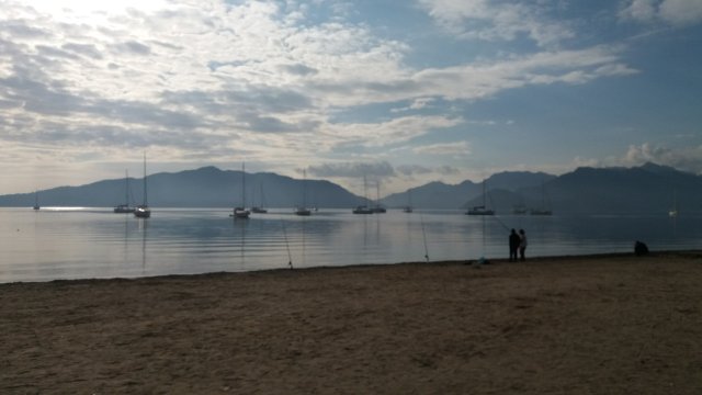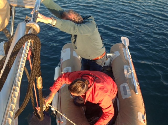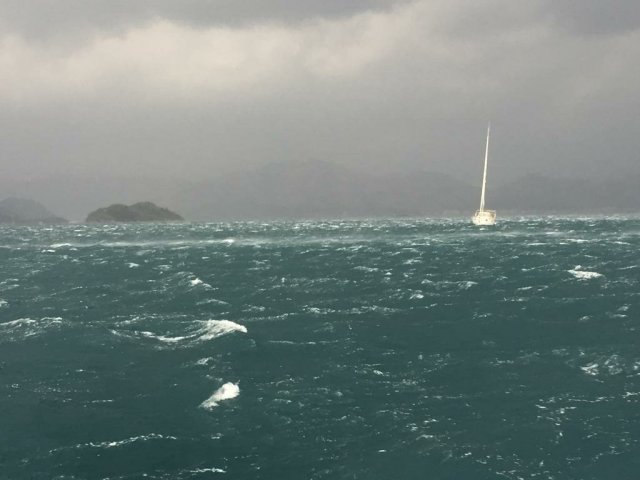 Logo chegou o Imagine 2 e depois o Tartuga e ao final estávamos em oito barcos ancorados e presos de popa. Na baia ao lado onde passeamos com o bote também havia mais oito barcos. Com certeza todos eles saíram da baia em frente a cidade e como nós, vieram se proteger aqui. Todos super preparados para o vento previsto, mas felizmente desta vez ele acabou perdendo força no caminho e não chegou.