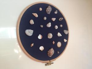 E das conchinhas que encontrei, juntando com outras que já tinha, fiz dois quadrinhos para decorar o barco, usando bastidores, tecido e cola e “voilà”…