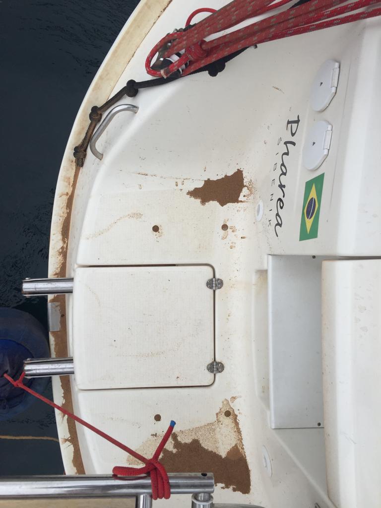 Pela manhã o barco estava coberto por muito pó trazido pelo vento, tanto que se acumulava pelo convés todo, o Renato lavou duas vezes e ainda se via pó acumulado.