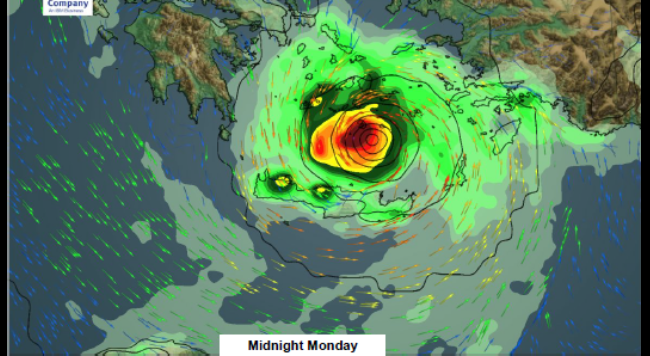 No mostrador rajadas de quase 100km/h quando estávamos na marina, muito balanço e barulho dos estais e cabos… mas o centro não se deu aqui… fomos acompanhando as notícias e vimos que causou grandes estragos na região do Peloponneso, de onde vimos vídeos de embarcações indo ao fundo após bater no pier levado pelas fortes ondas causadas pelo ciclone, outros jogados na Praia, outros subindo no píer com as ondas e também a inundação da beira mar de várias cidades das ilhas do Arquipélago.